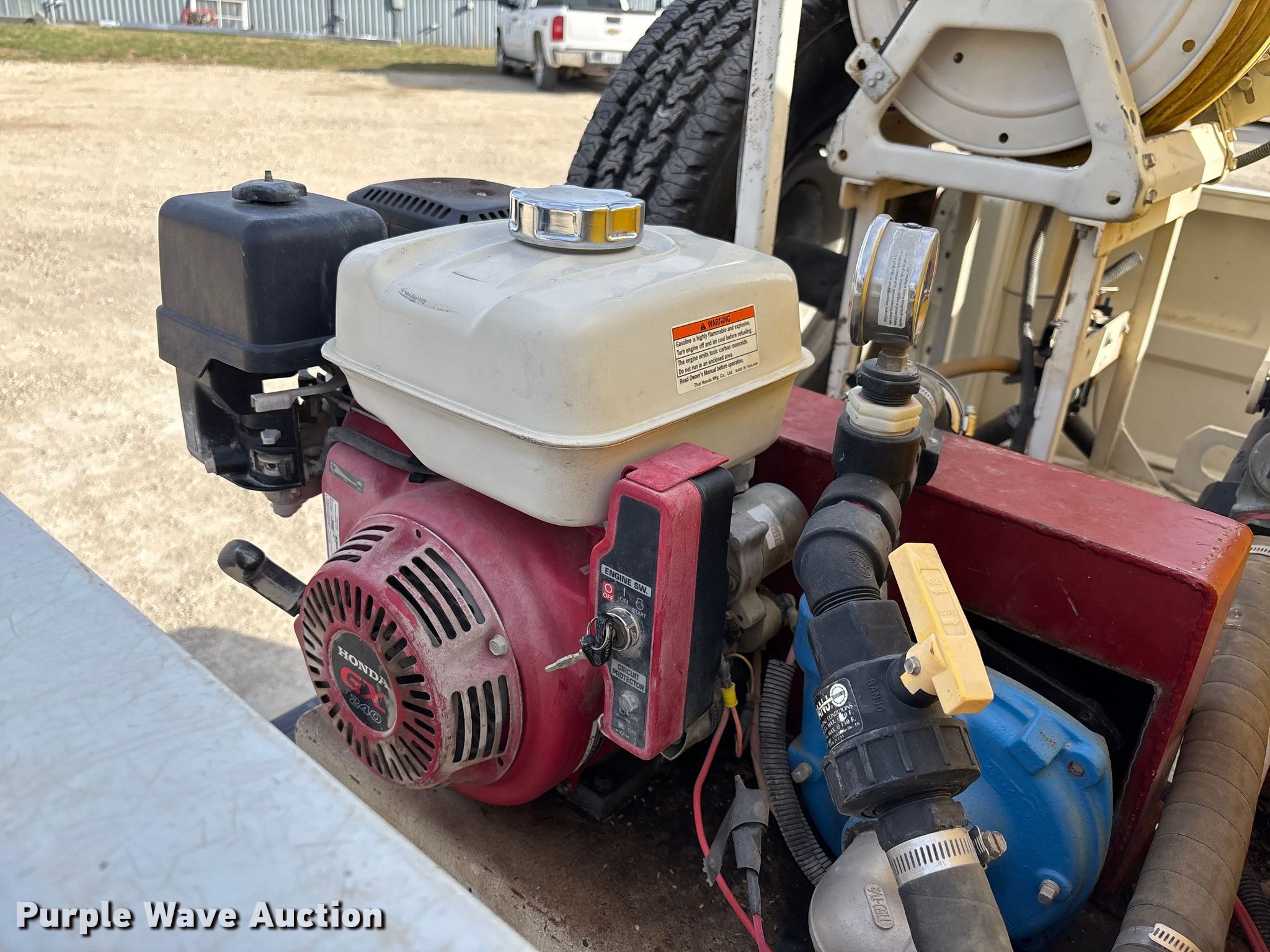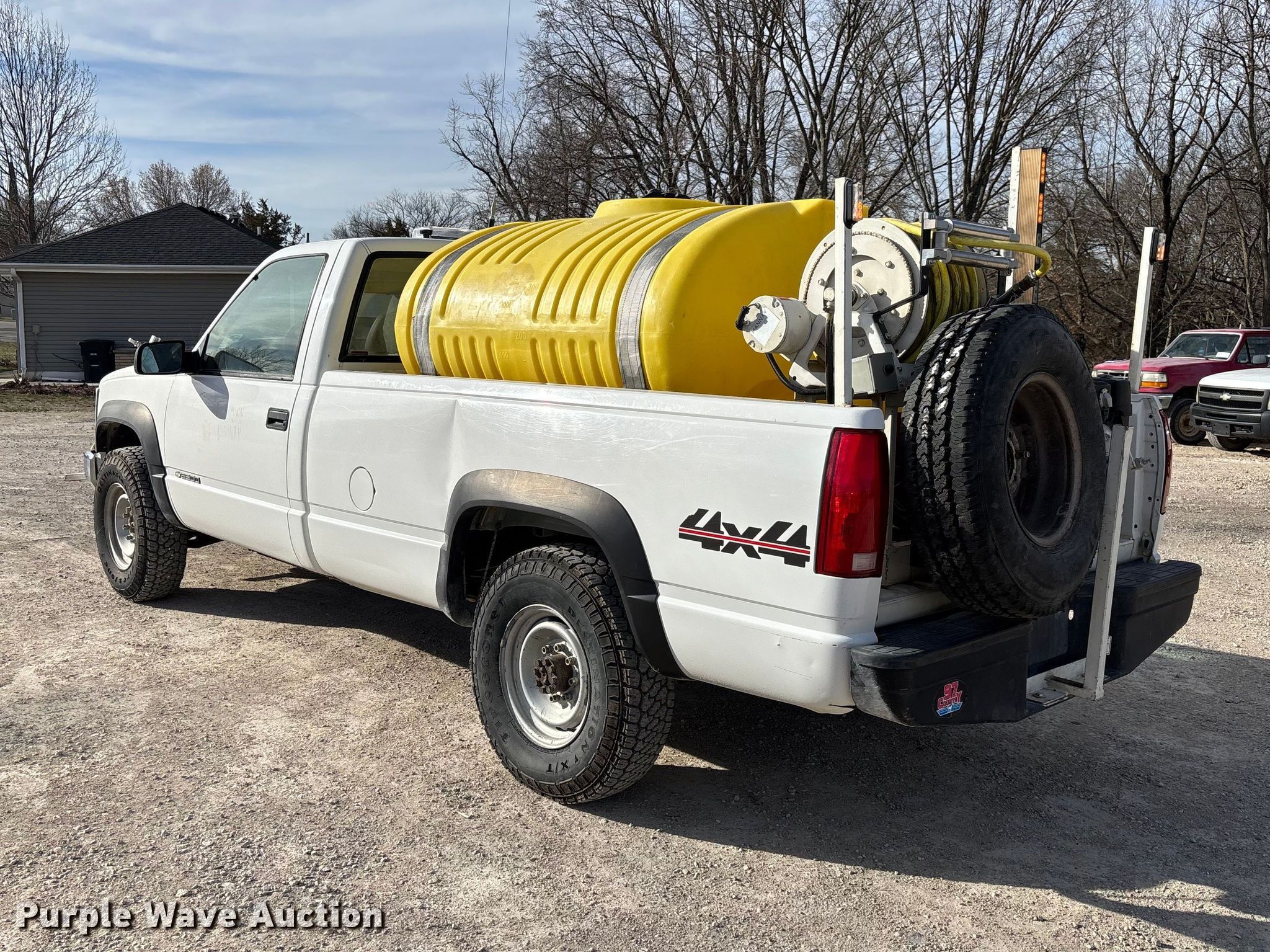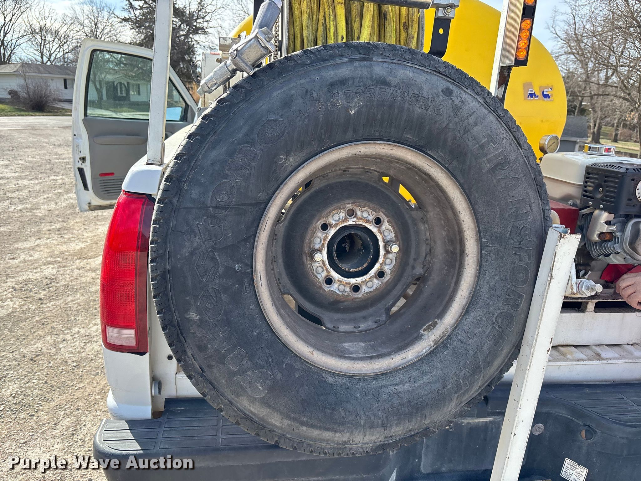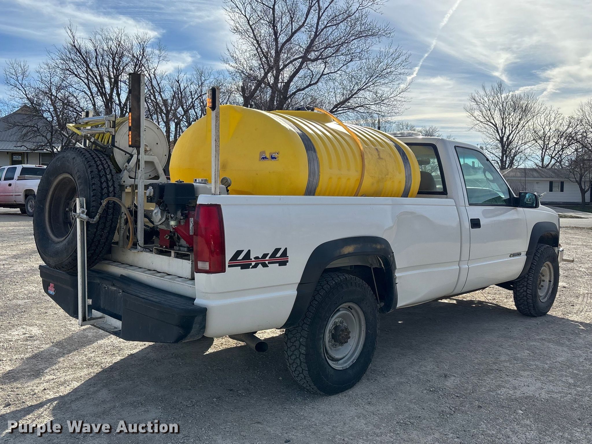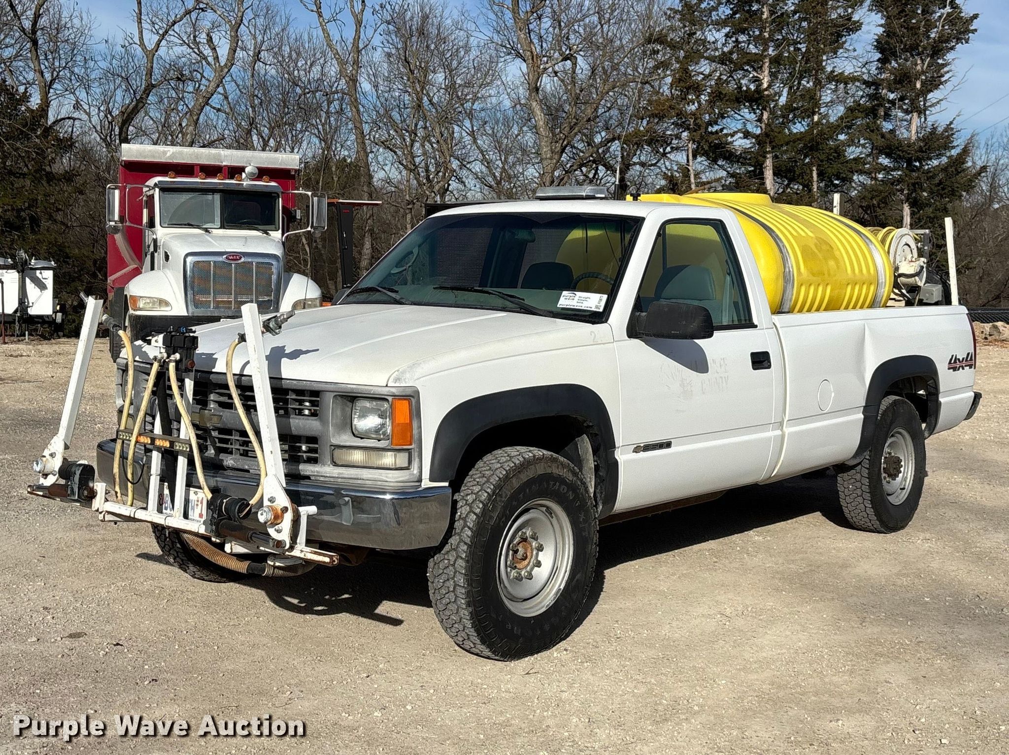 1999 Chevrolet K3500 pickup truck. Miles: 77,202 on odometer, VIN: 1GCHK34R4XF063648. Engine Displacement: 5.7L, Fuel type: Gas. Transmission Automatic, Four wheel drive. Interior AC, Heat, Cruise control. Features Poly tank Capacity: 400 gallons Electric hose reel Hose, Nozzle.. Honda GX240 engine Fuel type: Gas. Spray boom Length: 9', LED lights, Strobe. Tires Size: 235/85R16. Notes Tailgate missing, Nozzle issues, need cleaned, Possible electrical issues. Kansas title. Title distribution may be delayed up to 14 days from verification of funds. Wabaunsee County Road & Bridge. Alma, KS 66401