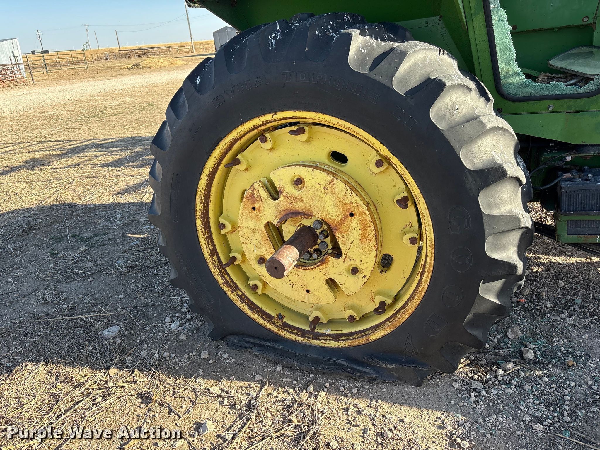 1972 John Deere 4020 tractor. Hours: 2,709 on meter, Serial: 261563R. Engine John Deere 6404DR-01, Serial: 311954R, Cylinders: 6, Fuel type: Diesel. Transmission Synchro, 8F - 2R, Differential lock. Features PTO: 540, Loader Bucket Width: 72".. Tires Front: 10.0-16, Rear: 16.9-38, Wheel weights: 4, Wheelbase: 104". Notes Glass cracked, Rodent damage, Coolant line issues, broken, Flat tires, Non-operational unit. Oklahoma Panhandle State University. Goodwell, OK 73939