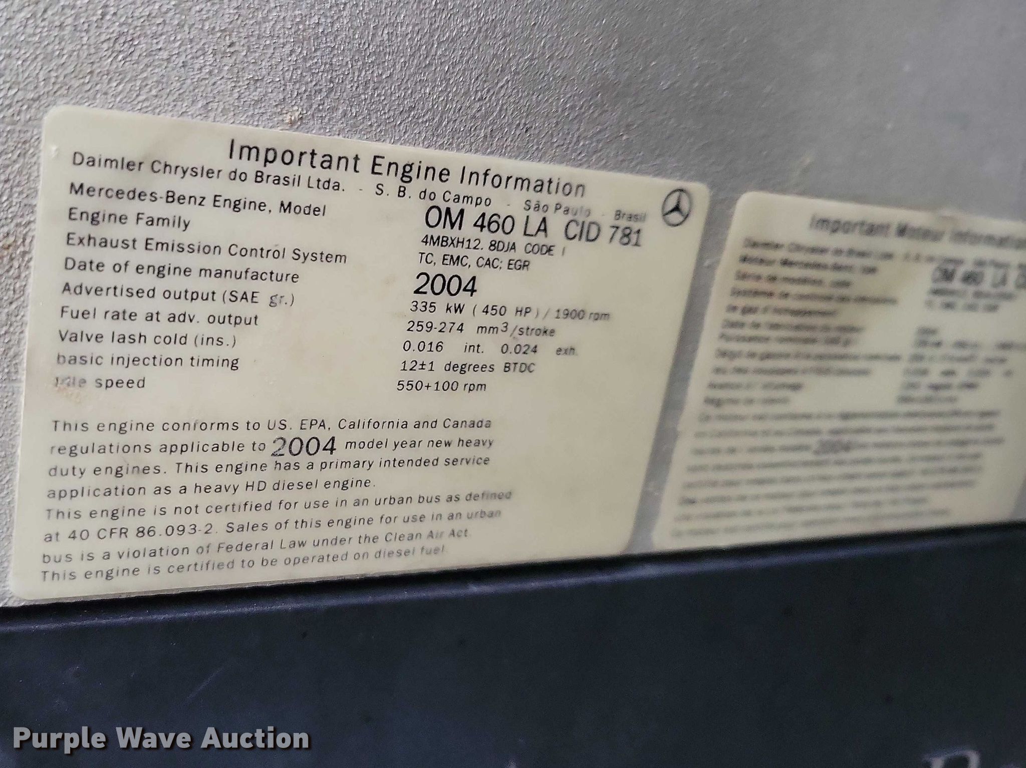 2005 Sterling 9500 semi truck. Miles: 407,186 on odometer, Hours: 14,482 on meter, VIN: 2FWJA3CV15AU89949. Engine Mercedes-Benz OM460LA, Displacement: 781 C.I.D., Cylinders: 6, Fuel type: Diesel, HP: 450, kW: 335, Engine brake. Transmission Eaton Fuller Roadranger, Manual, Speed: 10. Chassis Axles: Tandem, Differential lock: Inter-axle, Suspension: Air Dump valves, Brakes: Air, GVWR: 52,000 lbs FAWR: 12,000 lbs, IAWR: 20,000 lbs, RAWR: 20,000 lbs. Interior AC, Heat, Heated mirrors, Cruise control. Features Deck plate: Aluminum, Fifth wheel type: Air operated, Sliding, Fuel tank: Dual. Tires Size: 11R22.5. Iowa title. Seller is a government entity who will be assigning and distributing the title. Please contact the seller for distribution questions. Title distribution may be delayed up to 14 days from verification of funds. Waverly, IA 50677