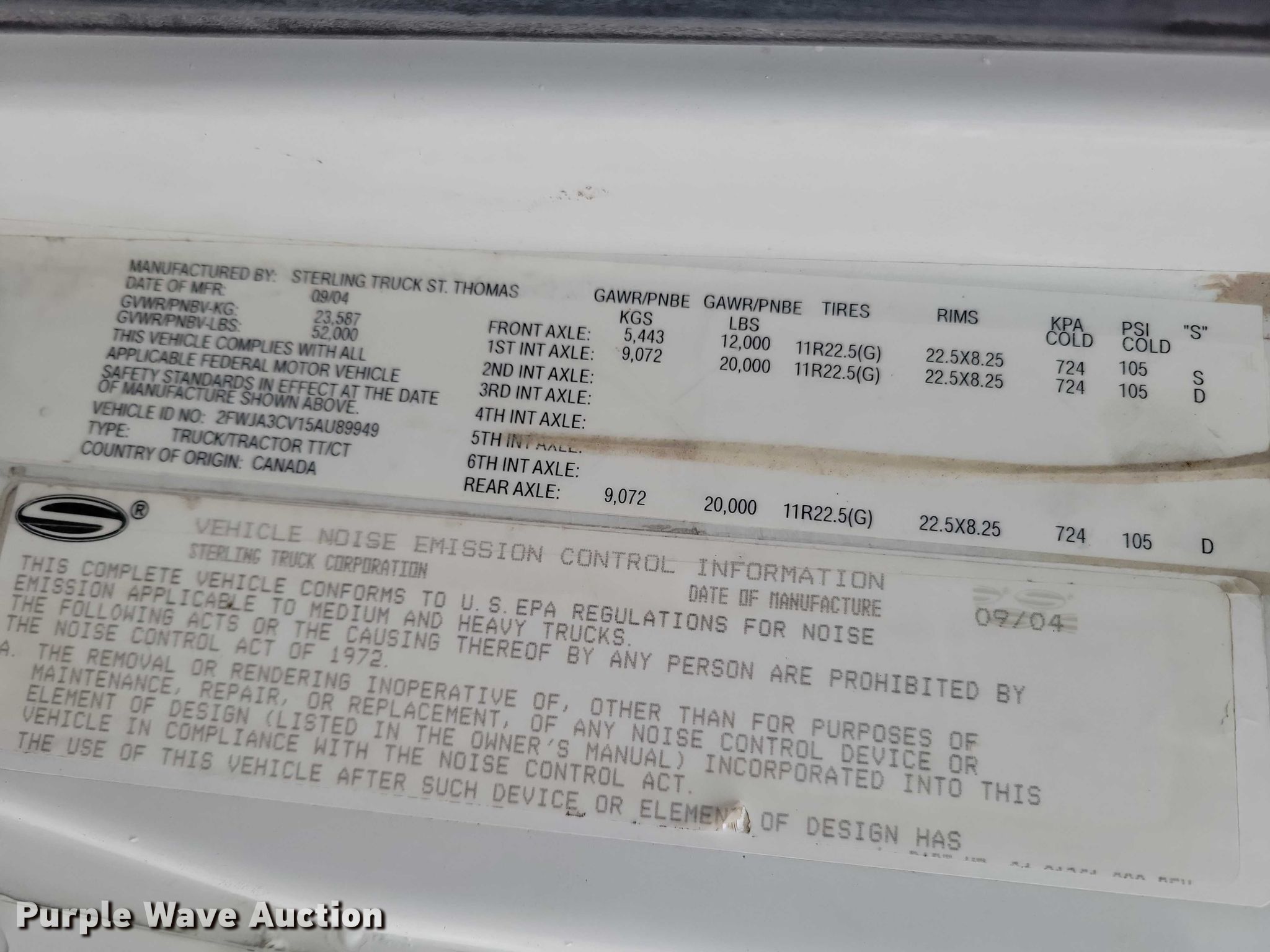 Purple Wave is selling a used Truck Tractor in Iowa. This item is a 2005 Sterling 9500 semi truck with the following: Miles: 407,186 on odometer, Hours: 14,482 on meter, VIN: 2FWJA3CV15AU89949