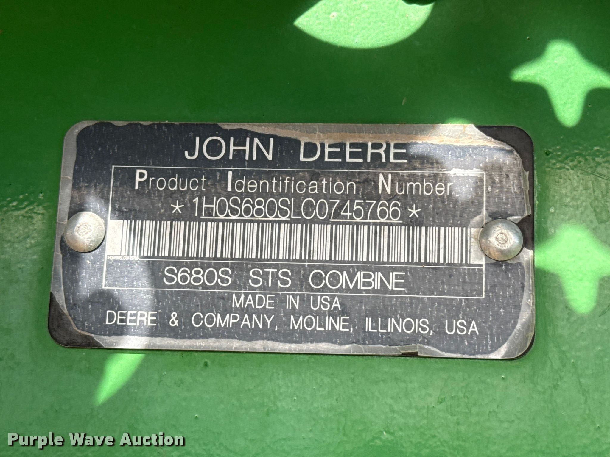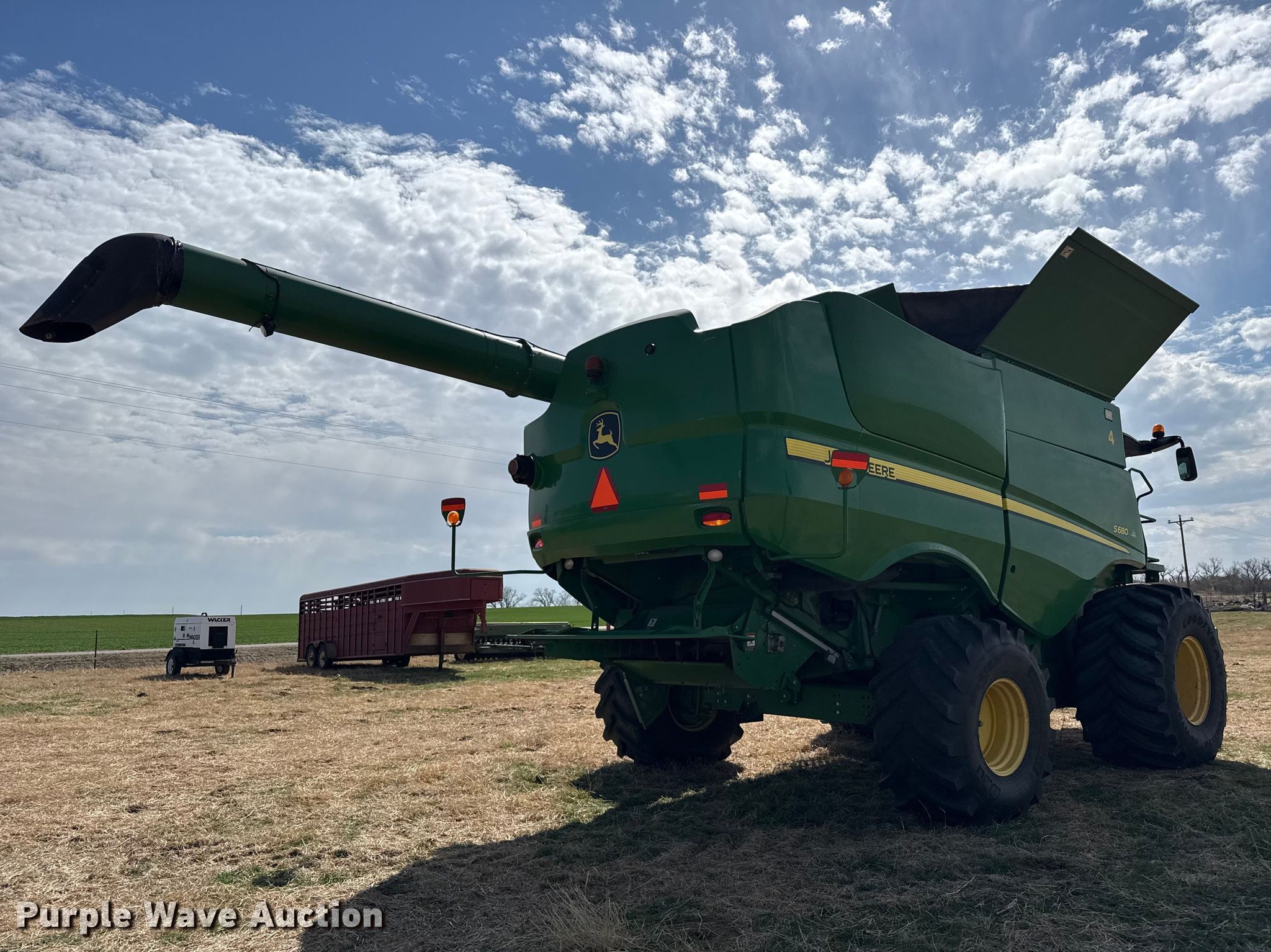 Purple Wave is selling a used Combine in Oklahoma. This item is a 2012 John Deere S680 combine with the following: Engine hours: 3,614 on meter, Separator hours: 2,320 on meter, Serial: 1H0S680SLC0745766, Unit #: 4