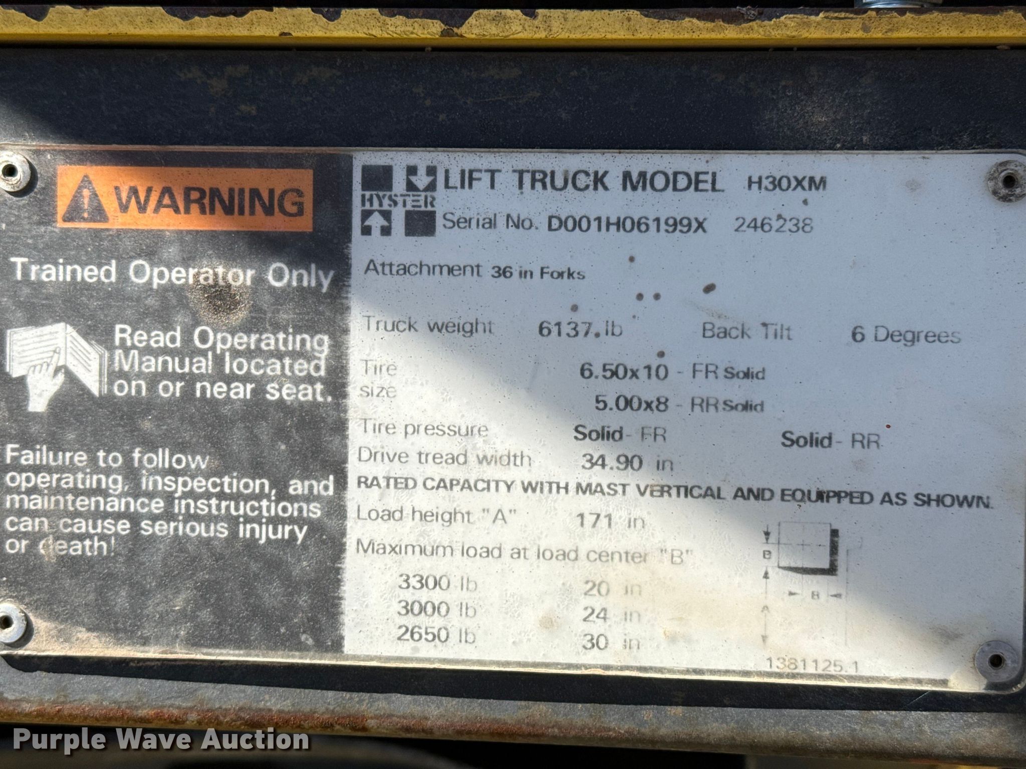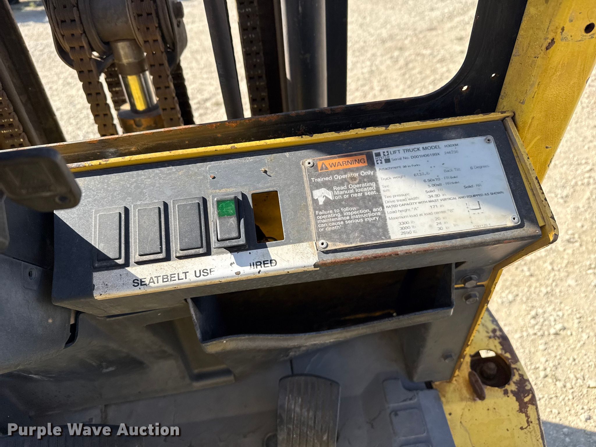 Purple Wave is selling a used Warehouse Forklift in Kansas. This item is a Hyster H30XM forklift with the following: Hours: 24,235 on meter, Serial: D001H06199X