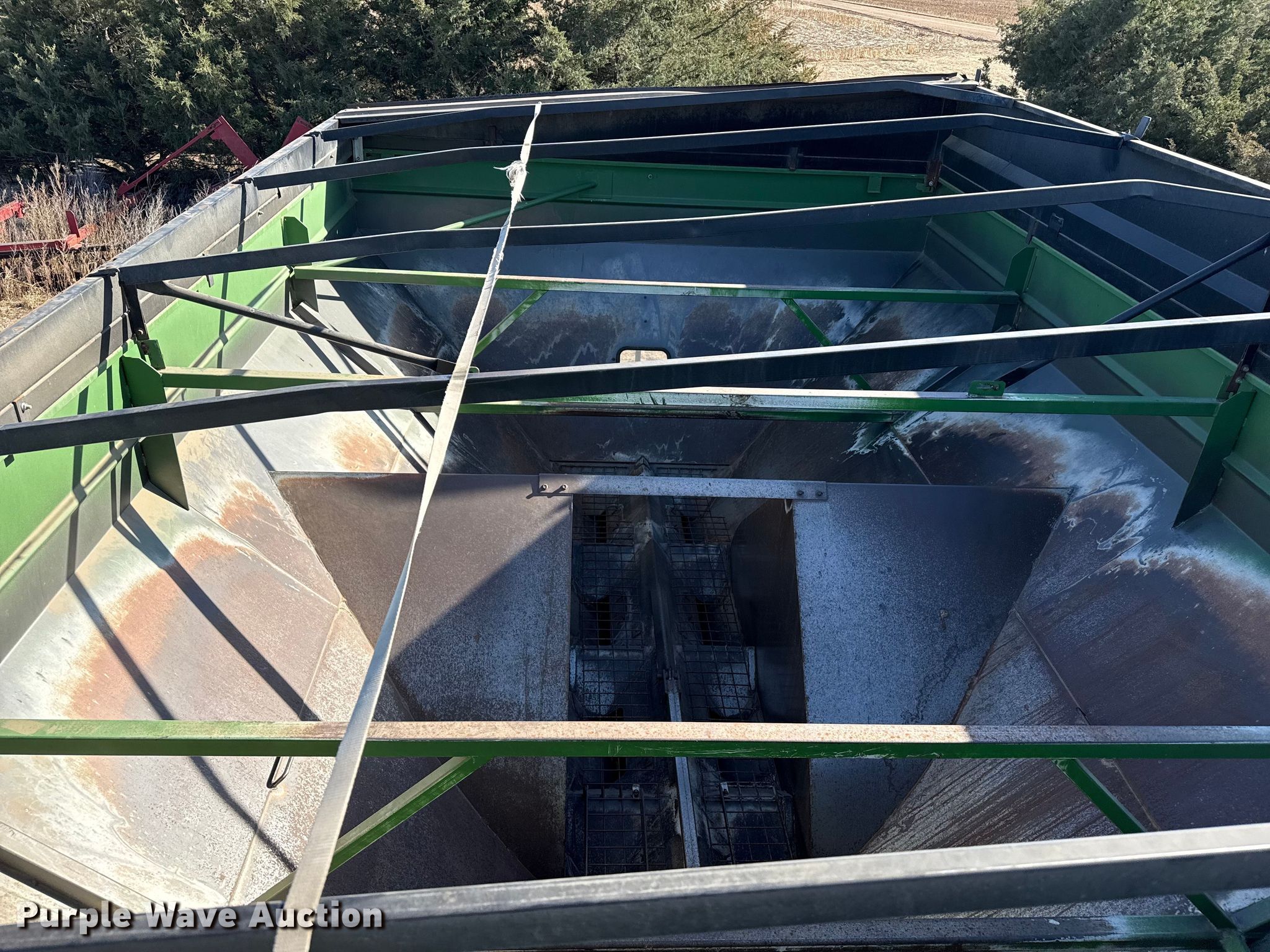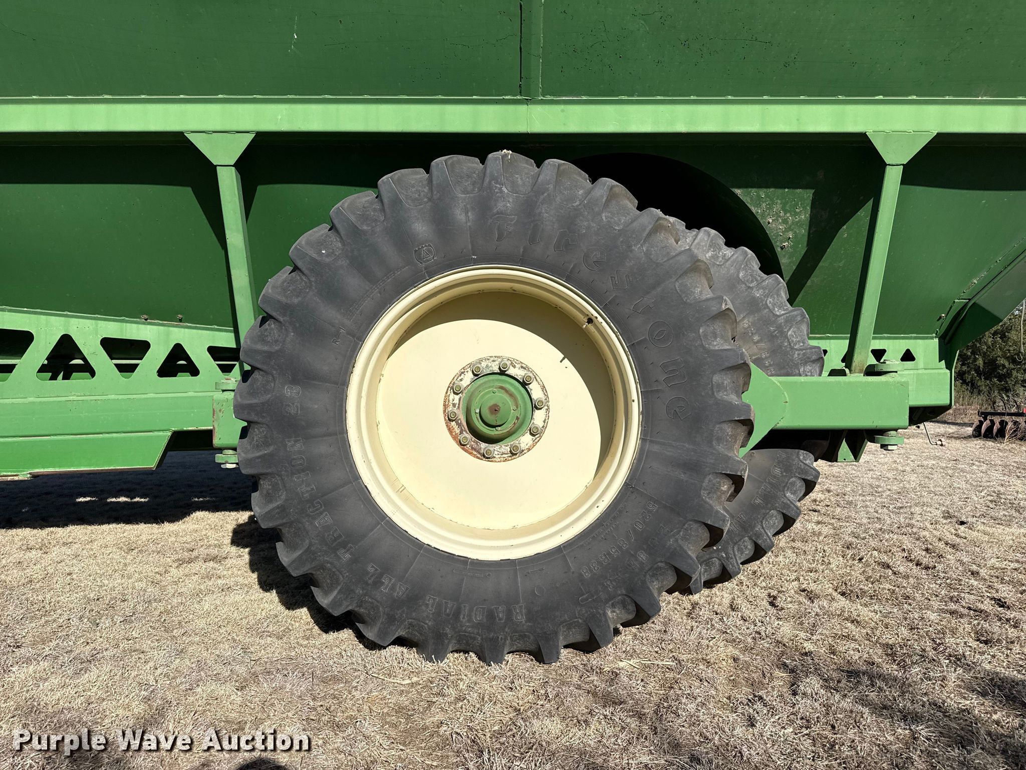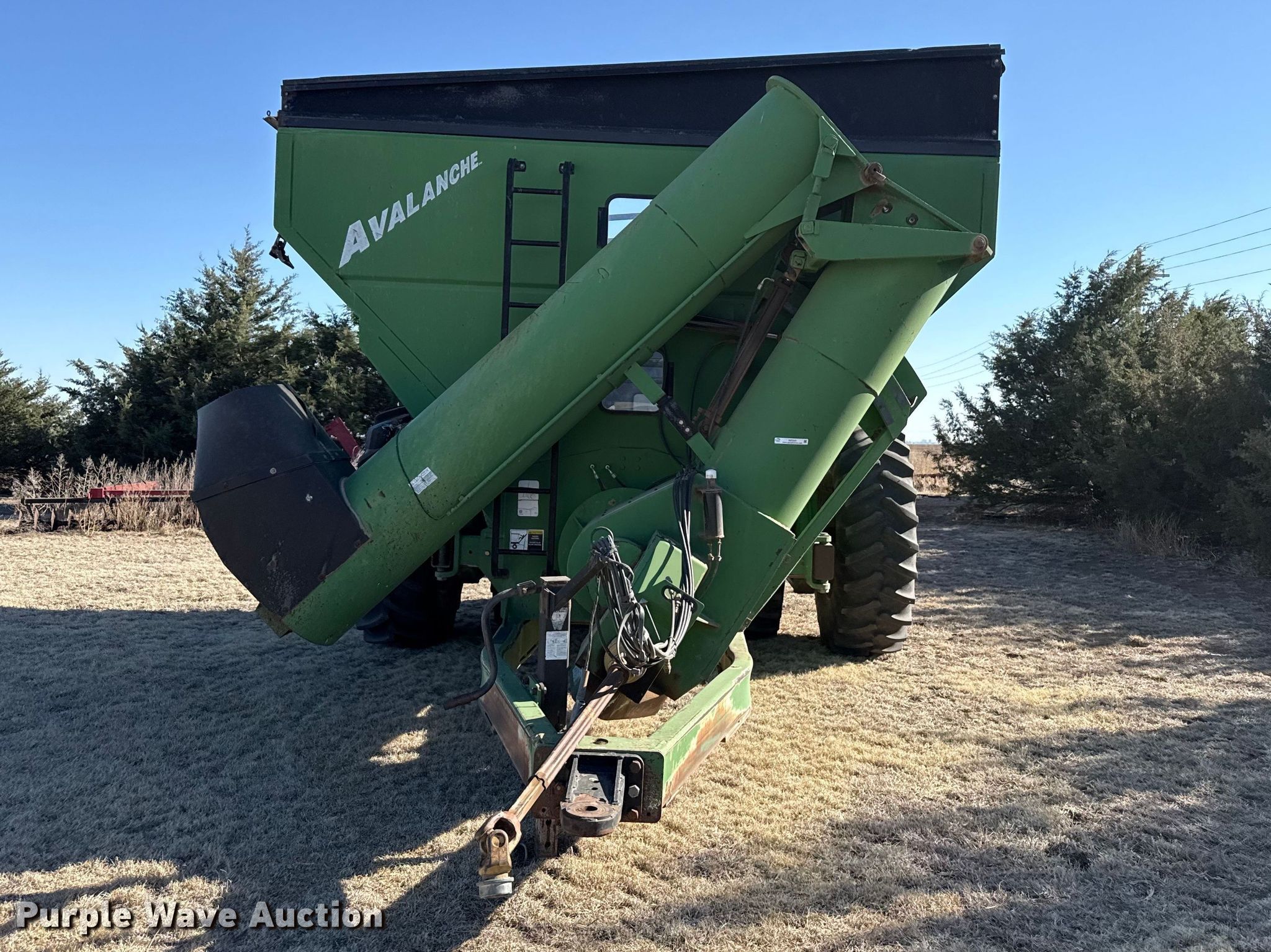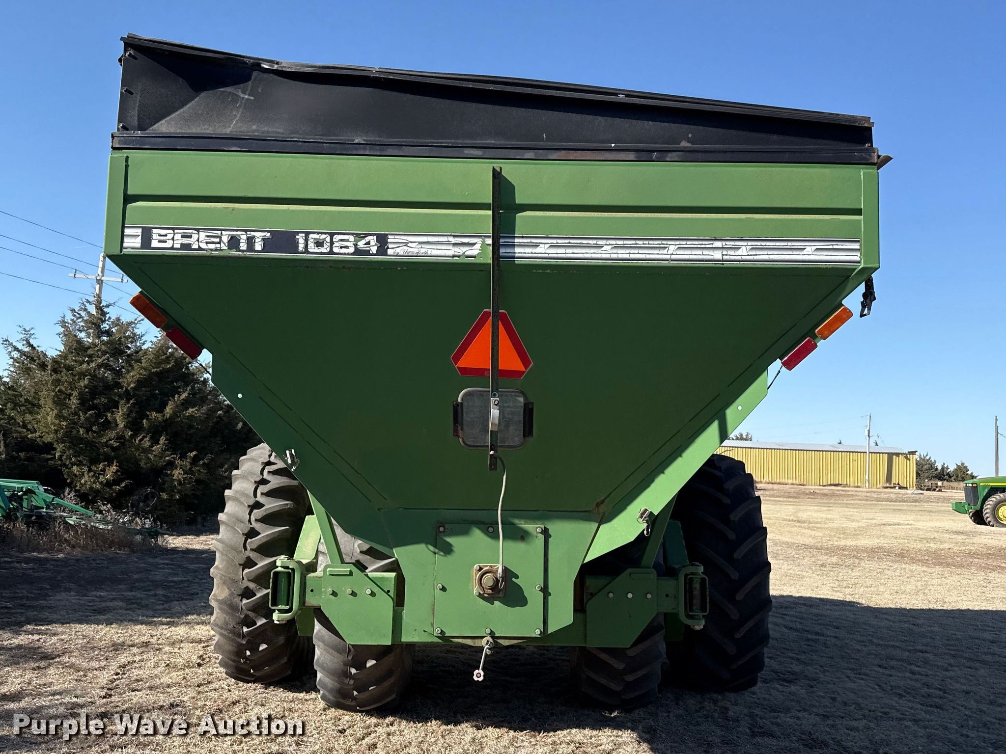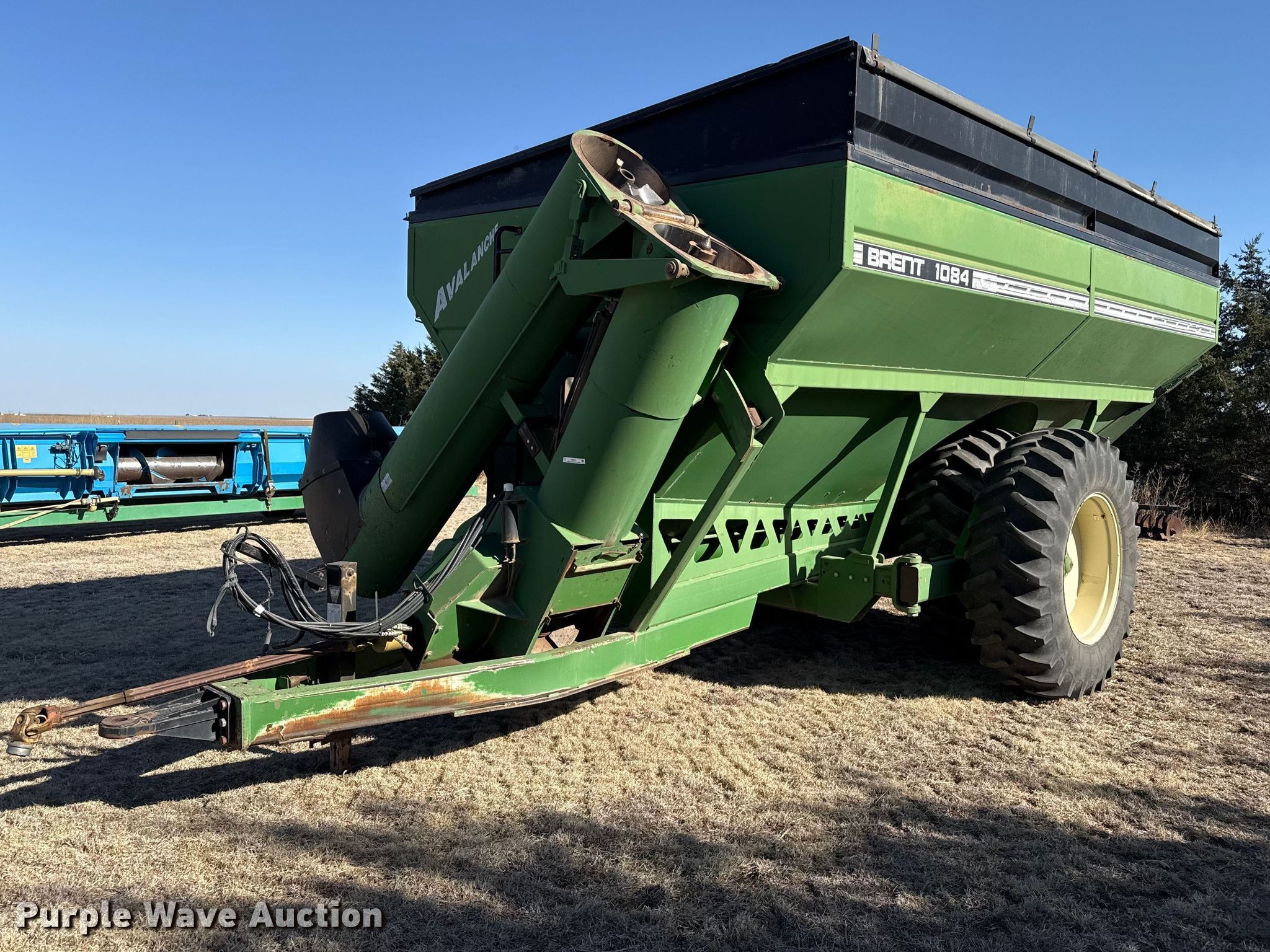 Purple Wave is selling a used Grain Cart or Gravity Wagon in Kansas. This item is a Brent 1084 Avalanche grain cart with the following: Capacity: 1,000 bushels, Auger diameter: 20", Shut-off gate: Hydraulic, Sight glass, PTO: 1 3/4" 1000