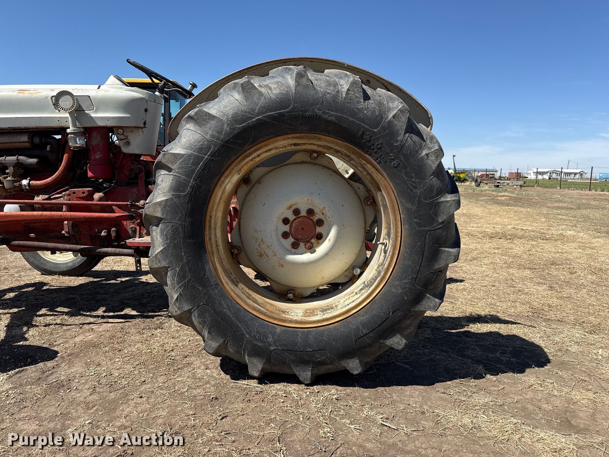 1955 Ford 850 tractor. Hours: Unknown, Serial: 25561. Engine Cylinders: 4, Fuel type: Gas. Transmission Manual, 5F - 1R. Features PTO: 540, Three point. Tires Front: 5.50-16SL, Rear: 13.6-28. Notes Hours meter illegible. Plains, KS 67869