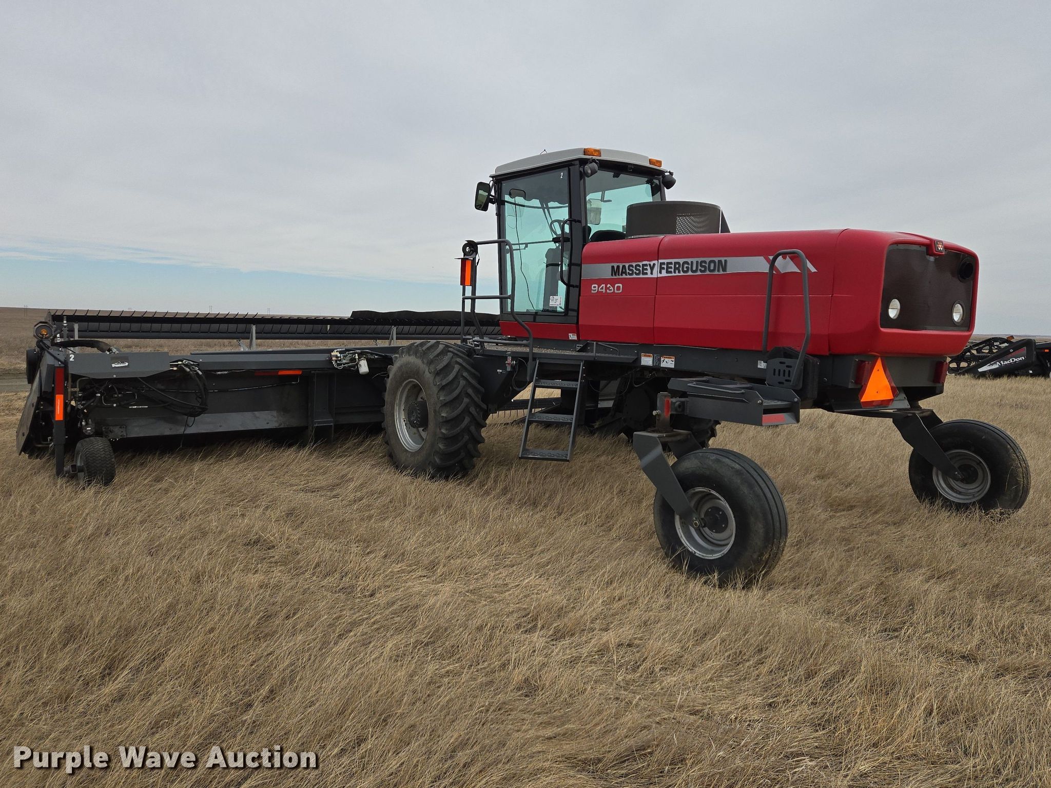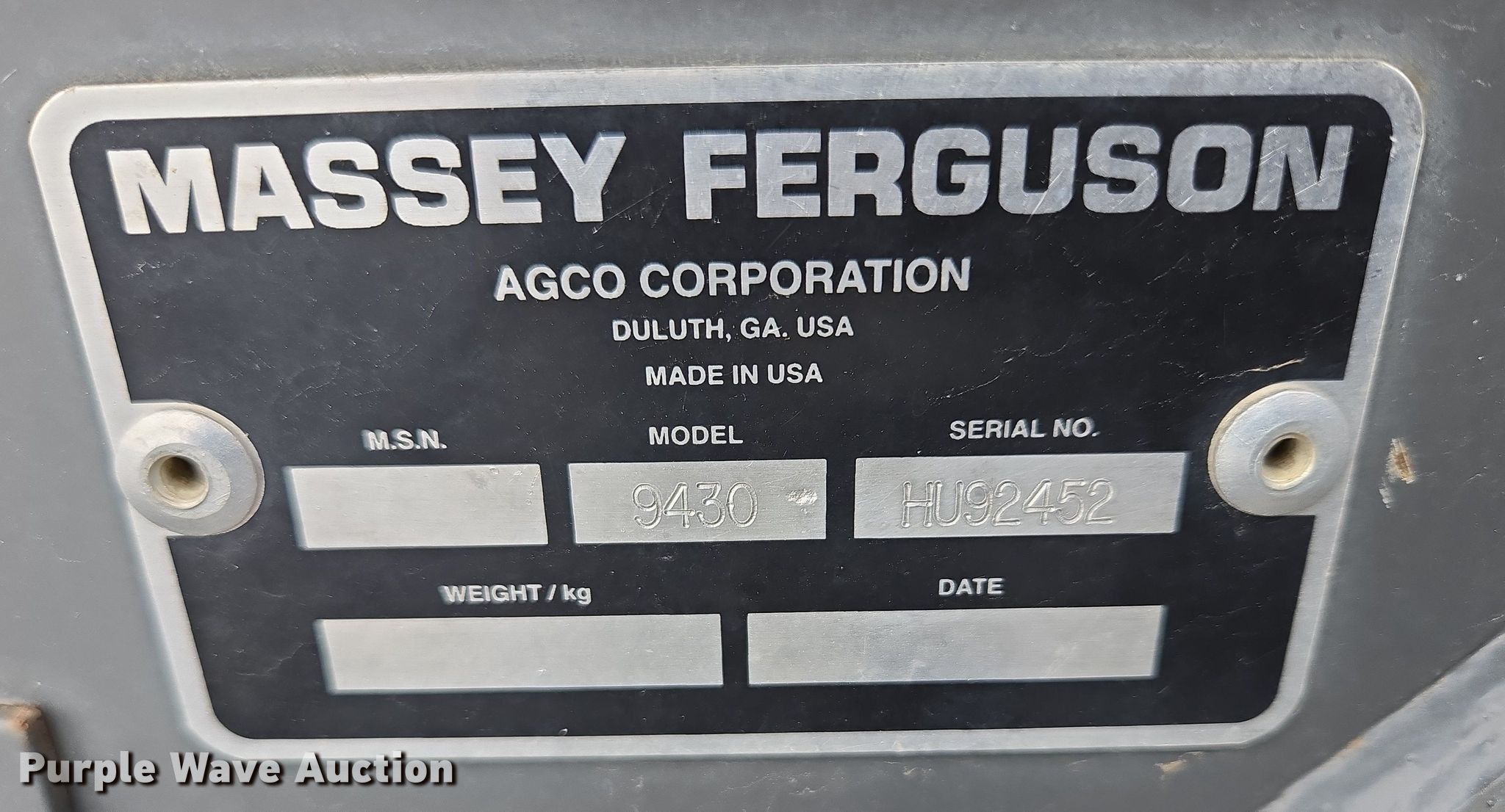 Take a look at this used 2009 Masey Ferguson 9430 swather / windrower being sold on April 15th, 2026 in the Wednesday April 15 Ag Equipment Auction made by Masey Ferguson. Take a look at all of the item information below or take a look at similar auctions for Hay Equipment.