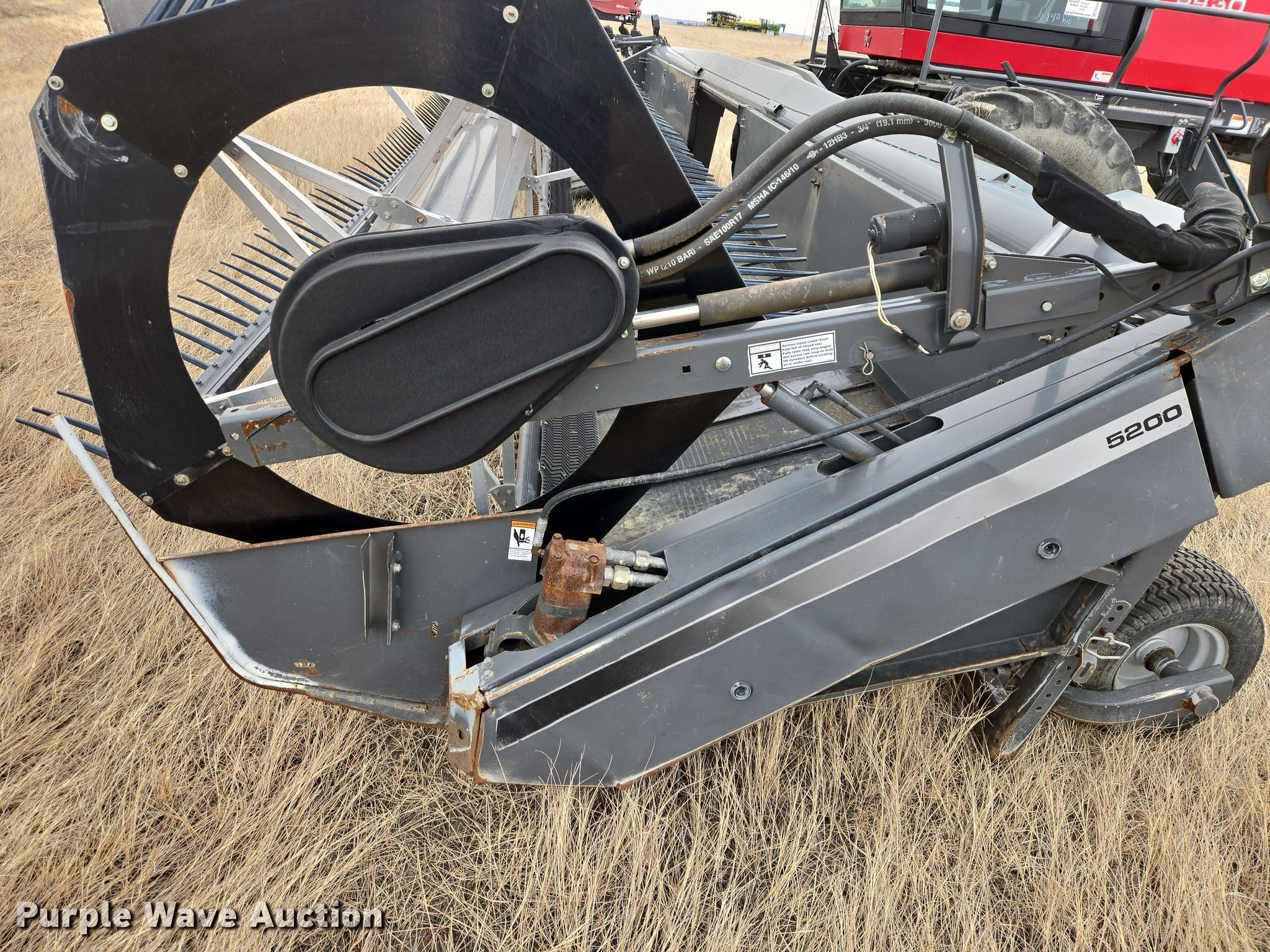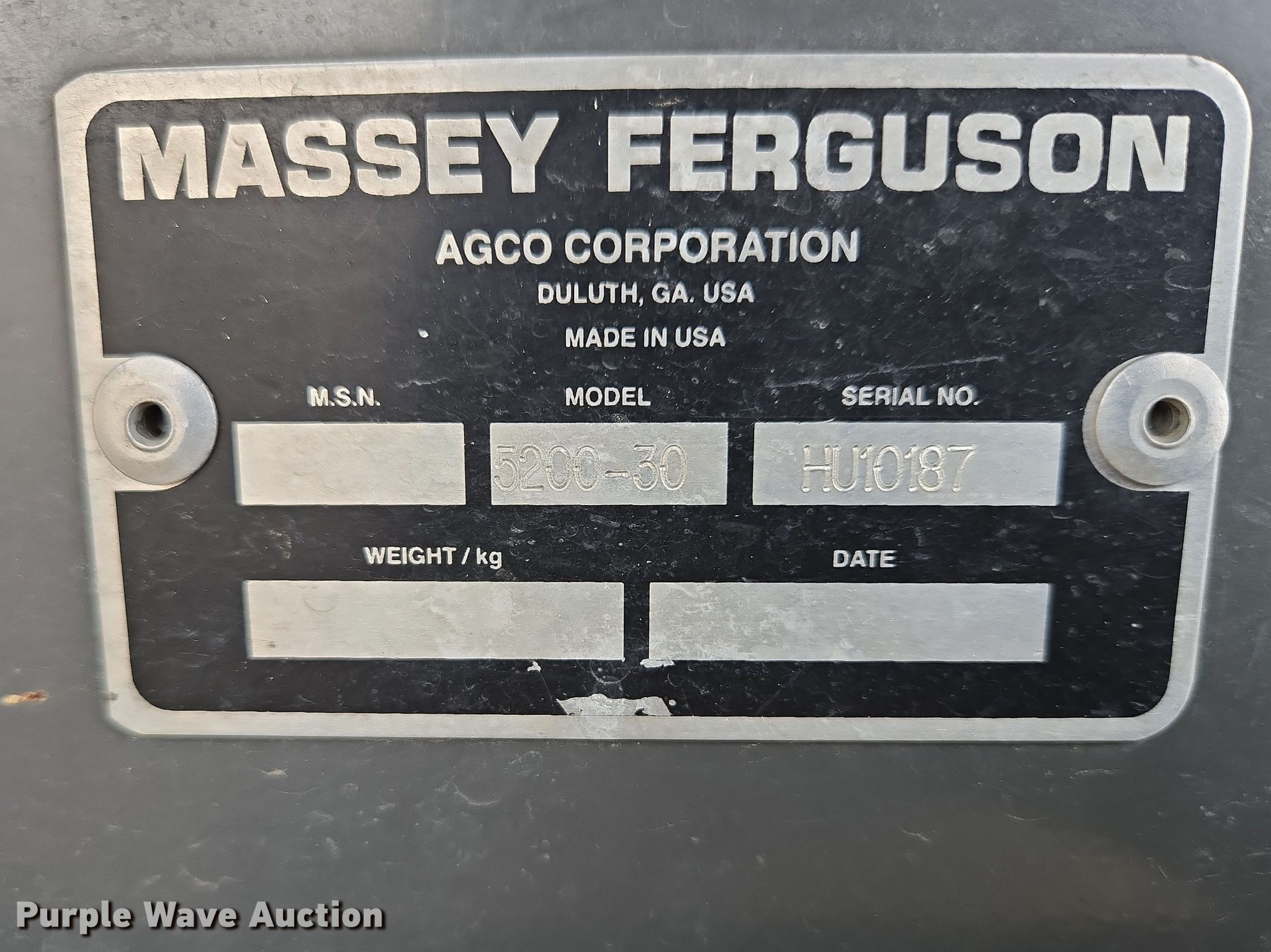 2009 Masey Ferguson 9430 swather / windrower. Engine hours: 1,748 on meter, Serial: HU92452. Engine SisuDiesel, Displacement: 4.4L, Cylinders: 4, Fuel type: Diesel. Transmission Hydrostatic, Two speed travel. Operators station AC, Heat. Features Electronics Auto steer John Deere AutoTrac Universal 300, Head Sickle, Draper Massey Ferguson 5200-30, Serial: HU10187, Width: 30' 4", Power reverser, Reel: Finger Hydraulic fore/aft, Hydraulic reel height control.. Tires Front: 18.4R26, Rear: 14L-16.1SL, Header: 20x10.00-10. Notes Hydraulic issues, leak, Non-operational right side header drive. Gunsmoke Farms. Fort Pierre, SD 57532