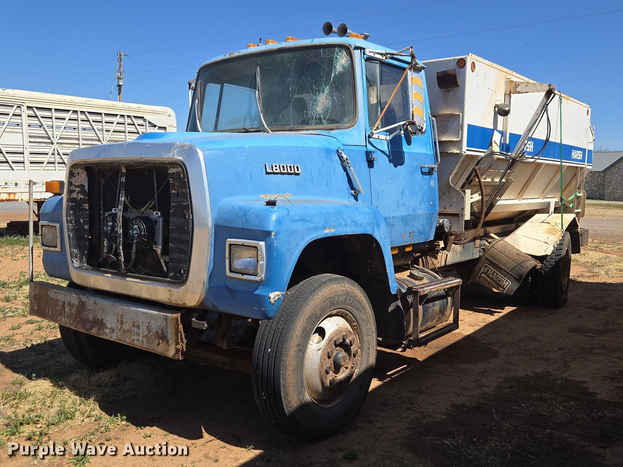 1987 Ford LN8000 feed mixer truck. Miles: 104,075 on odometer, VIN: 1FDXR80U6HVA66035, Insurance Claim #: 5-816873. Engine Caterpillar 3208, Displacement: 10.4L, Cylinders: 8, Fuel type: Diesel. Transmission Automatic. Chassis Axles: Single, Suspension: Spring, Brakes: Air, PTO, GVWR: 30,000 lbs. Features Feed mixer bed Harsh 375H, In-cab controls, Scales Digi-Star EZ-3200, Discharge: Side, Chute: Hydraulic, Door: Hydraulic. Tires Size: 295/85R22.5. Notes Windshield chipped or cracked, Collision damage , Throttle issues, locked , Unit must be towed or hauled , Unknown operating condition. Oklahoma classic title. Title distribution may be delayed up to 14 days from verification of funds. Oklahoma Farm Bureau Insurance. Mountain Park, OK 73559