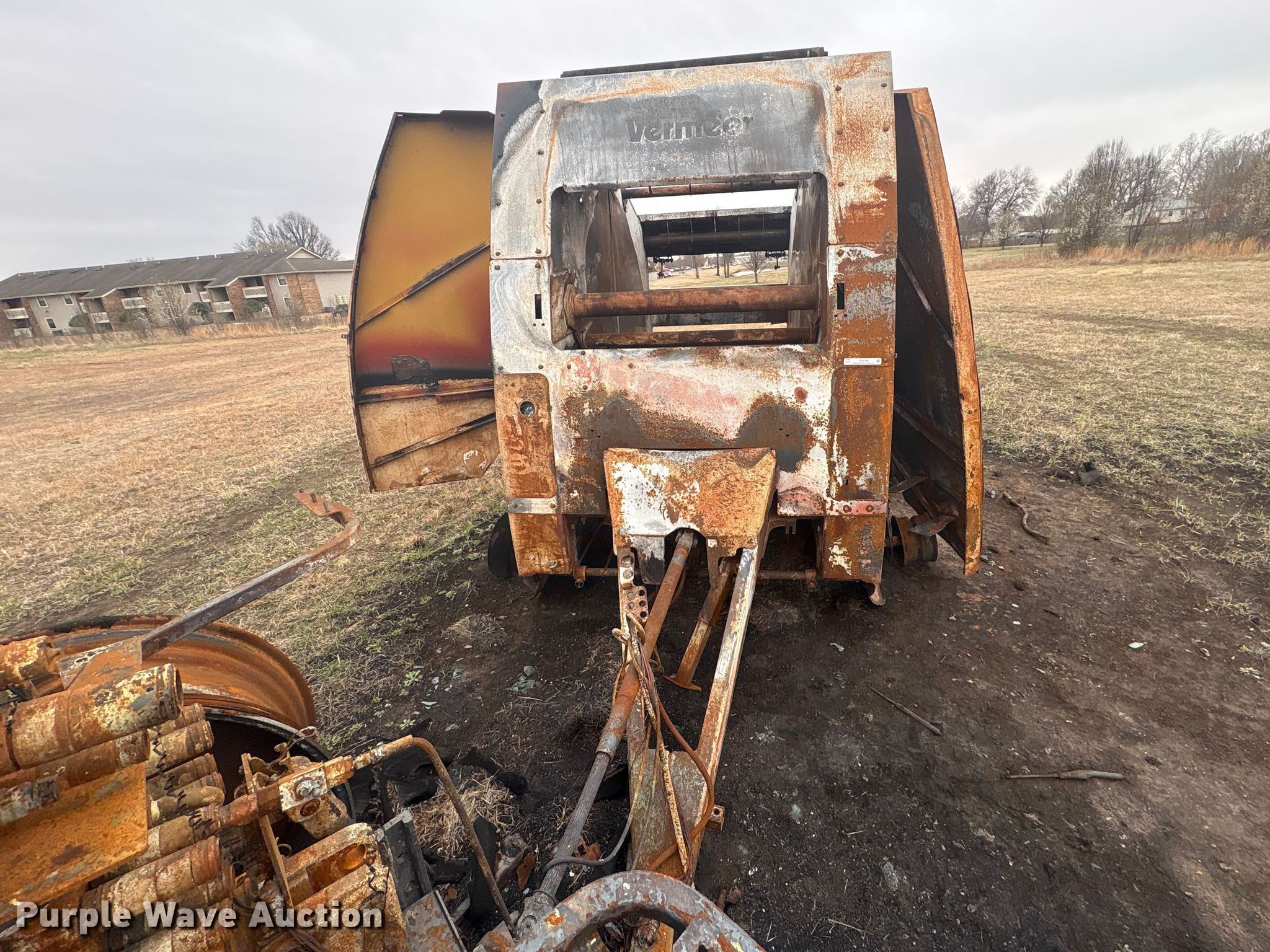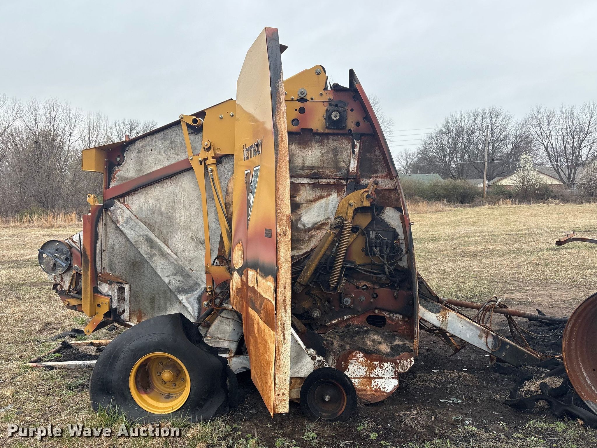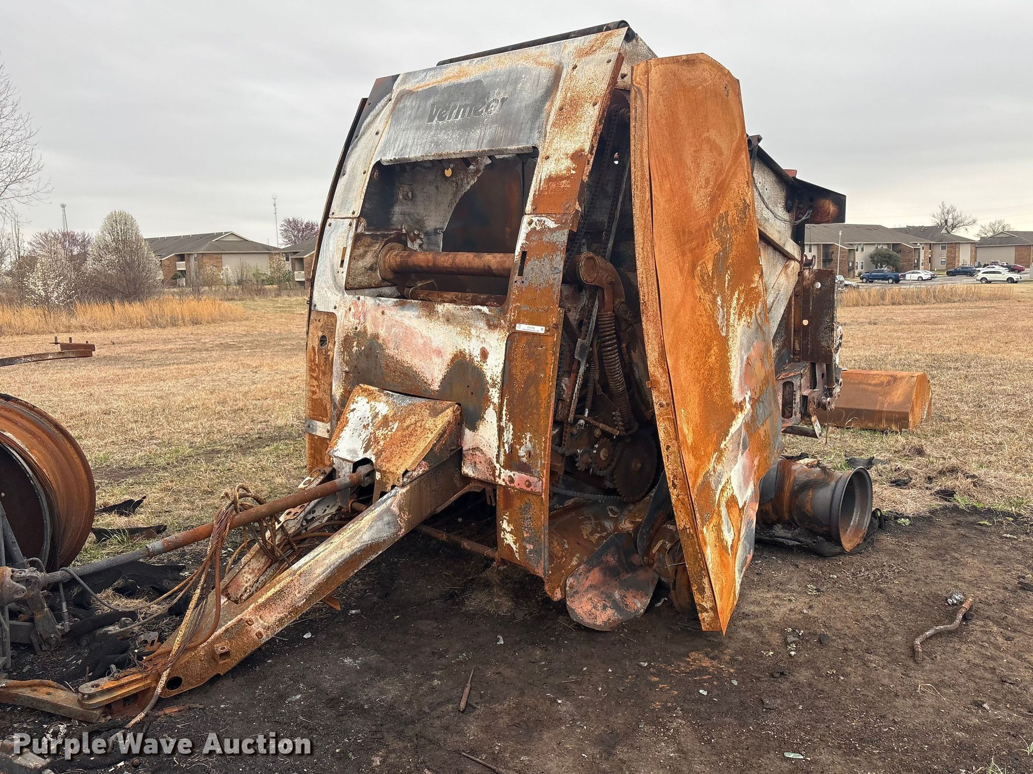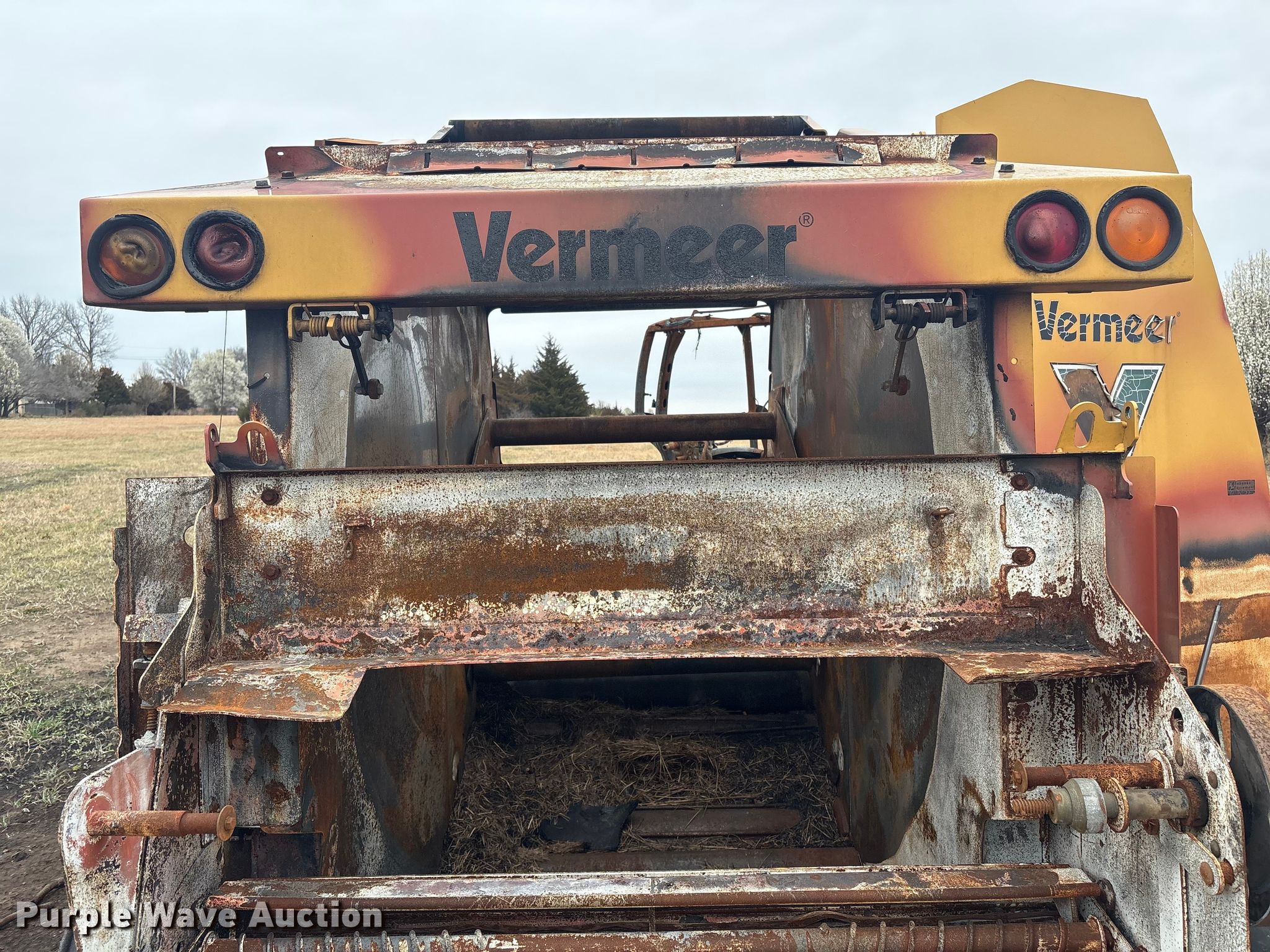 Vermeer round baler. Unit #: 5-814393. Features Gauge wheels, Pickup width: 66". Notes Burn damage, Non-operational unit. Oklahoma Farm Bureau Insurance. Bartlesville, OK 74006