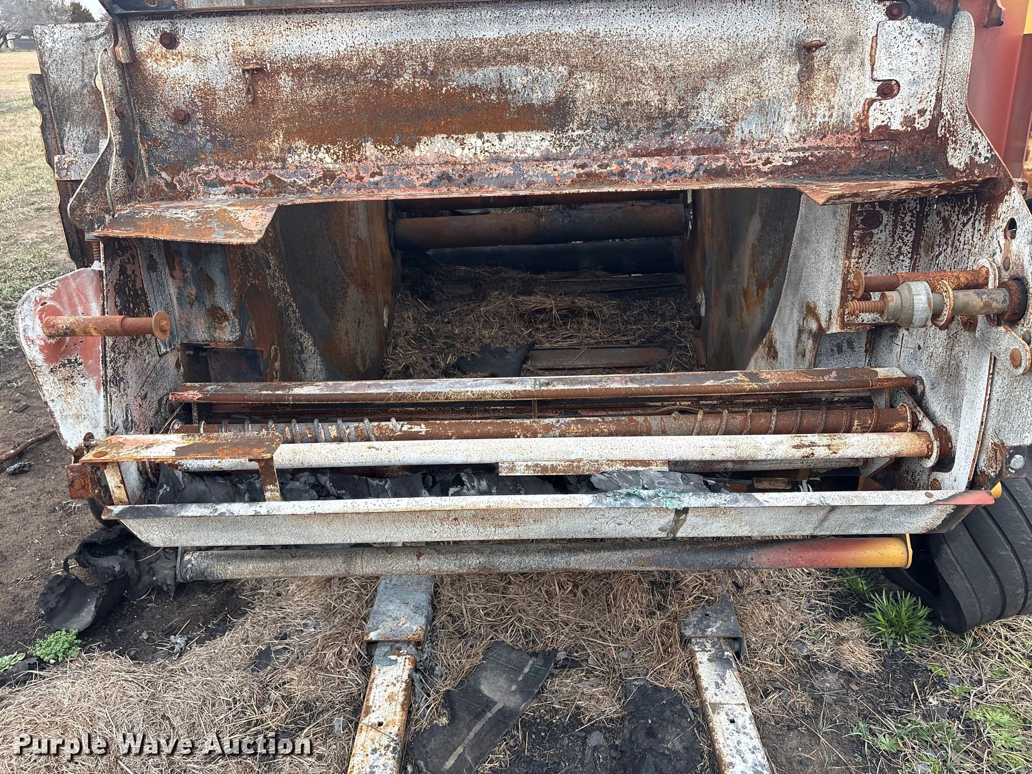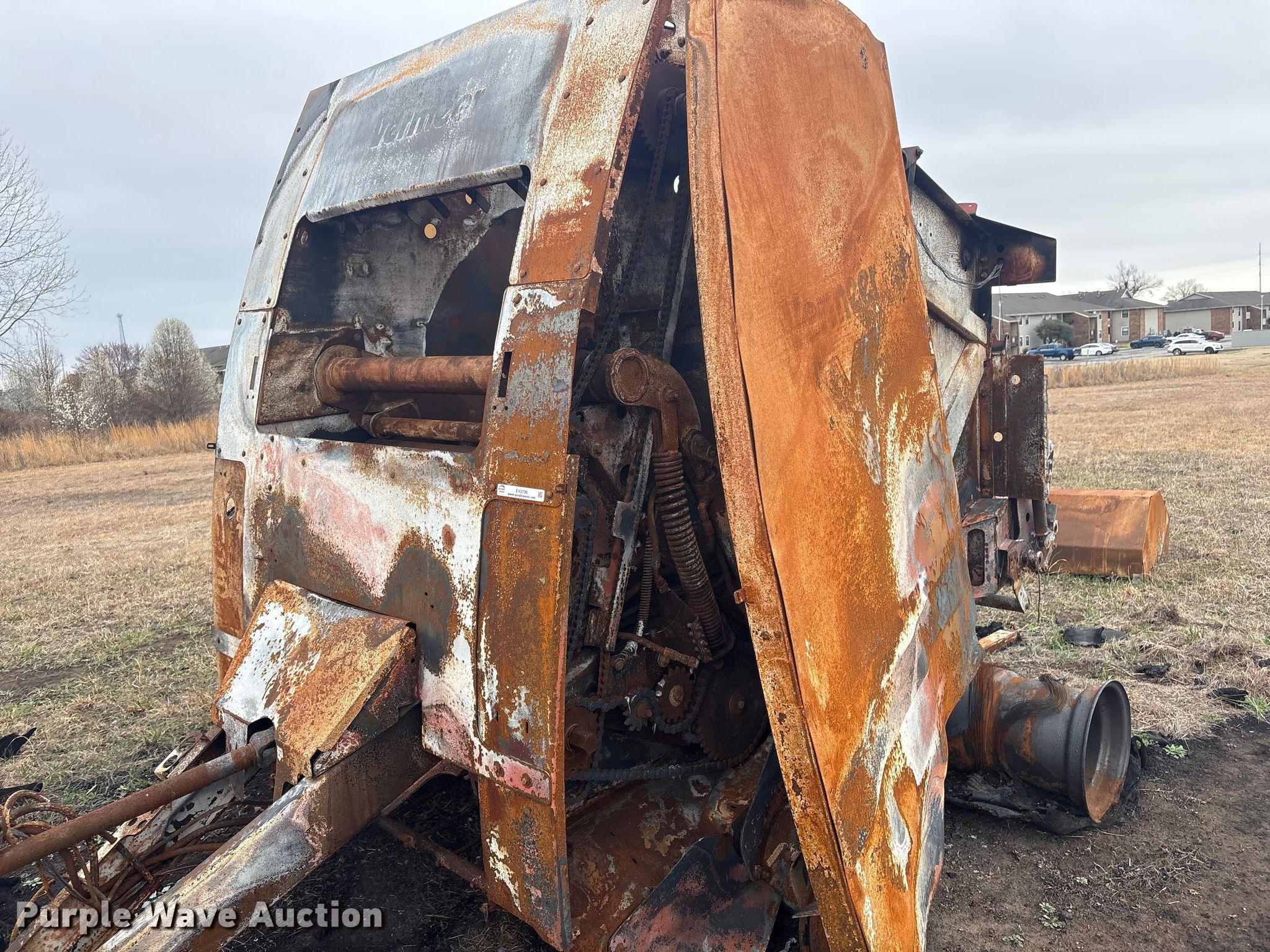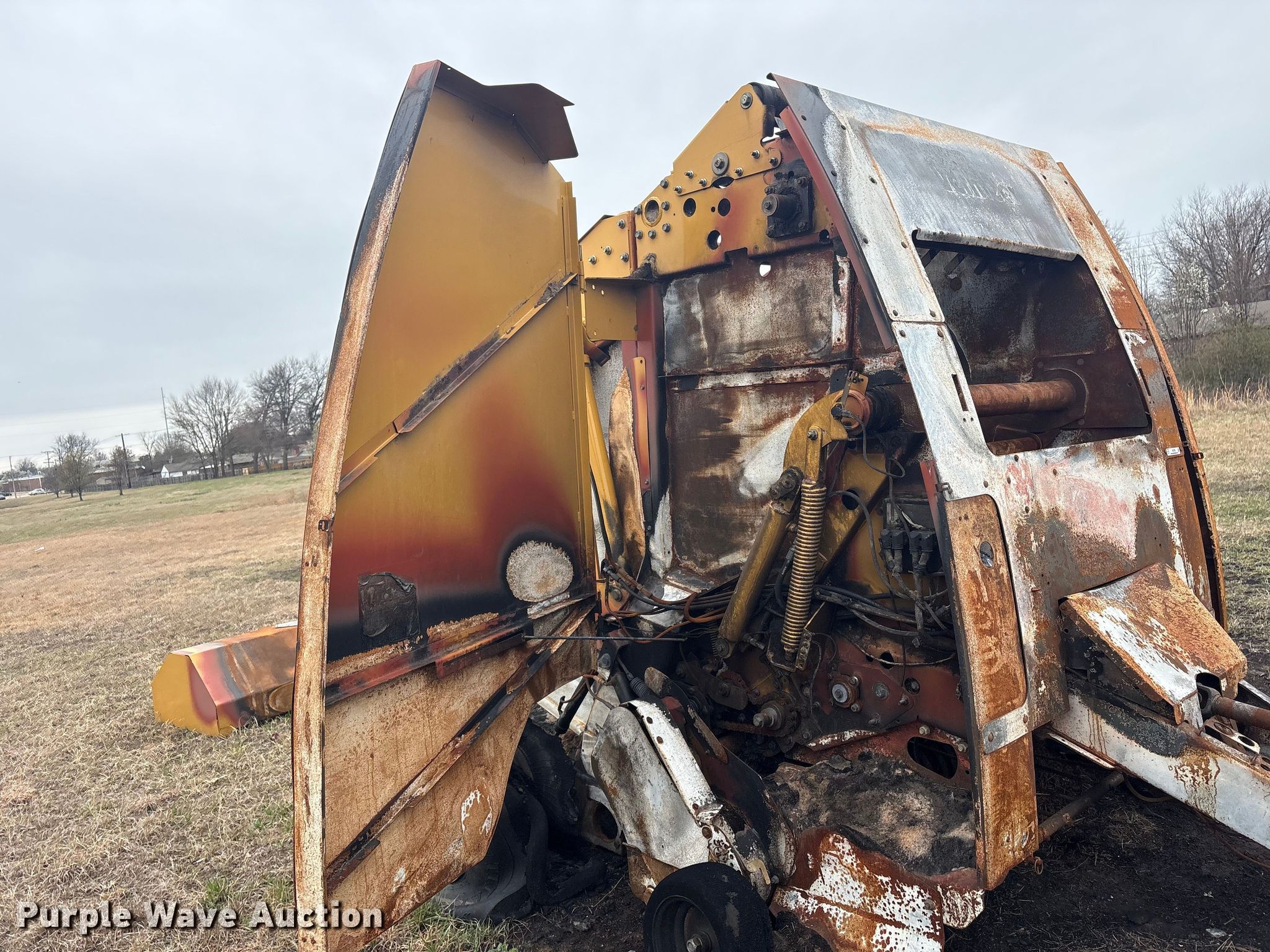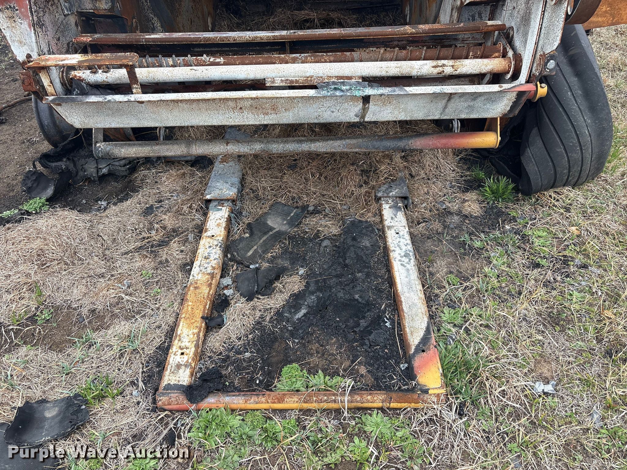 Vermeer round baler. Unit #: 5-814393. Features Gauge wheels, Pickup width: 66". Notes Burn damage, Non-operational unit. Oklahoma Farm Bureau Insurance. Bartlesville, OK 74006