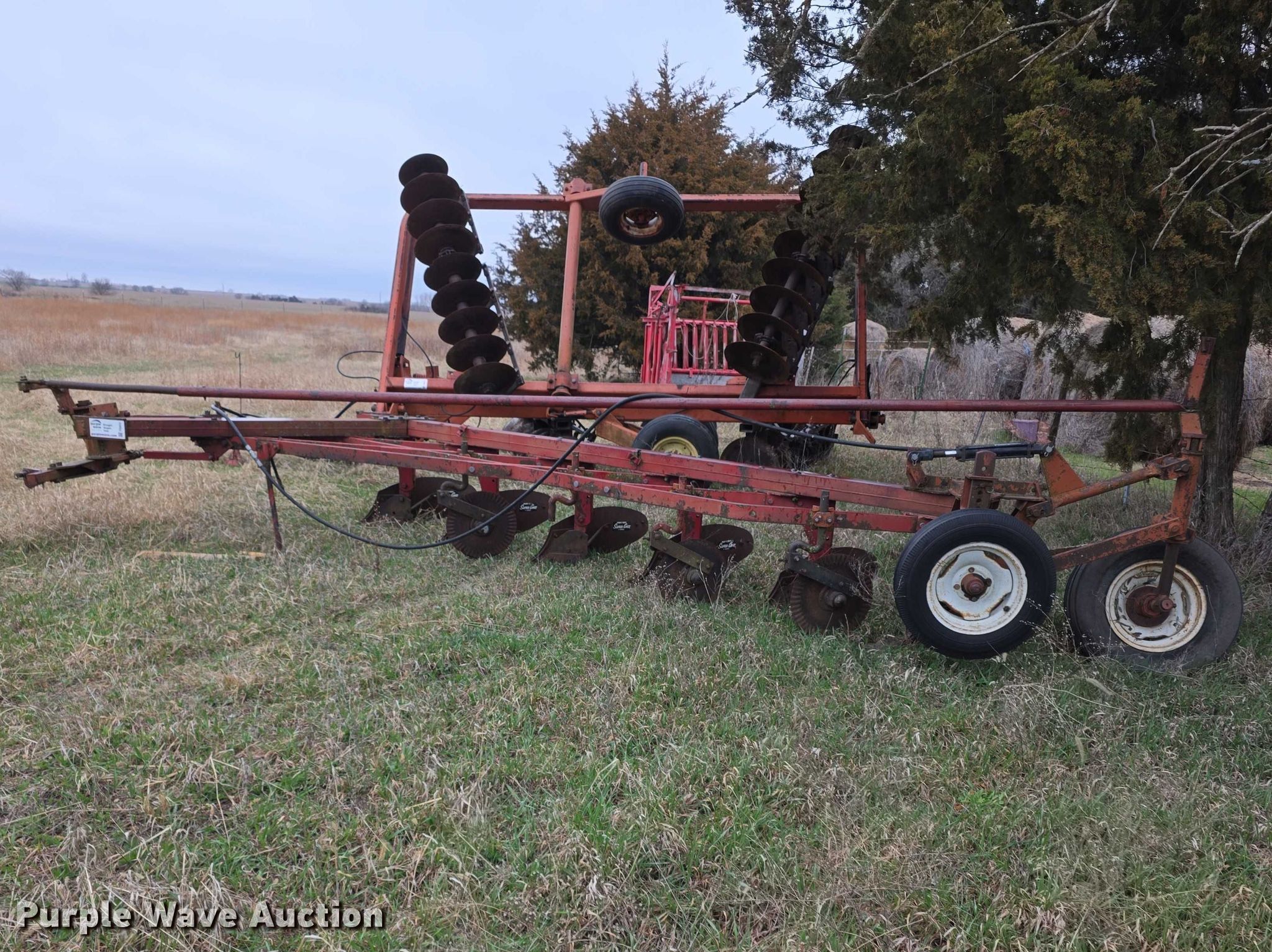 Plow. Overall width: 8'. Features Hydraulic lift, Hitch: Two point. Tires Tire size: 9.5L-15, Gauge wheels Size: 7.00-14. Notes (2) discs missing, Flat tire. Dwight, KS 66849