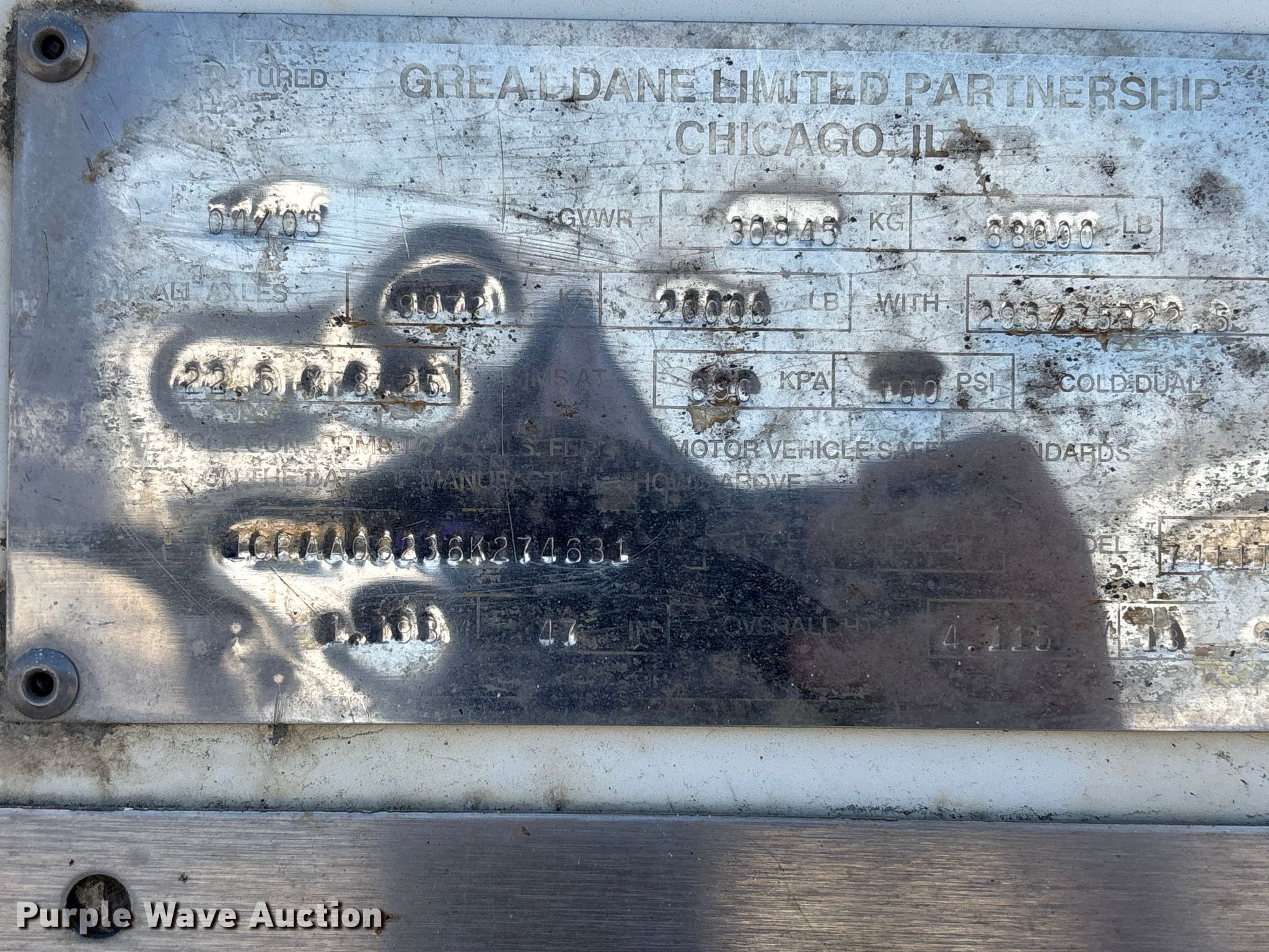 2006 Great Dane dry van trailer. VIN: 1GRAA06236K274631. Dimensions Overall Length: 53', Width: 102", Body Length: 53', Width: 102". Features Deck type: Wood. Chassis Landing gear: Dual, Suspension: Air, Brakes: Air, Axles: Tandem Sliding, GVWR: 68,000 lbs, GAWR: 20,000 lbs. Tires Steel wheels, Size: 295/75R22.5. Georgia title. Title distribution may be delayed up to 30 days from verification of funds. Lazer Logistics. 3414 Gardner Avenue. Kansas City, MO 64120