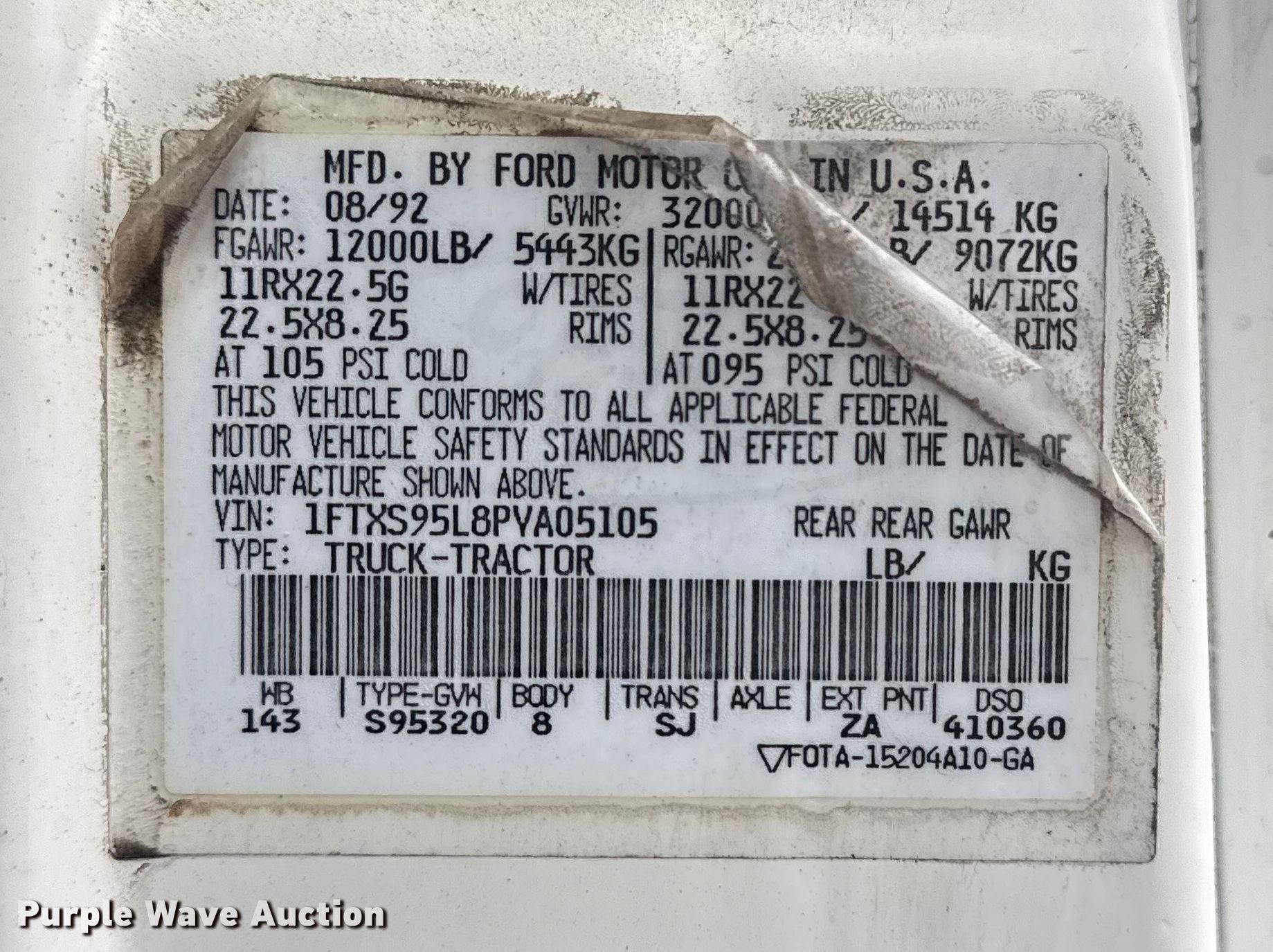 Purple Wave is selling a used Truck Tractor in Oklahoma. This item is a 1993 Ford LA9000 semi truck with the following: Miles: 112,043 on odometer, VIN: 1FTXS95L8PVA05105