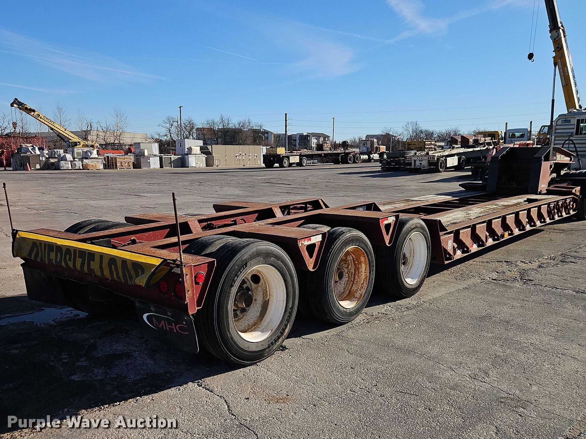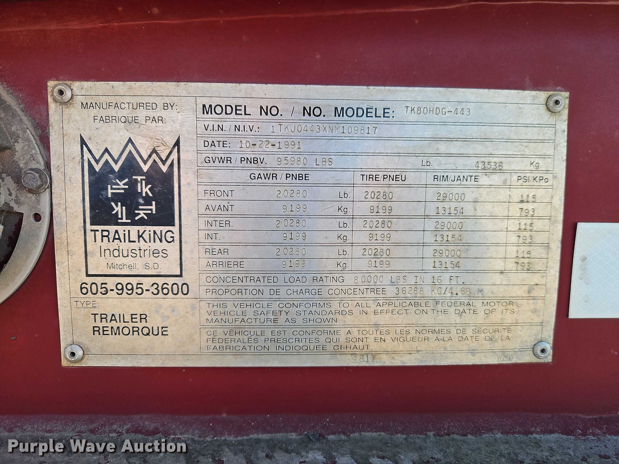 1992 Trail King Industries TK80HDG-443 lowboy equipment trailer. VIN: 1TKJ0443XNM109817. Dimensions Overall Length: 44', Width: 96", Deck Length: 20', Width: 96", Deck height: 28", Ramps: Manual Length: 24". Features Deck type: Wood, Neck type: Detachable. Chassis Suspension: Air, Brakes: Air, Axles: Triple, GVWR: 95,980 lbs, GAWR: 20,280 lbs. Tires Steel wheels, Size: 255/70R22.5. Notes Truck not included. Missouri title. Title distribution may be delayed up to 14 days from verification of funds. Midwest Crane. Olathe, KS 66062