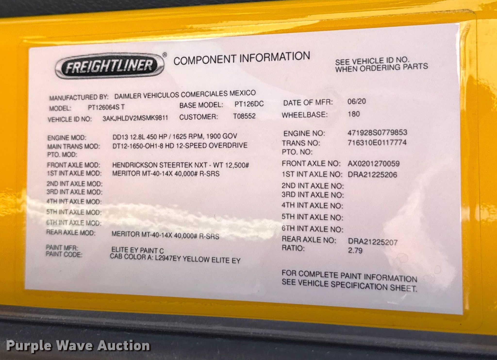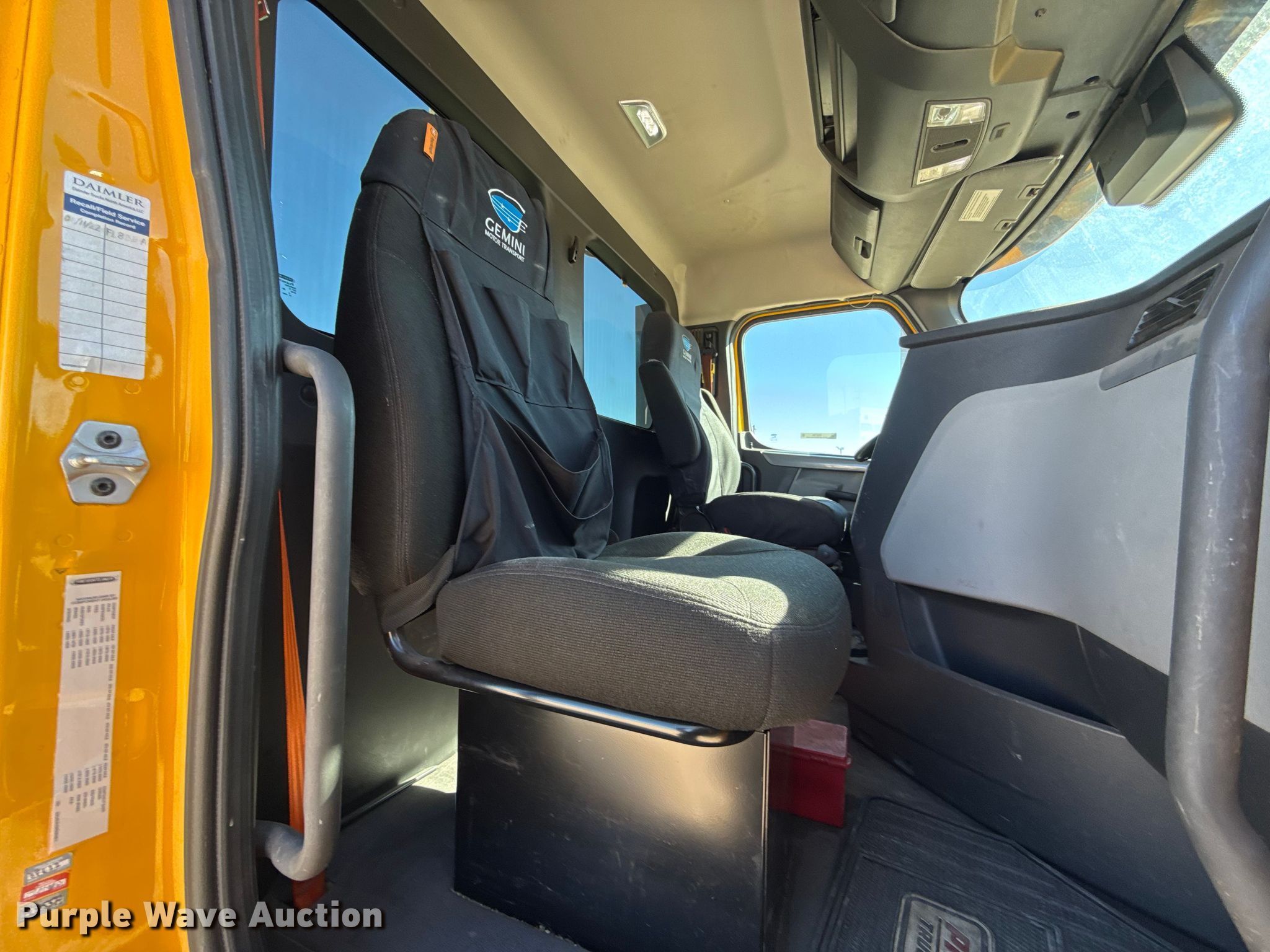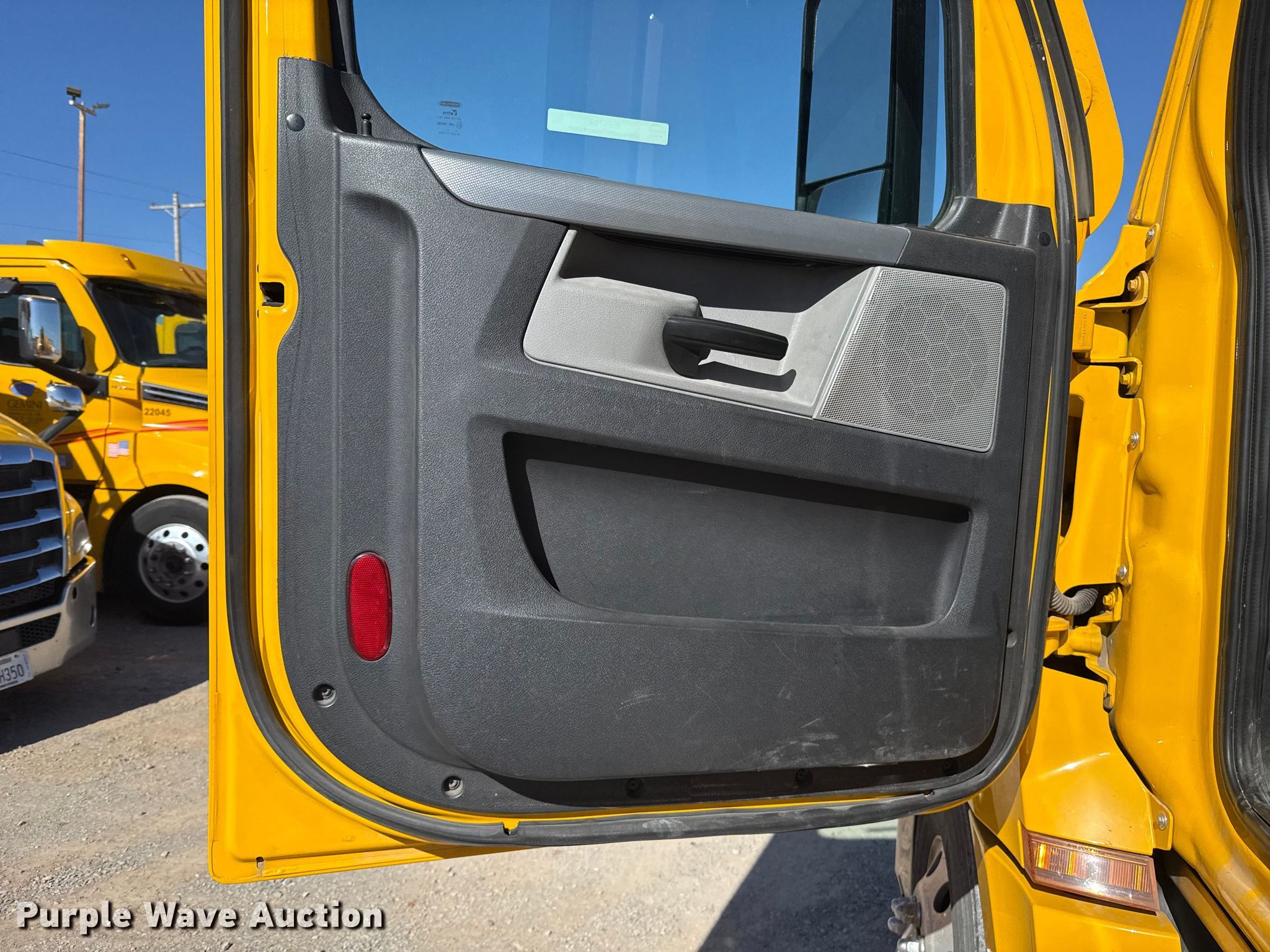 2021 Freightliner Cascadia 126 semi truck. Miles: 643,648 on odometer, Hours: 14,148 on meter, VIN: 3AKJHLDV2MSMK9811, Unit #: 21072. Engine Detroit Diesel DD13, Serial: 471928S0779853, Displacement: 12.8L, Cylinders: 6, Fuel type: Diesel, HP: 450, Engine brake. Transmission Automated manual. Chassis Axles: Tandem, Differential lock: Inter-axle, Suspension: Air Dump valves, Brakes: Air, GVWR: 52,500 lbs FAWR: 12,500 lbs, IAWR: 20,000 lbs, RAWR: 20,000 lbs, Wheelbase: 180". Interior AC, Heat, Heated mirrors, Power windows, Power locks, Cruise control, Air ride cab. Features Deck plate: Aluminum, Fifth wheel type: Fixed, Fuel tank: Single. Tires Front: 295/75R22.5, Rear: 445/50R22.5. Oklahoma title. Title distribution may be delayed up to 30 days from verification of funds. Gemini Motor Transport. 10220 W Reno Ave. Oklahoma City, OK 73127