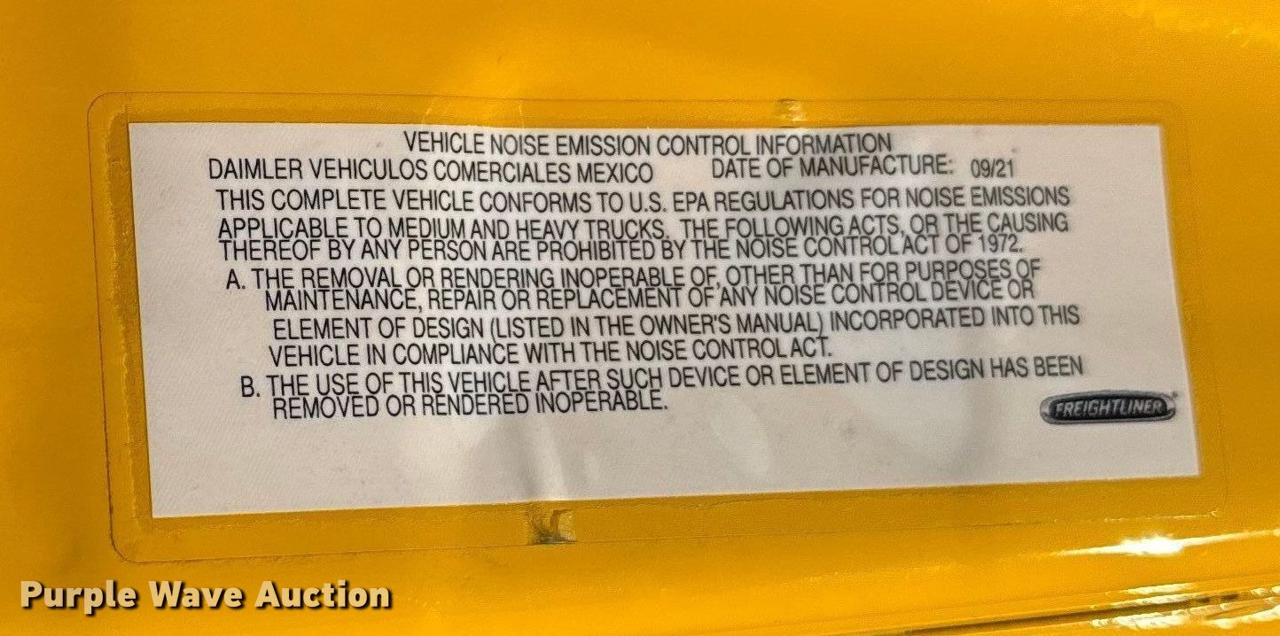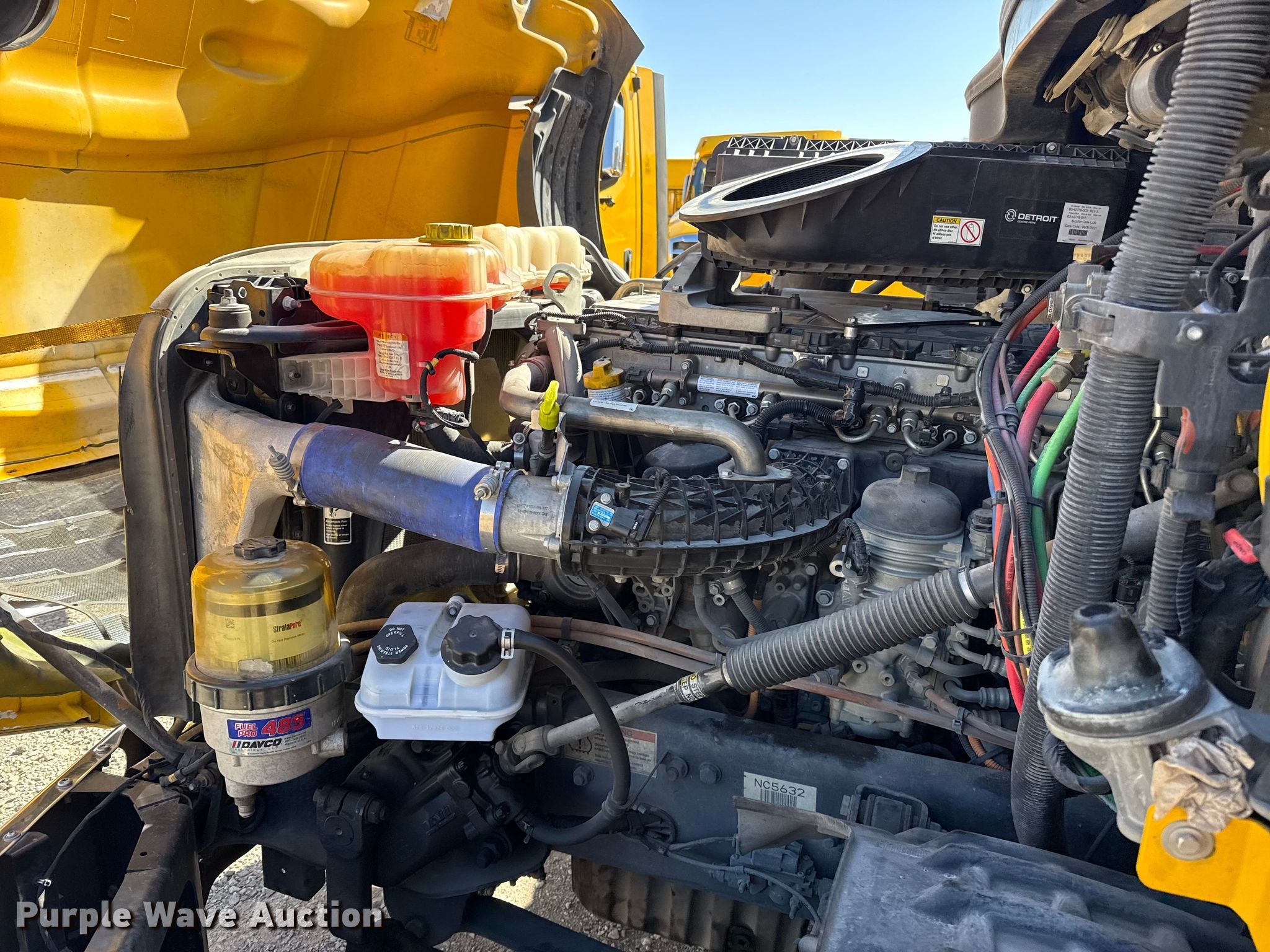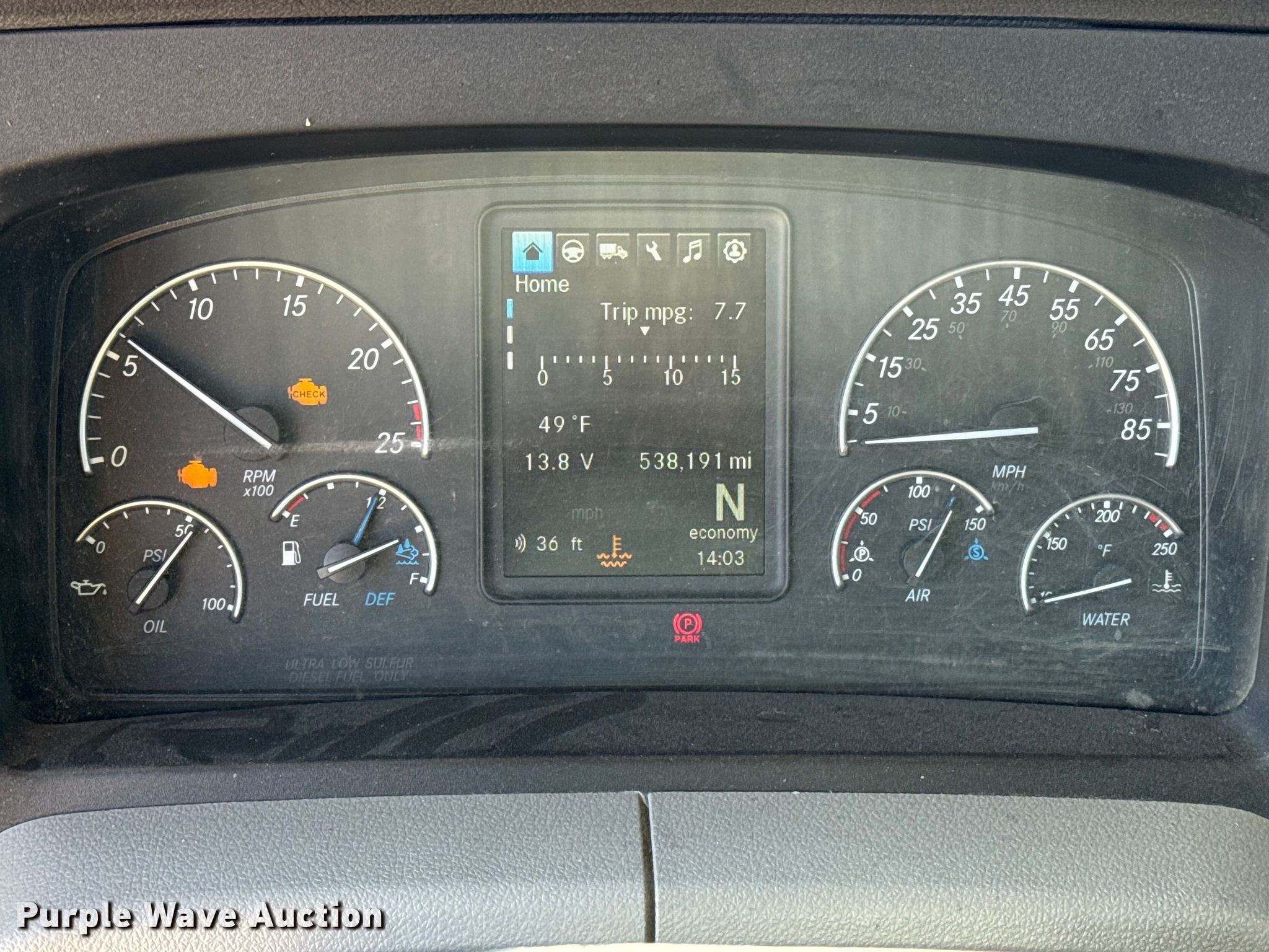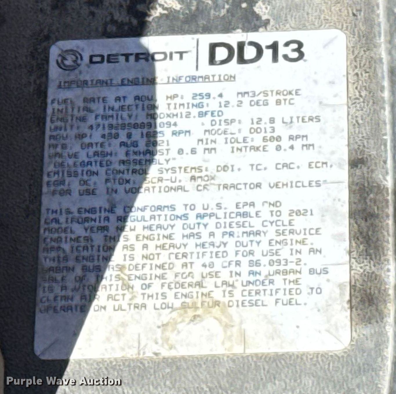 2022 Freightliner Cascadia 126 semi truck. Miles: 538,191 on odometer, Hours: 12,131 on meter, VIN: 3AKJHLDV4NSNC5632, Unit #: 22045. Engine Detroit Diesel DD13, Serial: 471928S0891094, Displacement: 12.8L, Cylinders: 6, Fuel type: Diesel, HP: 450, Engine brake. Transmission Automated manual. Chassis Axles: Tandem, Differential lock: Inter-axle, Suspension: Air Dump valves, Brakes: Air, GVWR: 52,500 lbs FAWR: 12,500 lbs, IAWR: 20,000 lbs, RAWR: 20,000 lbs, Wheelbase: 180". Interior AC, Heat, Heated mirrors, Power windows, Power locks, Cruise control, Air ride cab. Features Deck plate: Aluminum, Fifth wheel type: Fixed, Fuel tank: Single. Tires Front: 295/75R22.5, Rear: 445/50R22.5. Notes Dash warning indicator: Check engine, High coolant temperature. Oklahoma title. Title distribution may be delayed up to 30 days from verification of funds. Gemini Motor Transport. 10220 W Reno Ave. Oklahoma City, OK 73127