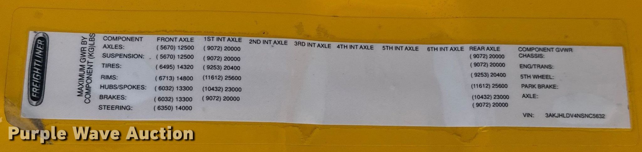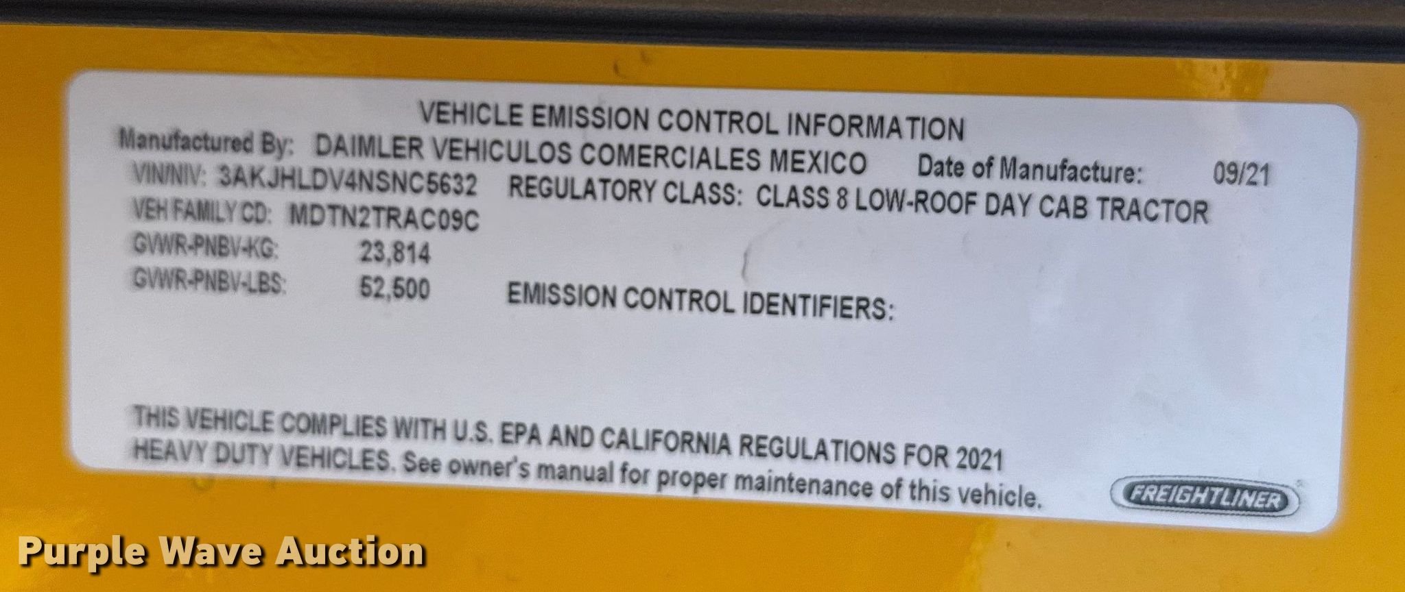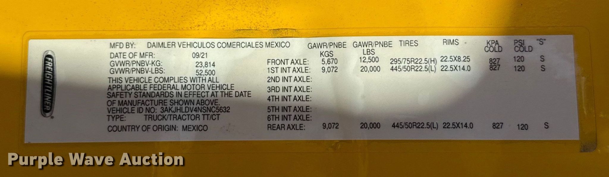 Purple Wave is selling a used Truck Tractor in Oklahoma. This item is a 2022 Freightliner Cascadia 126 semi truck with the following: Miles: 538,191 on odometer, Hours: 12,131 on meter, VIN: 3AKJHLDV4NSNC5632, Unit #: 22045