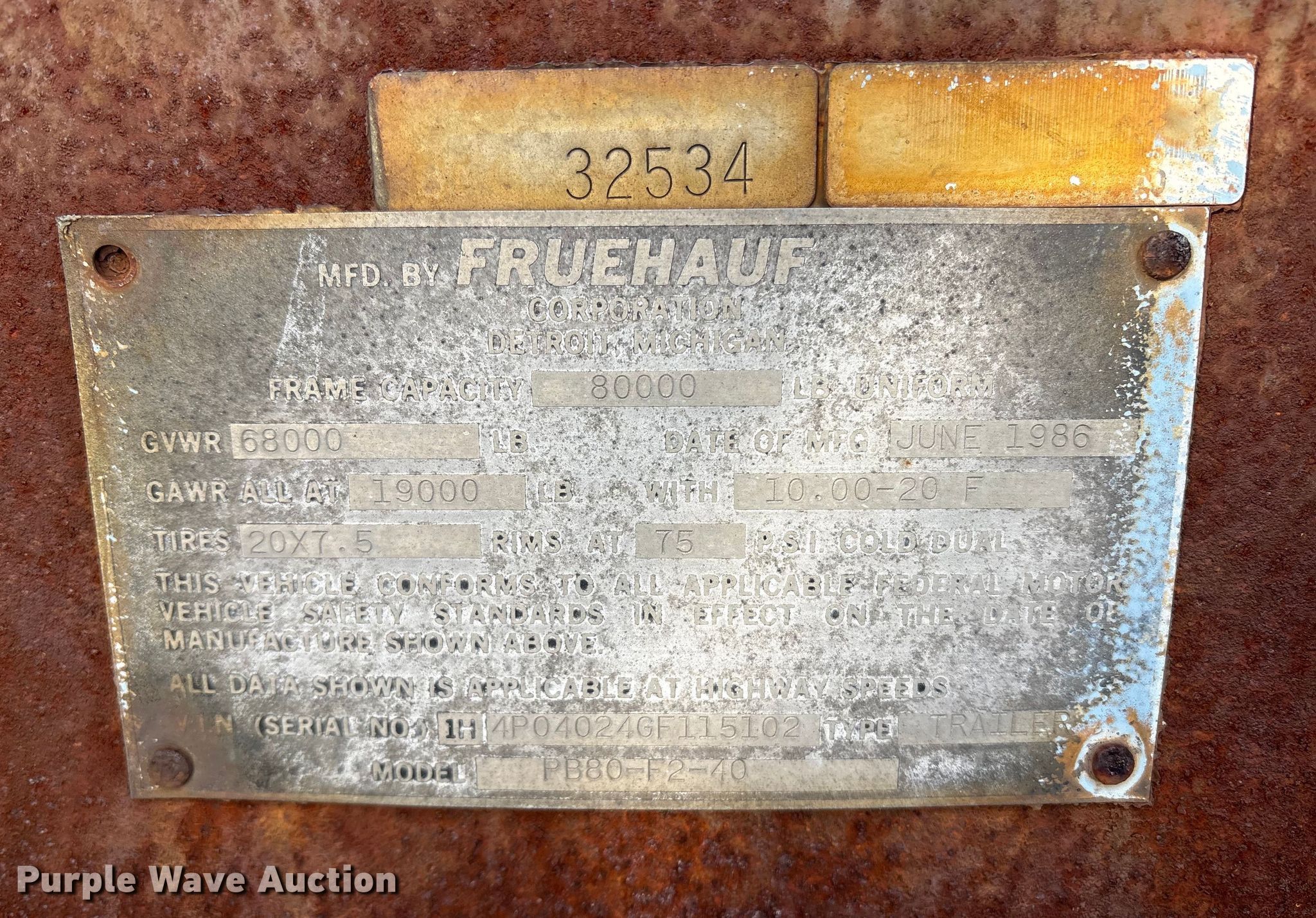 Purple Wave is selling a used Flat or Drop Deck Trailer in Delaware. This item is a 1986 Fruehauf PB80-F2-40 flatbed trailer with the following: VIN: 1H4P04024GF115102