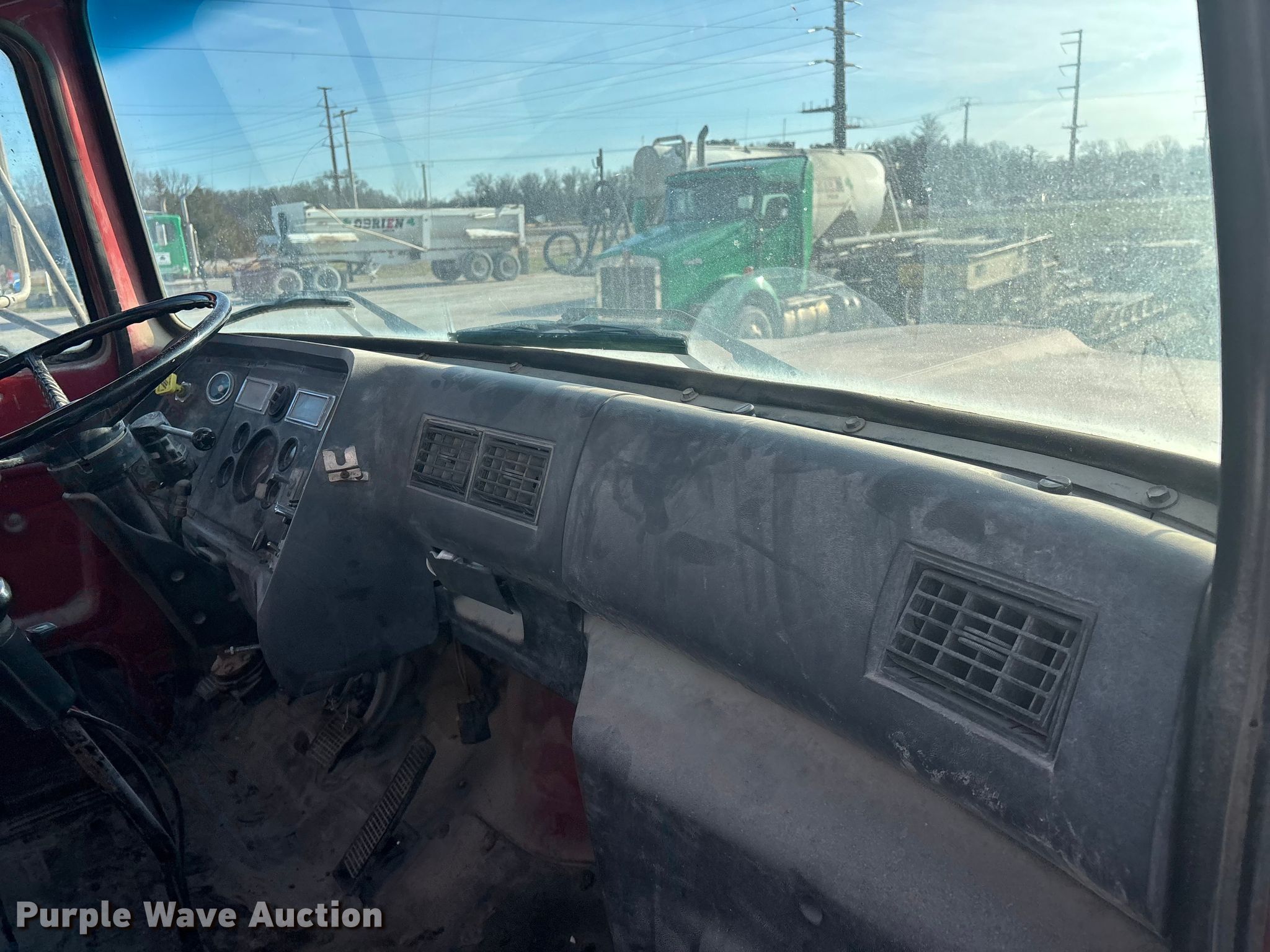 1997 Ford L8000 flatbed truck. Miles: 269,002 on odometer, Hours: 743 on meter, Actual hours unknown, VIN: 1FDZU82E4VVA22172. Engine Cylinders: 6, Fuel type: Diesel. Transmission Eaton Fuller RoadRanger RT-7608LL, Manual, Speed: 10. Chassis Axles: Triple, Steerable, Tag axle, Differential lock: Inter-axle, Suspension: Spring over walking beam, Brakes: Air, PTO, Wet kit, GVWR: 60,000 lbs. Interior Heat. Features Bed Flatbed, Length: 20', Width: 94". Tires Front: 425/65R22.5, Rear: 11R22.5, Lift axle: 295/75R22.5. Notes Lift axle issues, AC issues, Non-operational blower motor, Dead battery. Kansas title. Title distribution may be delayed up to 30 days from verification of funds. O'Brien Ready Mix, Inc.. Frontenac, KS 66763