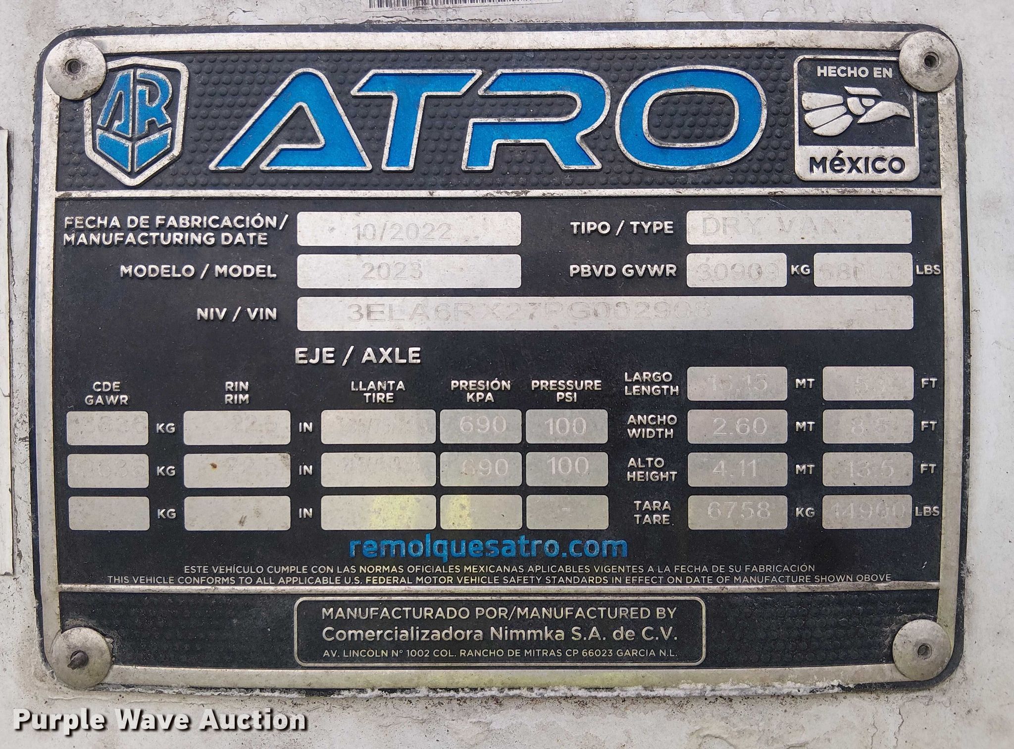 Purple Wave is selling a used Dry Van Trailer in Nevada. This item is a 2023 Atro dry van trailer with the following: VIN: 3ELA6RX27PG002908, Unit #: 74114335