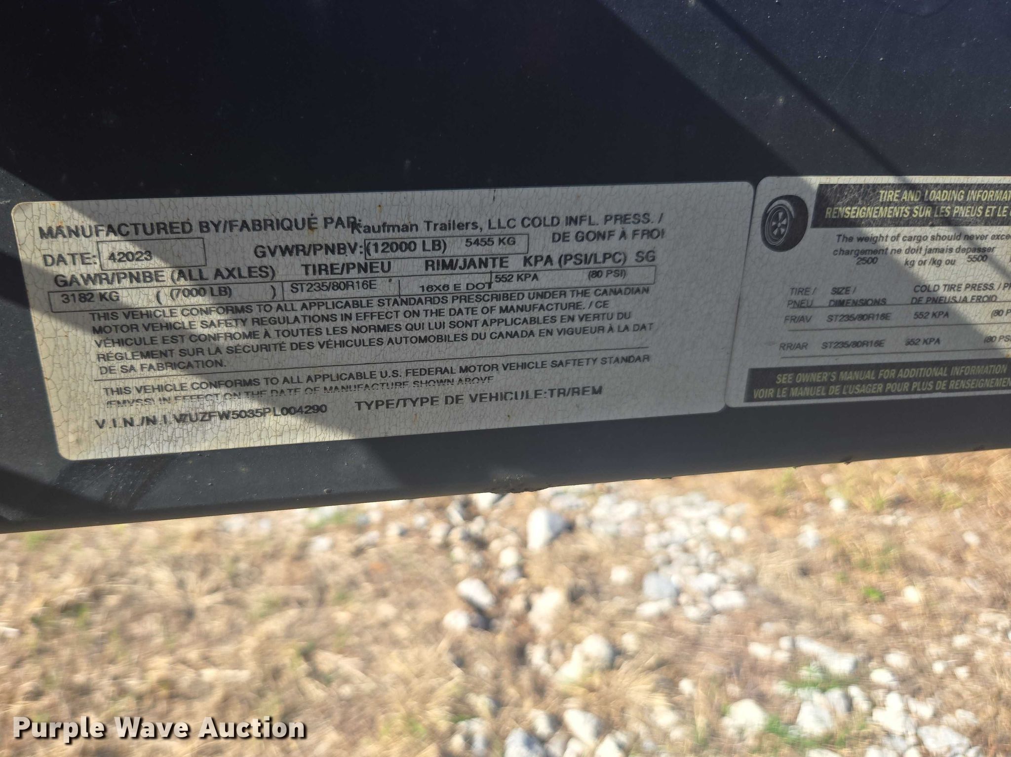 2023 Kaufman car carrier. VIN: 7UZFW5035PL004290, Unit #: 77082685. Dimensions Overall Length: 49' 6", Width: 91". Features Deck type: Steel. Chassis Landing gear: Dual, Suspension: Spring, Brakes: Electric, Axles: Triple, GAWR: 7,000 lbs. Tires Steel wheels, Size: 235/80R16. Repossessed item, stored at a secured facility. Please review REQUIRED REMOVAL INSTRUCTIONS. Titles will be distributed after confirmation of payment and removal. Florida title. Title distribution may be delayed up to 30 days from verification of funds. Lender Owned. 4201 Bonnie Mine Road. Mulberry, FL 33860