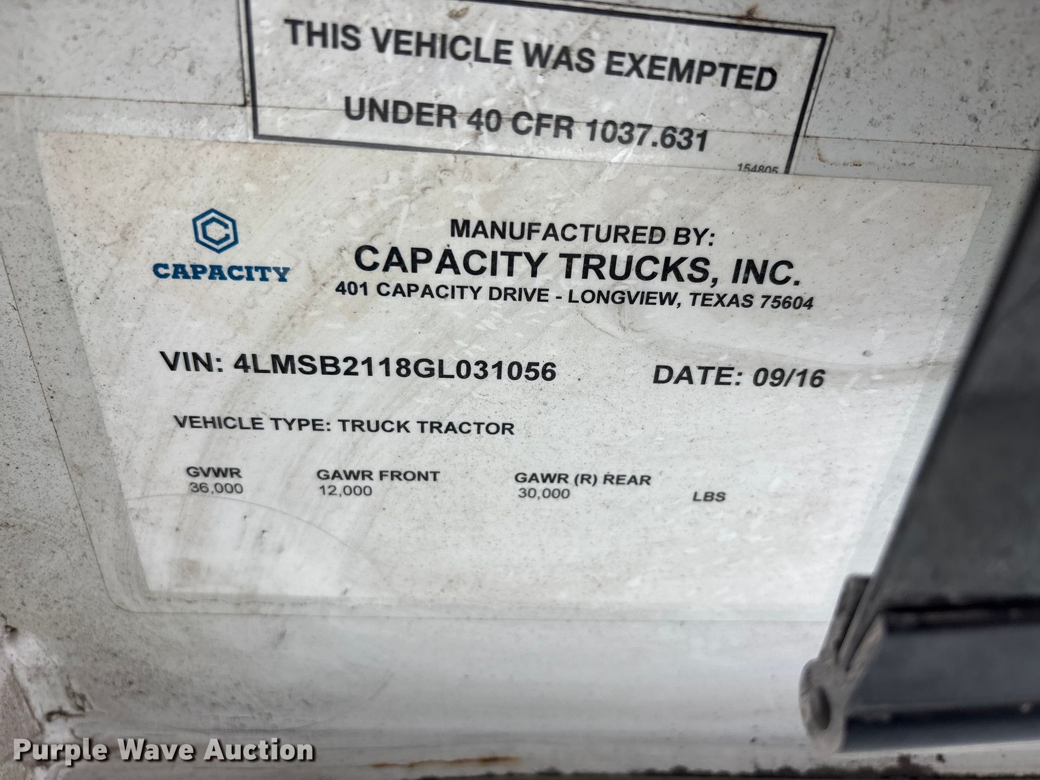 2016 Capacity yard truck. Miles: 3 on odometer, Hours: 24,317 on meter, VIN: 4LMSB2118GL031056, Unit #: TM1056, Lot #: 77601435. Engine Cummins, Cylinders: 6, Fuel type: Diesel. Transmission Allison, Automatic. Chassis Axles: Single, Suspension: Spring, Brakes: Air, GVWR: 36,000 lbs. Interior Auxiliary controls. Features Deck plate: Steel, Fifth wheel type: Hydraulic lift, Fuel tank: Single. Tires Size: 295/75R22.5. Notes Dash warning indicator: DEF warning, Stop warning. Fleet inventory reduction, stored at a secured facility. Please review REQUIRED REMOVAL INSTRUCTIONS. This is worksite support equipment and will not come with a title. Transfer of ownership documentation will be a bill of sale. Lazer Logistics. Lebanon, TN 37090
