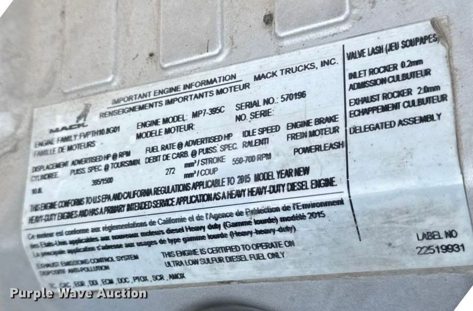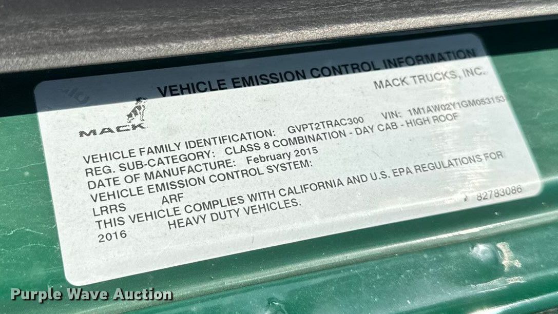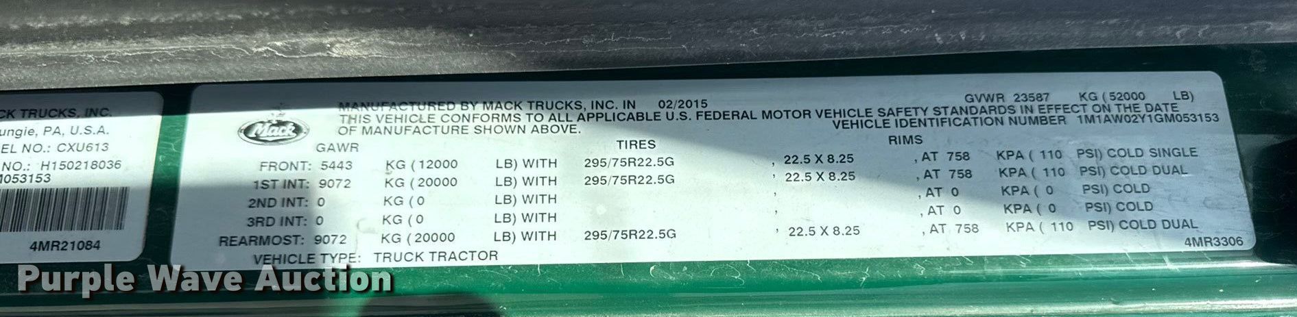 2016 Mack Cxu semi truck. Miles: 642,042 on odometer, Hours: 19,011 on meter, VIN: 1M1AW02Y1GM053153, Unit #: 720. Engine Mack MP7-395C, Serial: 570196, Displacement: 10.8L, Cylinders: 6, Fuel type: Diesel, HP: 335, Engine brake. Transmission Mack mDrive, Automated manual. Chassis Axles: Tandem, Differential lock: Inter-axle, Suspension: Air Dump valves, Brakes: Air, Truck chassis: 153", GVWR: 52,000 lbs FAWR: 12,000 lbs, IAWR: 20,000 lbs, RAWR: 20,000 lbs. Interior AC, Heat, Heated mirrors, Cruise control, Air ride cab. Features Deck plate: Aluminum, Fifth wheel type: Fixed, Fuel tank: Dual. Tires Size: 295/75R22.5. Notes Dash warning indicator: Fault code, Jump start required during on-site data collection. Indiana title. Title distribution may be delayed up to 30 days from verification of funds. Standard Forwarding, LLC Strategic Fleet Realignment Sale. West Burlington, IA 52655