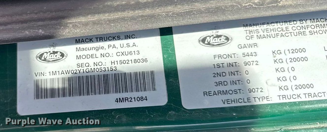Purple Wave is selling a used Truck Tractor in Iowa. This item is a 2016 Mack Cxu semi truck with the following: Miles: 642,042 on odometer, Hours: 19,011 on meter, VIN: 1M1AW02Y1GM053153, Unit #: 720