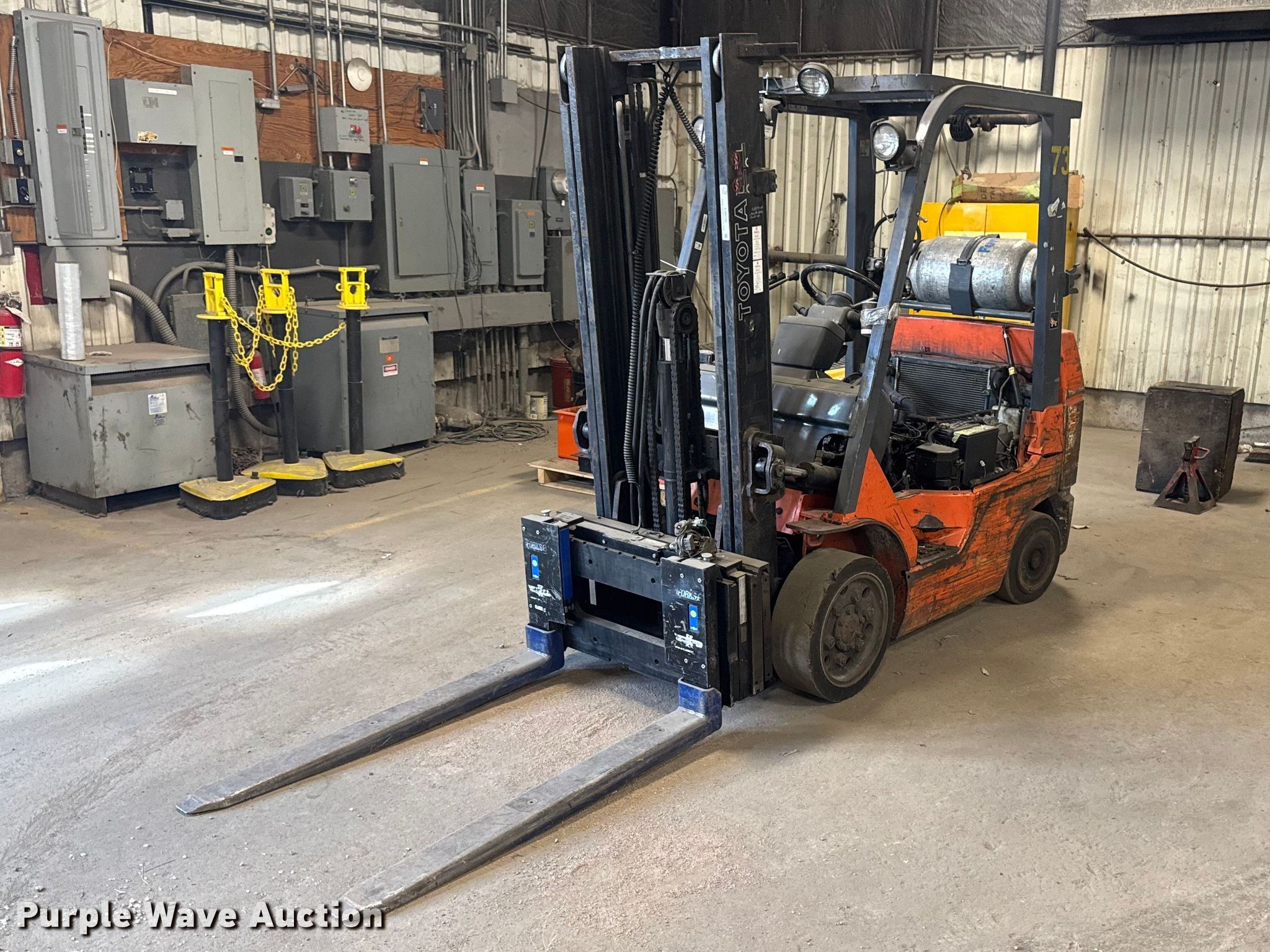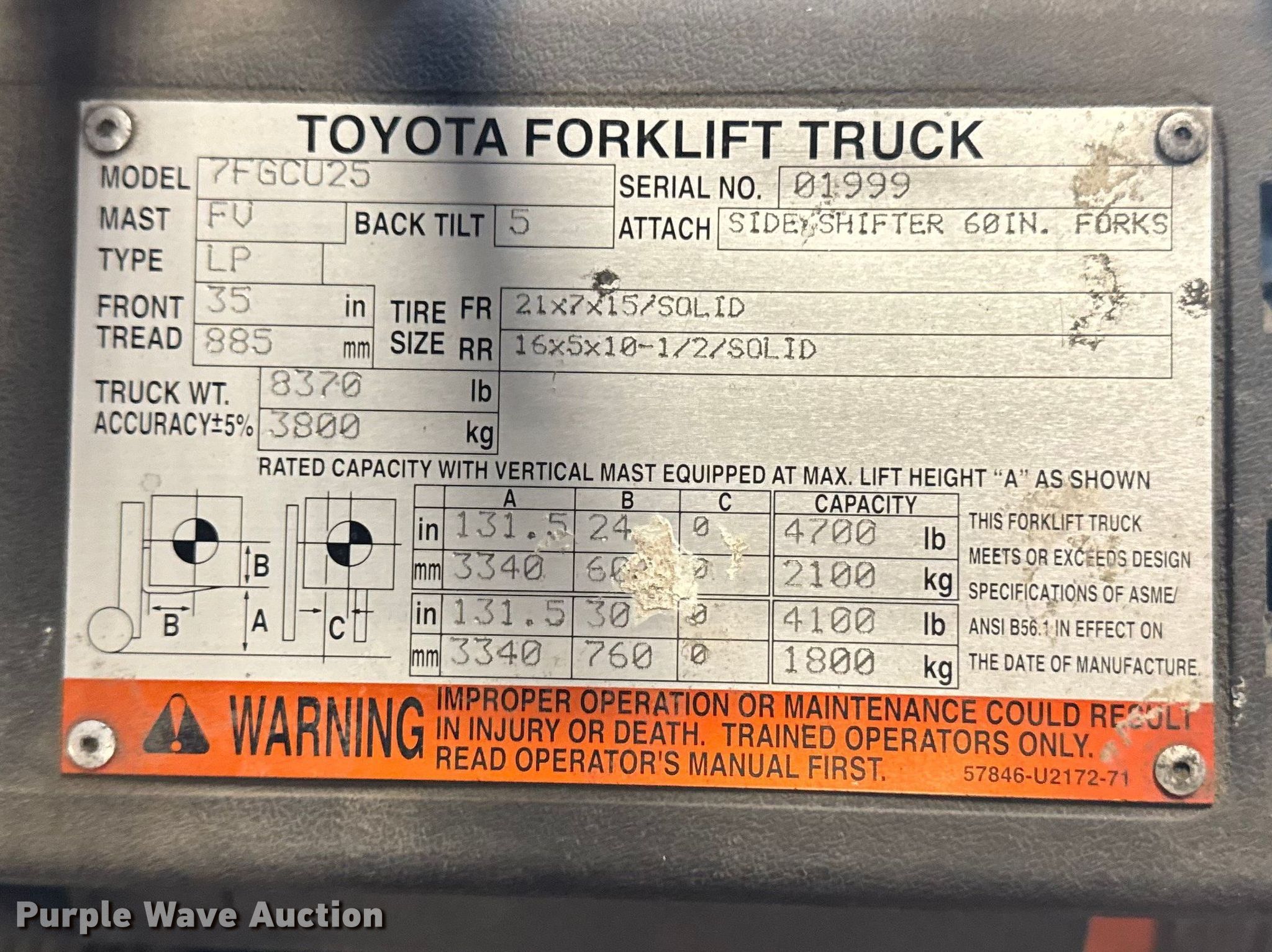 Toyota 7FGCU25 forklift. Hours: 14,891 on meter, Serial: 01999, Unit #: 73. Engine Toyota, Displacement: 2.237L, Cylinders: 4, Fuel type: LPG LP bottle: Not included. Transmission Powershift, 1F - 1R. Operators station OROPS, Onboard scale system, 2024 avery weigh-tronix flsc-05 scale. Features Maximum lift capacity: 4,700 lbs, Maximum lift height: 131", Collapsed mast height: 82", Mast stages: 2, Side shift, Mast tilt, Fork length: 48". Tires Front: 27x7x15, Rear: 16x5x10.5. Notes Engine issues, cranks but does not start , Non-operational unit. Buyer responsible for all aspects of removal. Standard Forwarding, LLC Strategic Fleet Realignment Sale - Open Inspection April 20th 2026 from 9:00 a.m. to 3:00 p.m.. 2925 Morton Drive. East Moline, IL 61244