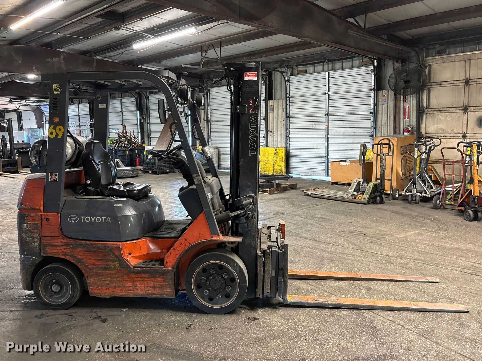 Purple Wave is selling a used Warehouse Forklift in Illinois. This item is a Toyota 7FGCU25 forklift with the following: Hours: 27,927 on meter, Serial: 91593, Unit #: 69