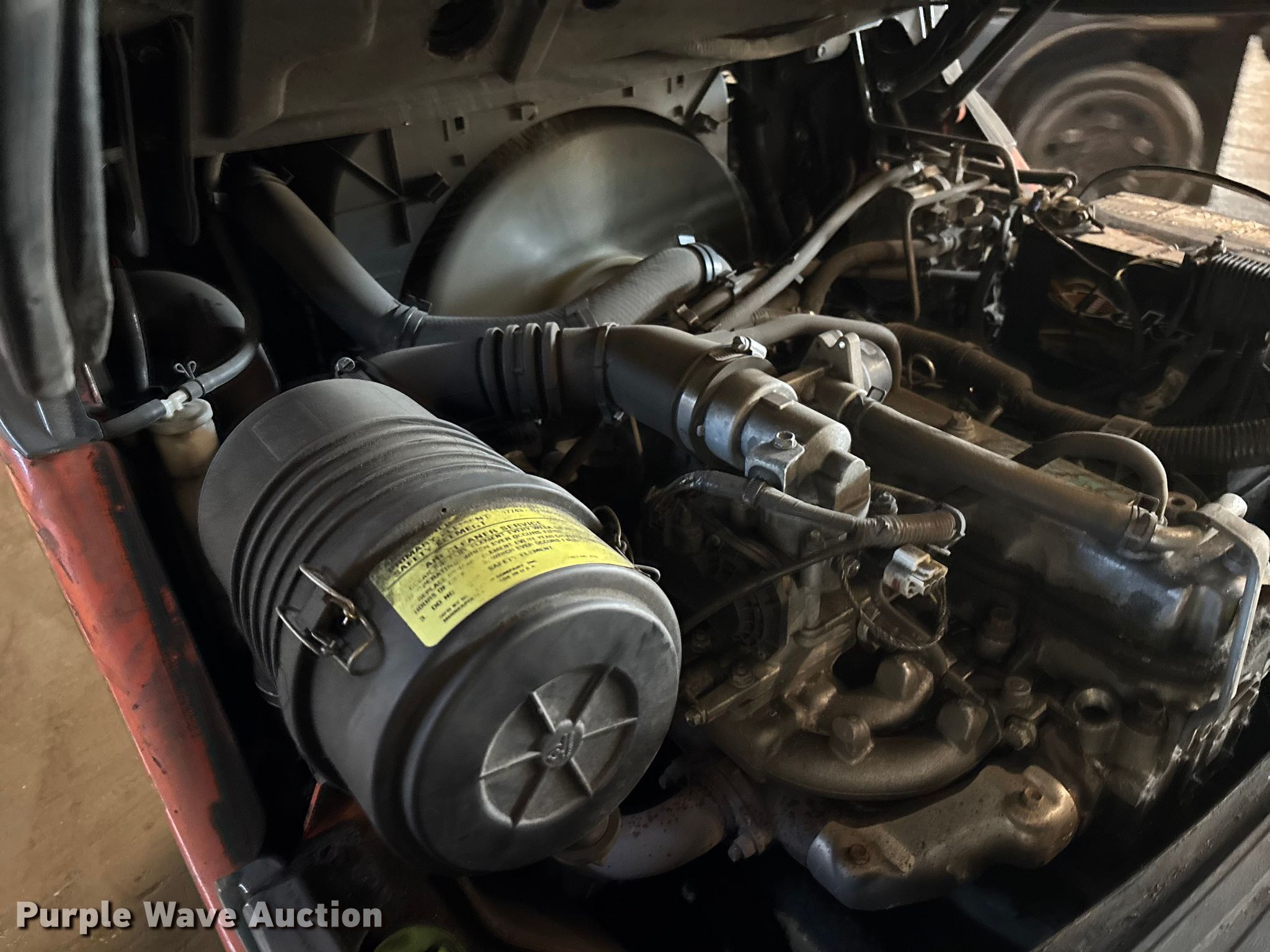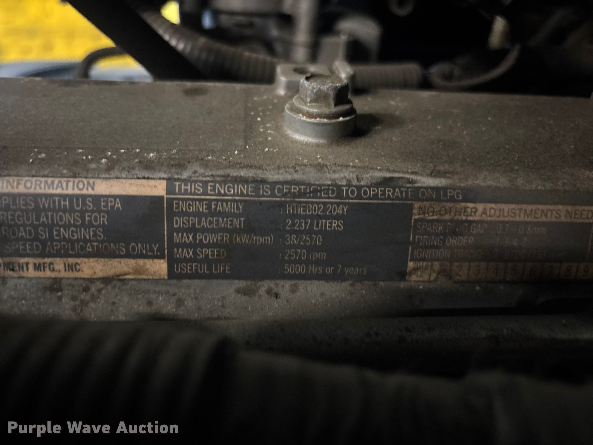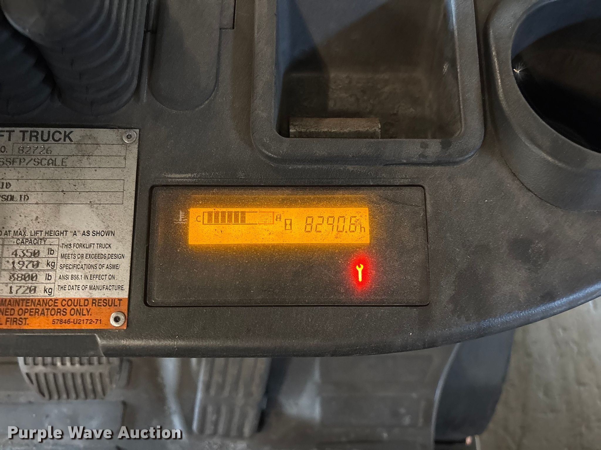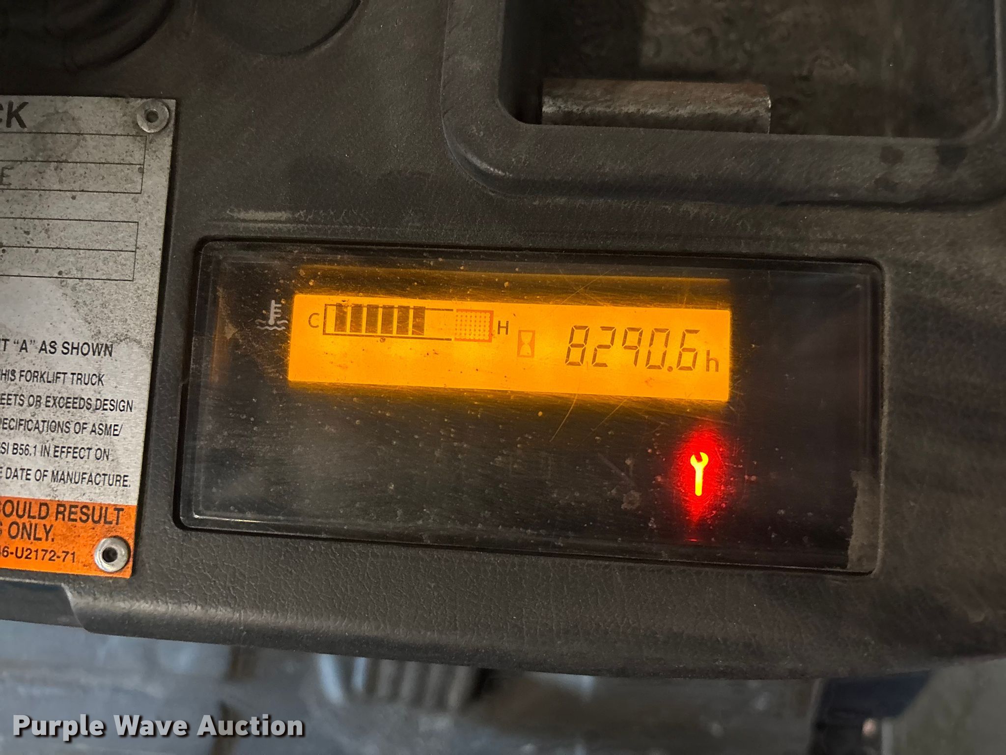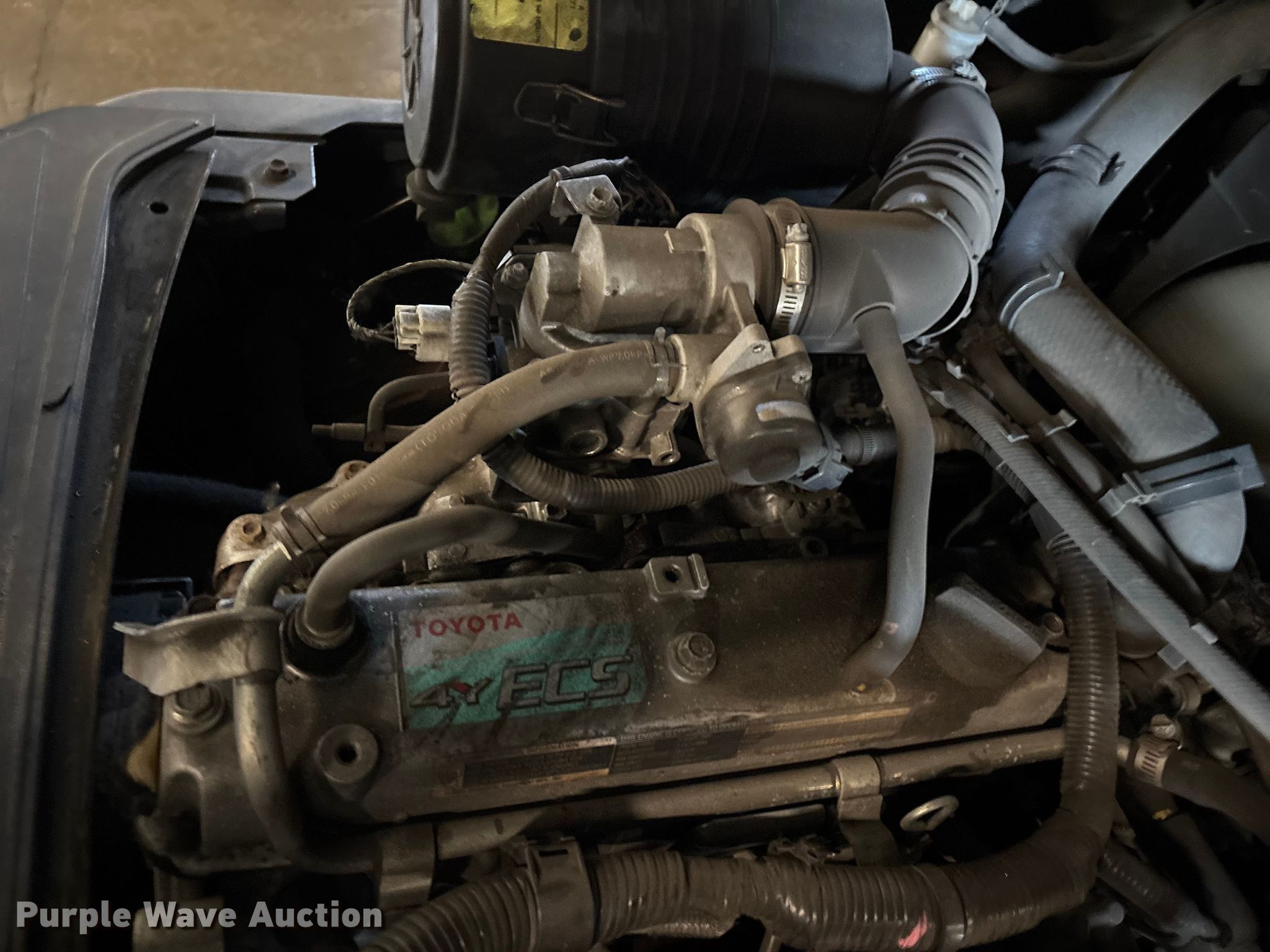 Toyota 8FGCU25 forklift. Hours: 8,290 on meter, Serial: 82726, Unit #: 141. Engine Toyota 4YECS, Displacement: 2.23L, Cylinders: 4, Fuel type: LPG LP bottle: Not included, kW: 38. Transmission Powershift. Operators station OROPS, Onboard scale system. Features Maximum lift capacity: 4,350 lbs, Maximum lift height: 131", Collapsed mast height: 82", Mast stages: 2, Side shift, Mast tilt, Fork positioner, Fork length: 48". Tires Front: 21x7x15, Rear: 16x5x10.5, Solid. Notes Warning indicator: Service Light, Carriage disconnected. Standard Forwarding, LLC Strategic Fleet Realignment Sale - Open Inspection April 20th 2026 from 9:00 a.m. to 3:00 p.m.. 2925 Morton Drive. East Moline, IL 61244