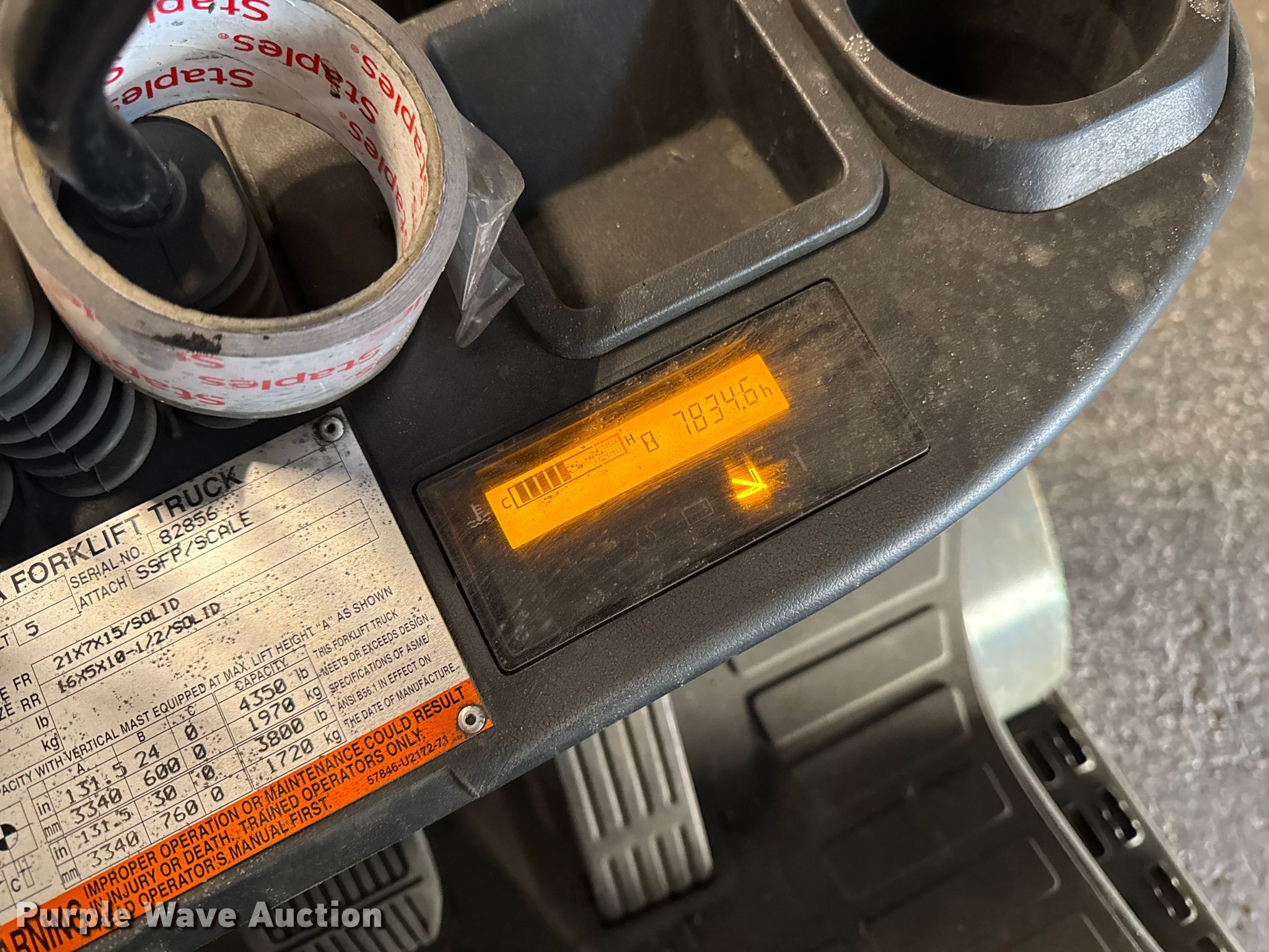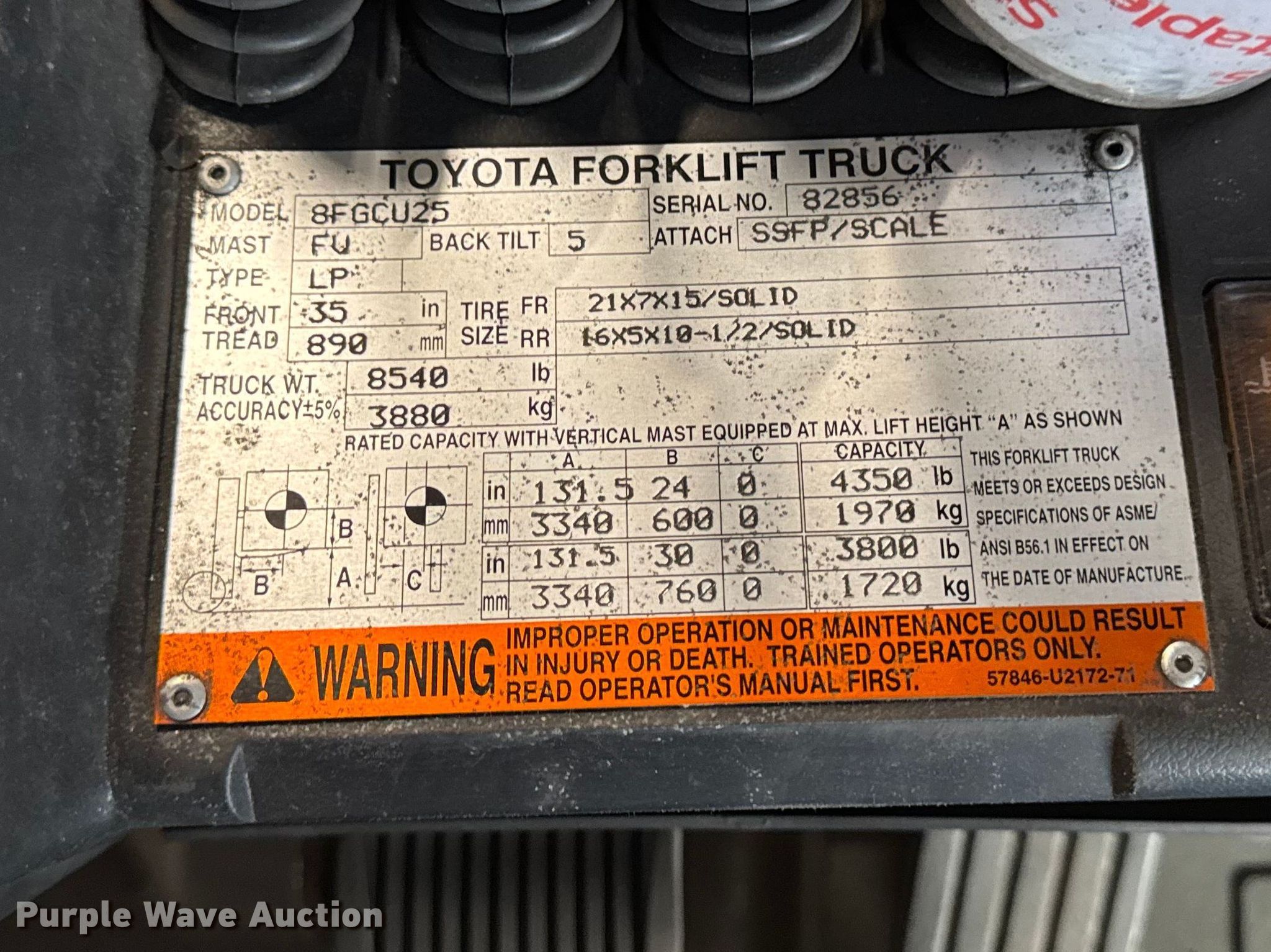 Toyota 8FGCU25 forklift. Hours: 7,835 on meter, Serial: 82856, Unit #: 149. Engine Toyota, Displacement: 2.237L, Cylinders: 4, Fuel type: LPG LP bottle: Not included. Transmission Powershift. Operators station OROPS, Onboard scale system 2017 Weigh-Tronix FLSC-05, Capacity: 5,000 lbs. Features Maximum lift capacity: 4,350 lbs, Maximum lift height: 131", Collapsed mast height: 82", Mast stages: 2, Side shift, Mast tilt, Fork positioner, Fork length: 48". Tires Front: 21x7x15, Rear: 16x5x10.5. Notes Jump start required during on-site data collection. Standard Forwarding, LLC Strategic Fleet Realignment Sale - Open Inspection April 20th 2026 from 9:00 a.m. to 3:00 p.m.. 2925 Morton Drive. East Moline, IL 61244