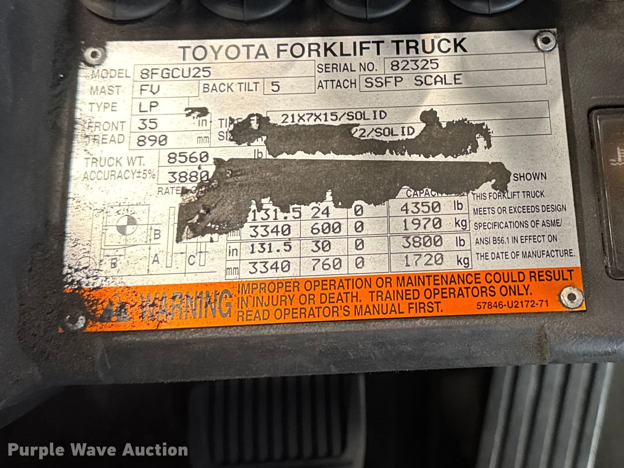 Toyota 8FGCU25 forklift. Hours: 10,314 on meter, Serial: 82325, Unit #: 131. Engine Toyota, Displacement: 2.237L, Cylinders: 4, Fuel type: LPG LP bottle: Not included. Transmission Powershift. Operators station OROPS, Onboard scale system. Features Maximum lift capacity: 4,350 lbs, Maximum lift height: 131", Collapsed mast height: 82", Mast stages: 2, Side shift, Mast tilt, Fork positioner, Fork length: 60". Tires Front: 21x7x15, Rear: 16x5x10.5. Notes Warning indicator: Service, E AS-1, Jump start required during on-site data collection. Standard Forwarding, LLC Strategic Fleet Realignment Sale - Open Inspection April 20th 2026 from 9:00 a.m. to 3:00 p.m.. 2925 Morton Drive. East Moline, IL 61244