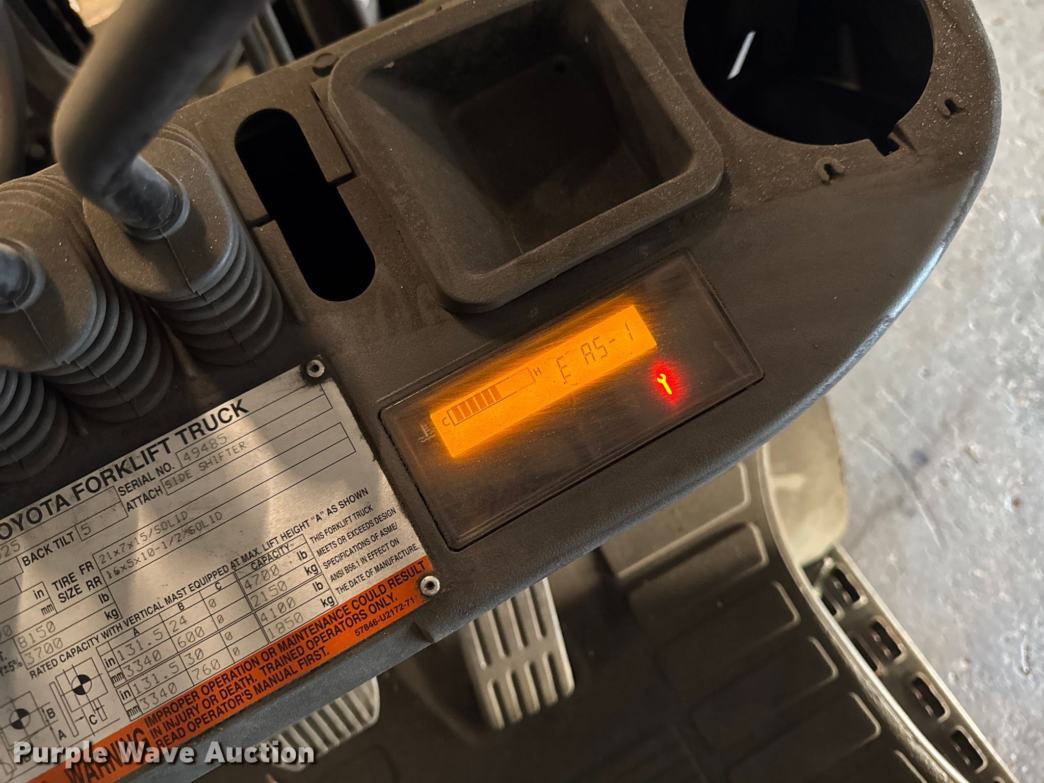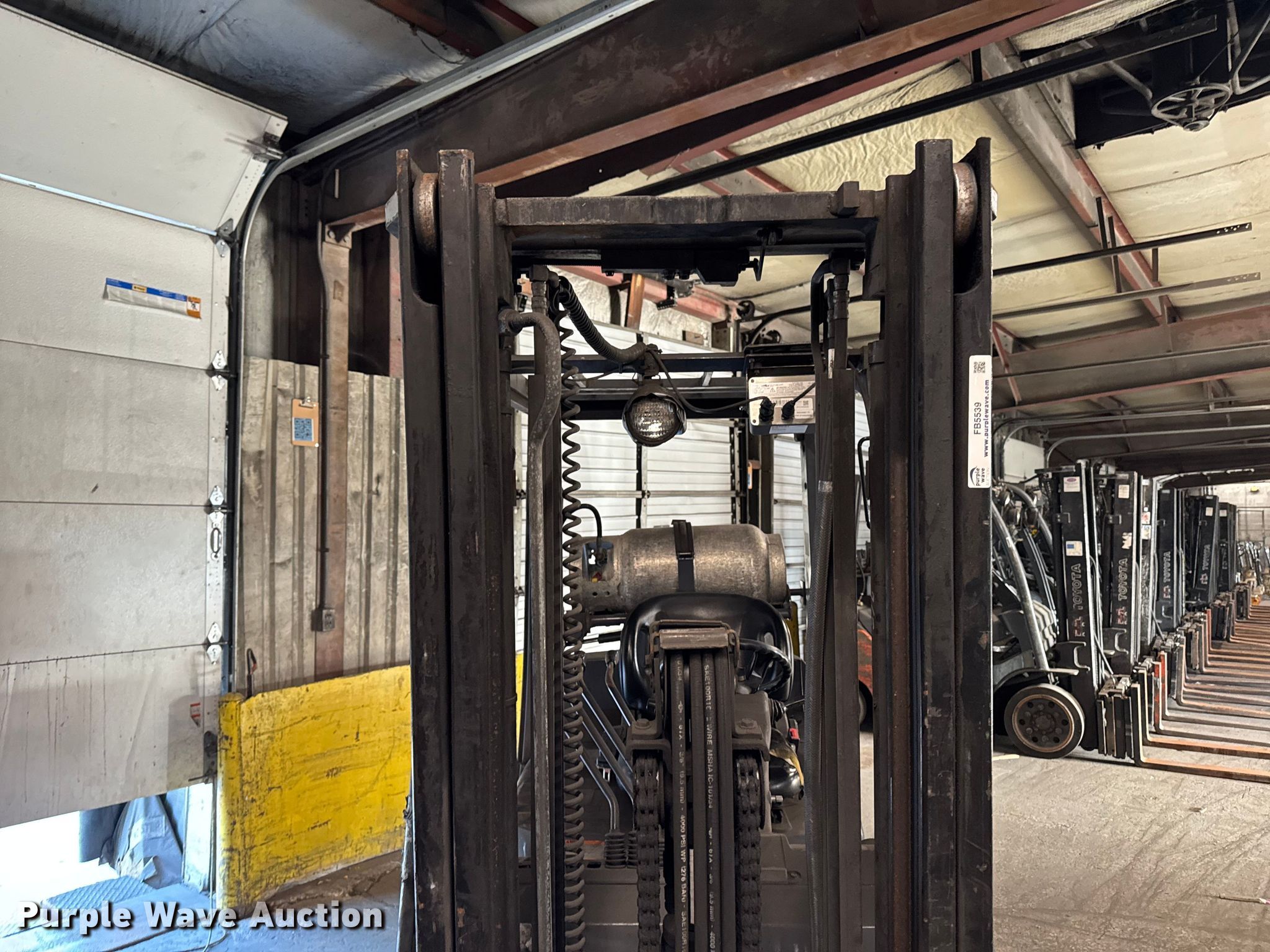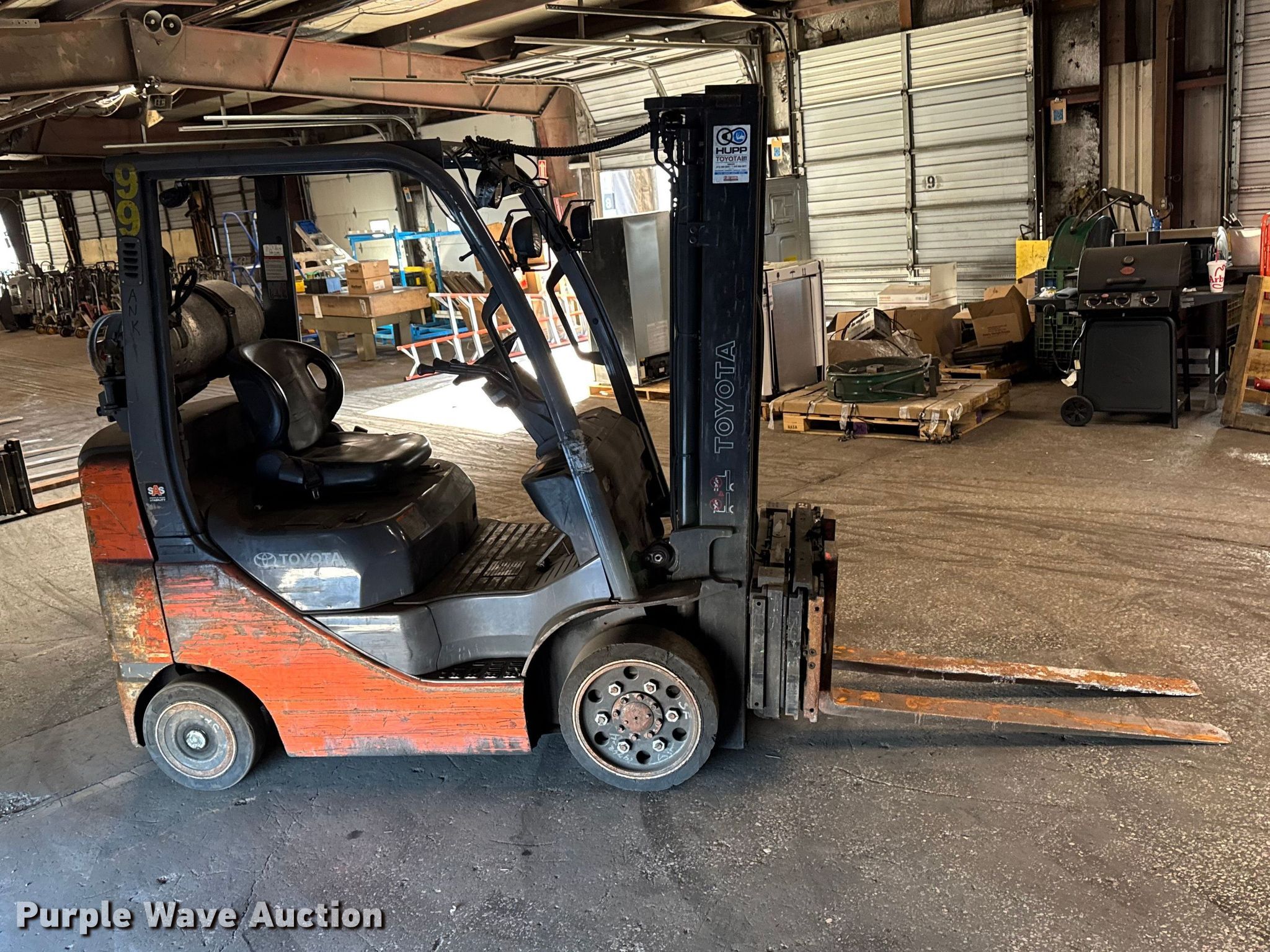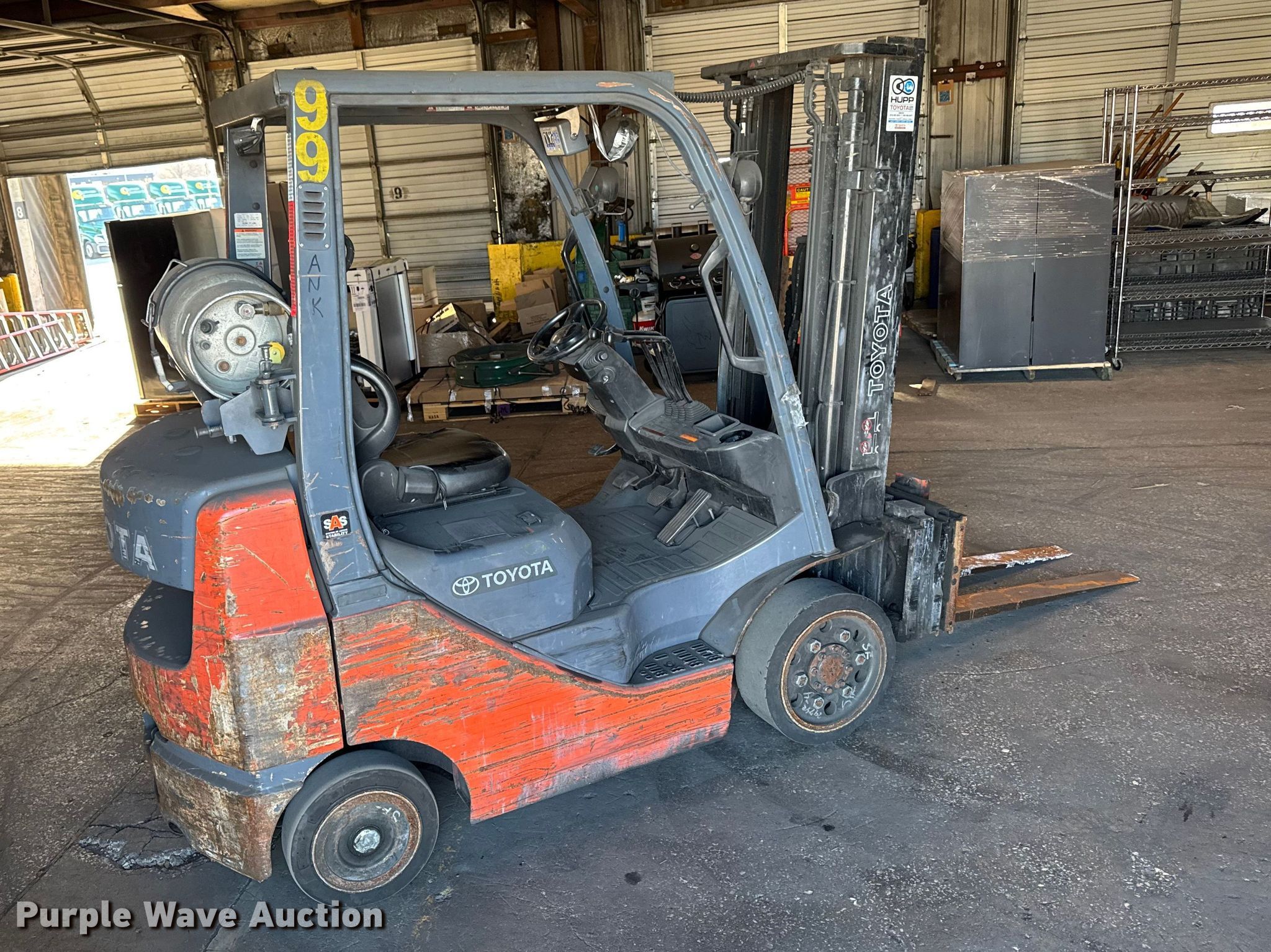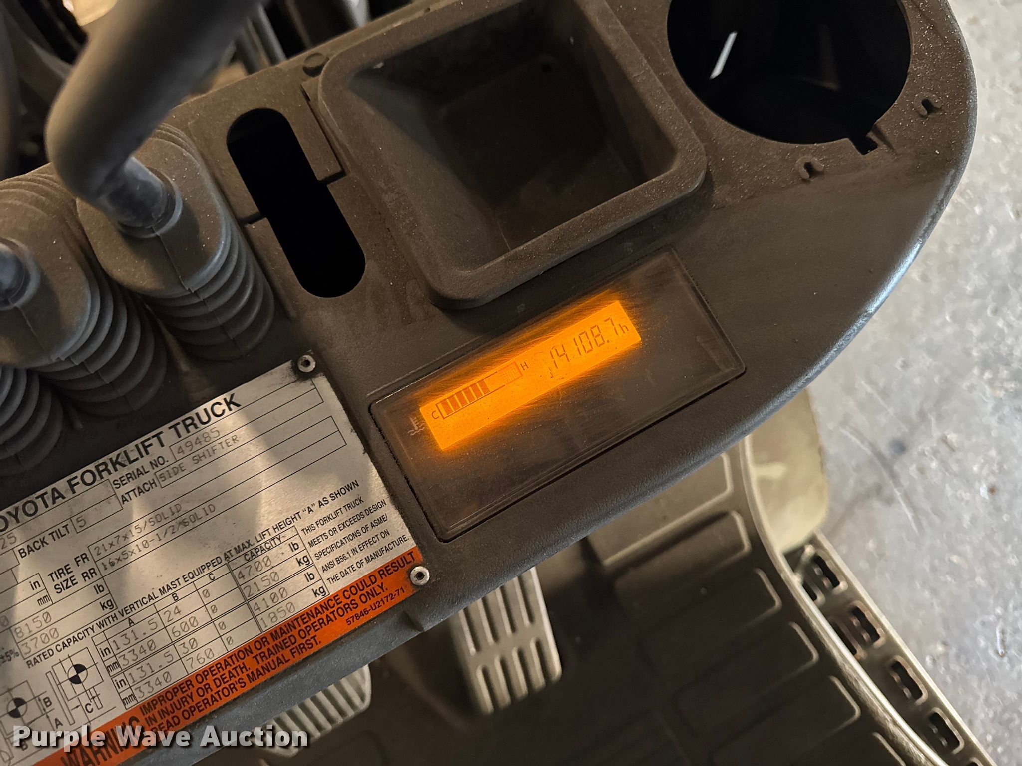 Purple Wave is selling a used Warehouse Forklift in Illinois. This item is a Toyota 8FGCU25 forklift with the following: Hours: 14,108 on meter, Serial: 49485, Unit #: 99