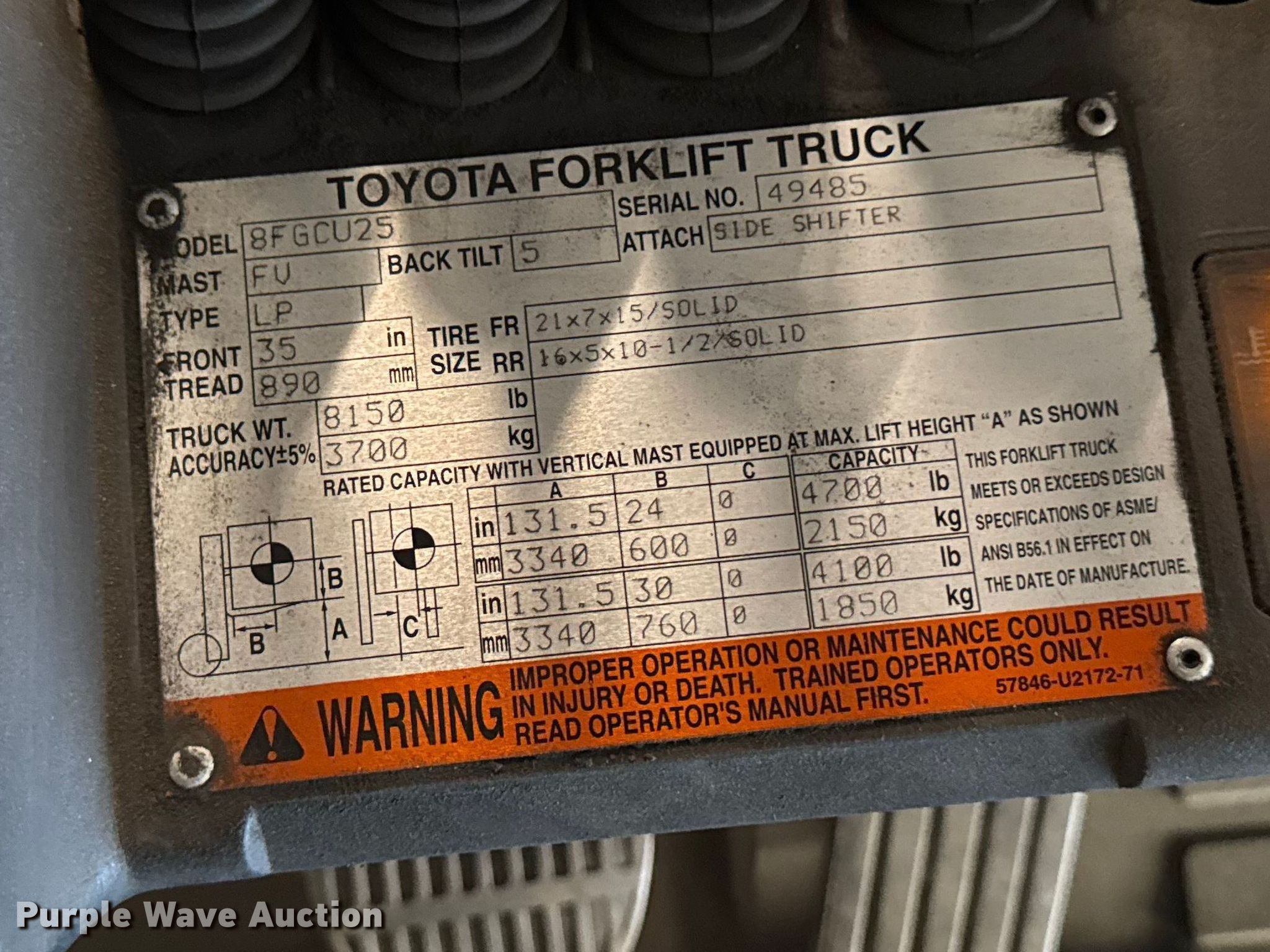 Toyota 8FGCU25 forklift. Hours: 14,108 on meter, Serial: 49485, Unit #: 99. Engine Toyota, Displacement: 2.237L, Cylinders: 4, Fuel type: LPG LP bottle: Not included. Transmission Powershift. Operators station OROPS, Onboard scale system. Features Maximum lift capacity: 4,700 lbs, Maximum lift height: 131", Collapsed mast height: 82", Mast stages: 2, Side shift, Mast tilt, Fork positioner, Fork length: 48". Tires Front: 21x7x15, Rear: 16x5x10.5. Notes Warning indicator: Service, Jump start required during on-site data collection. Standard Forwarding, LLC Strategic Fleet Realignment Sale - Open Inspection April 20th 2026 from 9:00 a.m. to 3:00 p.m.. 2925 Morton Drive. East Moline, IL 61244