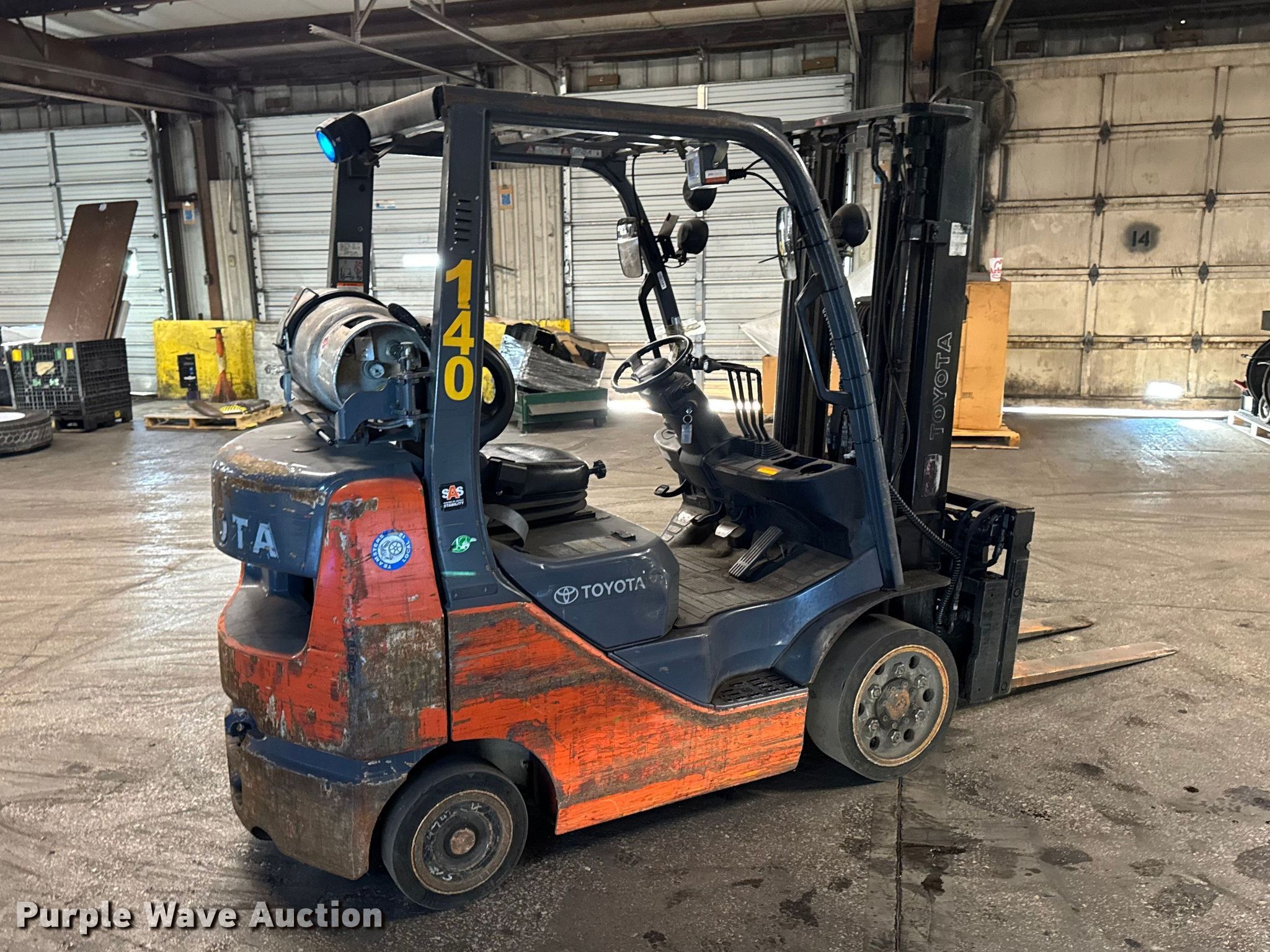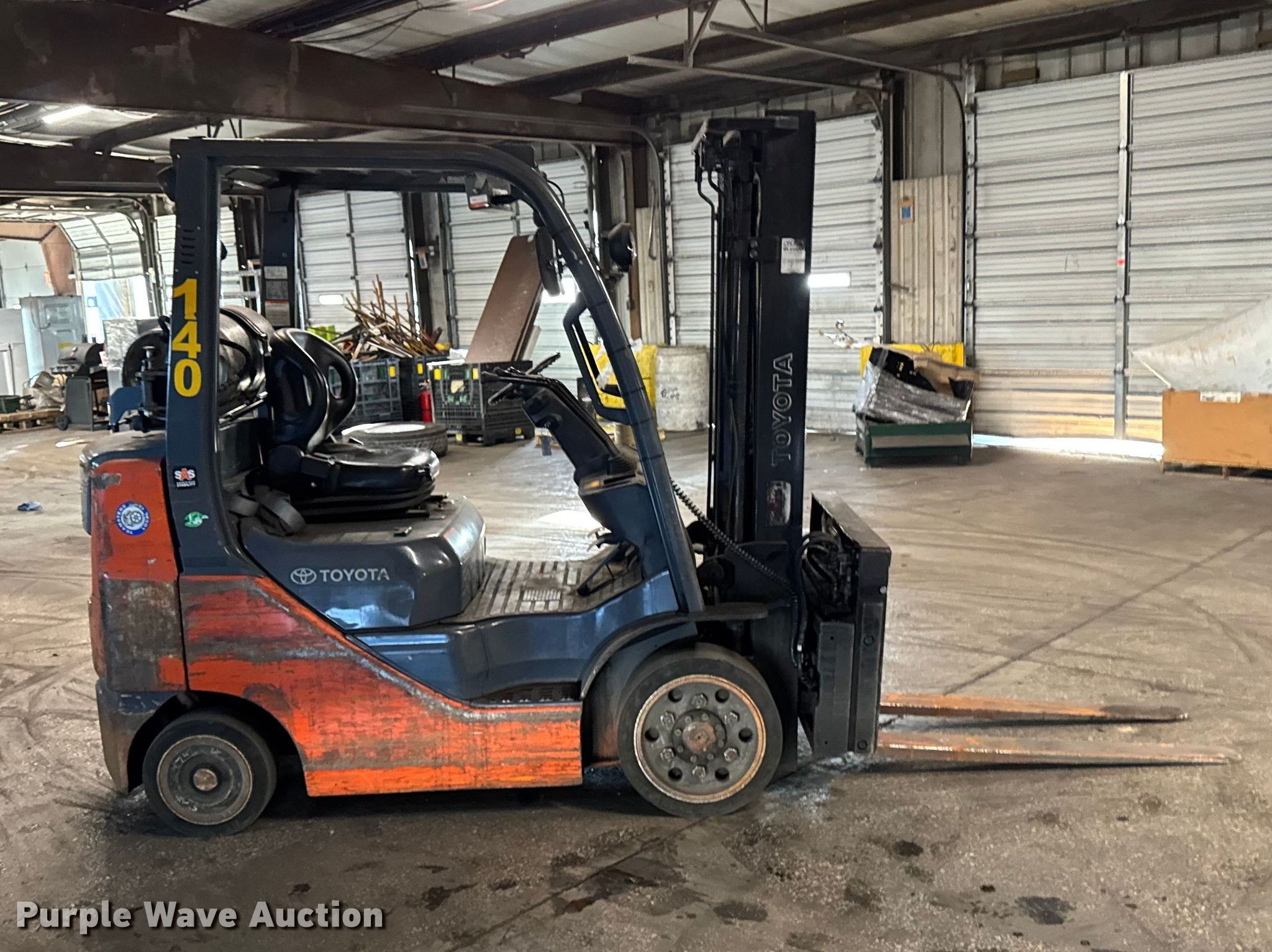 Purple Wave is selling a used Warehouse Forklift in Illinois. This item is a Toyota 8FGCU25 forklift with the following: Hours: 12,457 on meter, Serial: 82705, Unit #: 140