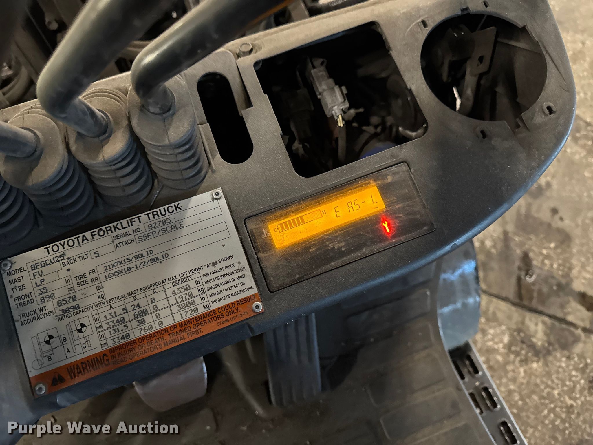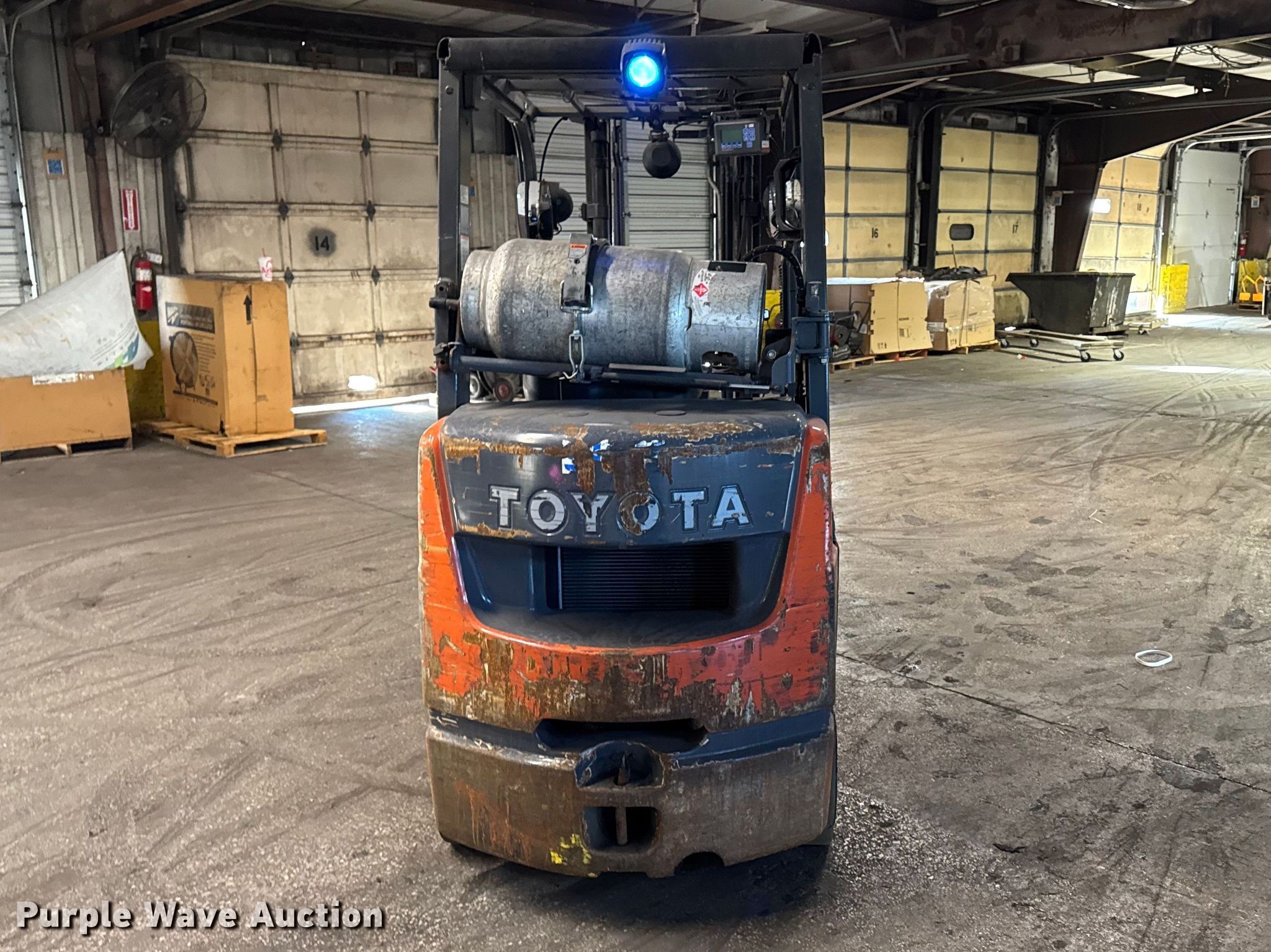Toyota 8FGCU25 forklift. Hours: 12,457 on meter, Serial: 82705, Unit #: 140. Engine Toyota, Displacement: 2.237L, Cylinders: 4, Fuel type: LPG LP bottle: Not included. Transmission Powershift. Operators station OROPS, Onboard scale system. Features Maximum lift capacity: 4,350 lbs, Maximum lift height: 131", Collapsed mast height: 82", Mast stages: 2, Side shift, Mast tilt, Fork positioner, Fork length: 48". Tires Front: 21x7x15, Rear: 16x5x10.5. Notes Warning indicator: Service, EAS-1, Jump start required during on-site data collection. Standard Forwarding, LLC Strategic Fleet Realignment Sale - Open Inspection April 20th 2026 from 9:00 a.m. to 3:00 p.m.. 2925 Morton Drive. East Moline, IL 61244