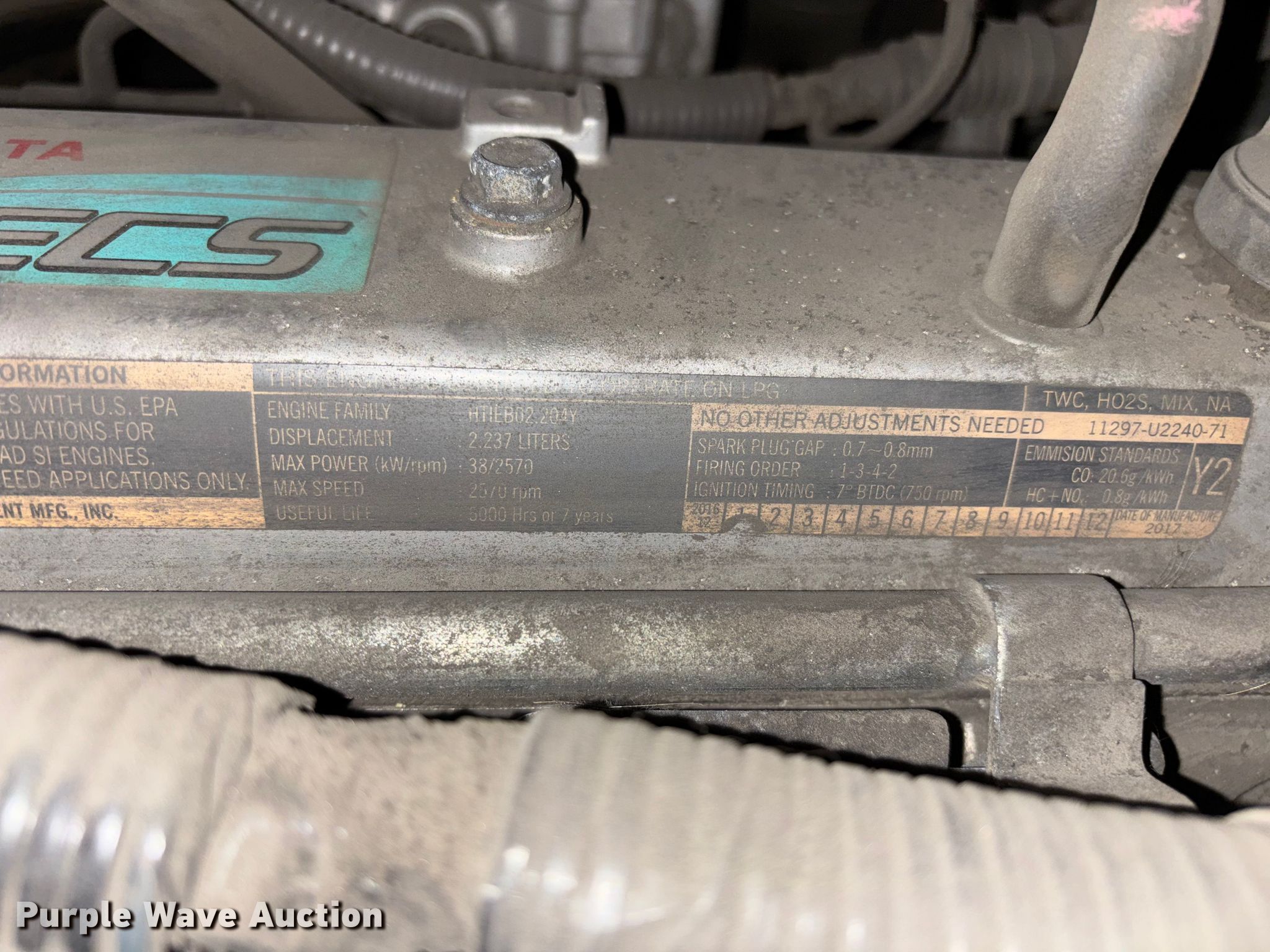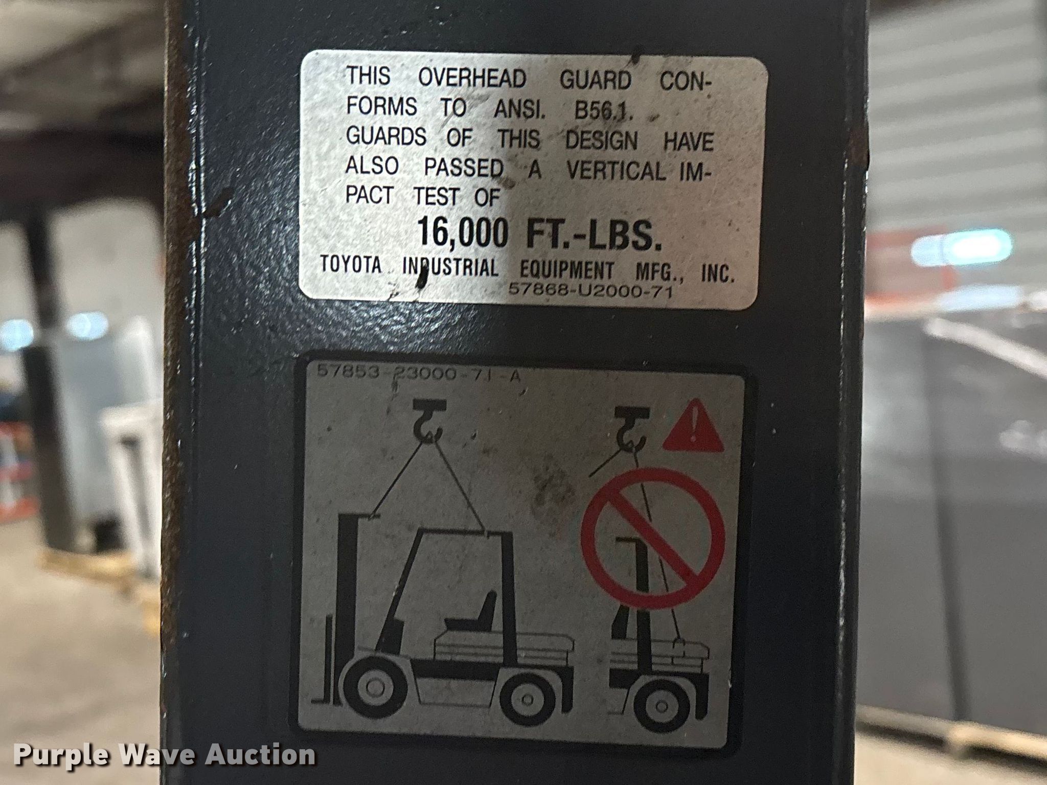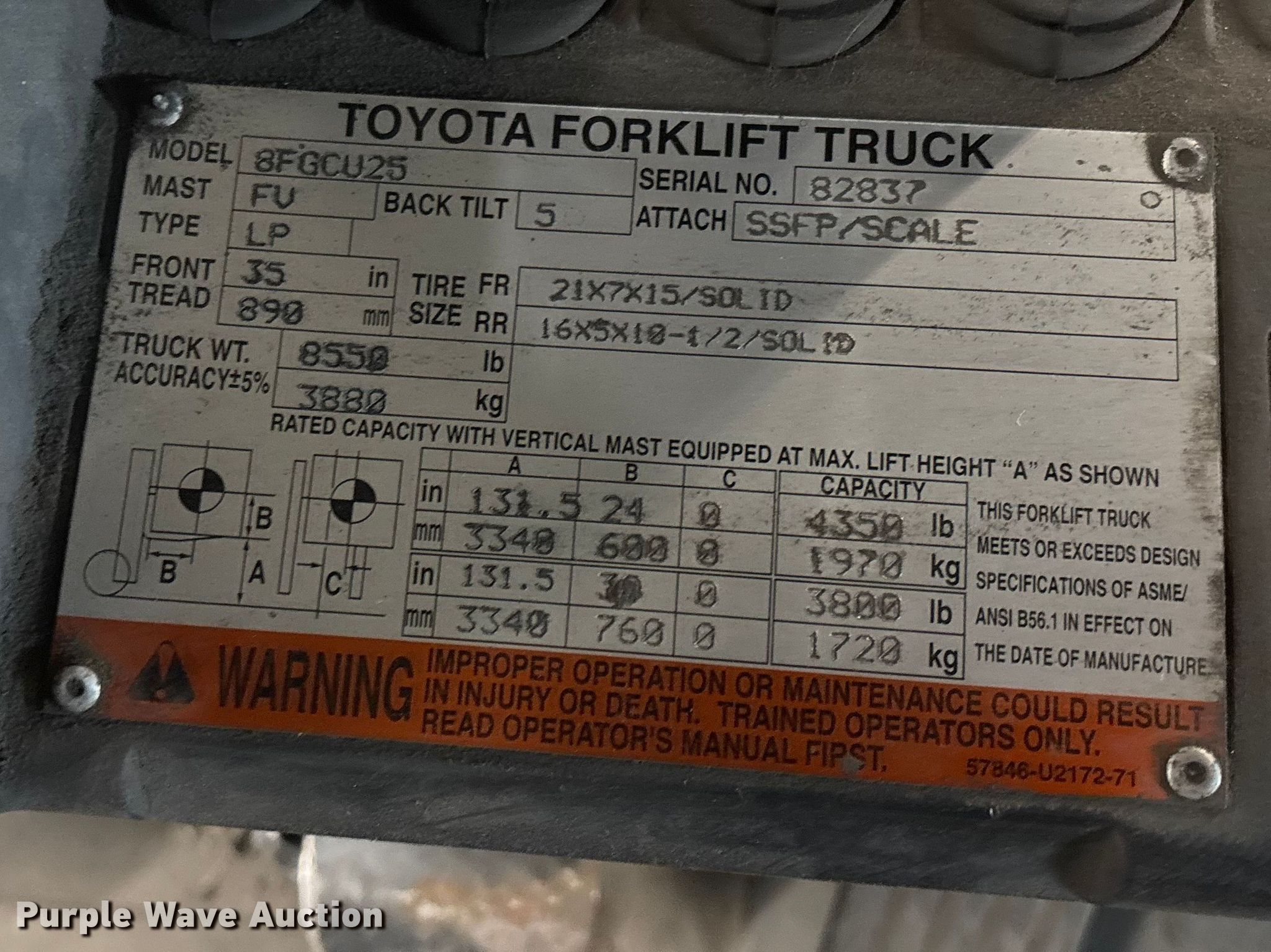 Toyota 8FGCU25 forklift. Hours: 7,703 on meter, Serial: 82837, Unit #: 147. Engine Toyota 4YECS, Displacement: 2.23L, Cylinders: 4, Fuel type: LPG LP bottle: Not included, kW: 38. Transmission Powershift. Operators station OROPS, Onboard scale system. Features Maximum lift capacity: 4,350 lbs, Maximum lift height: 131", Collapsed mast height: 82", Mast stages: 2, Side shift, Mast tilt, Fork positioner, Fork length: 48". Tires Front: 21x7x15, Rear: 16x5x10.5, Solid. Standard Forwarding, LLC Strategic Fleet Realignment Sale - Open Inspection April 20th 2026 from 9:00 a.m. to 3:00 p.m.. 2925 Morton Drive. East Moline, IL 61244