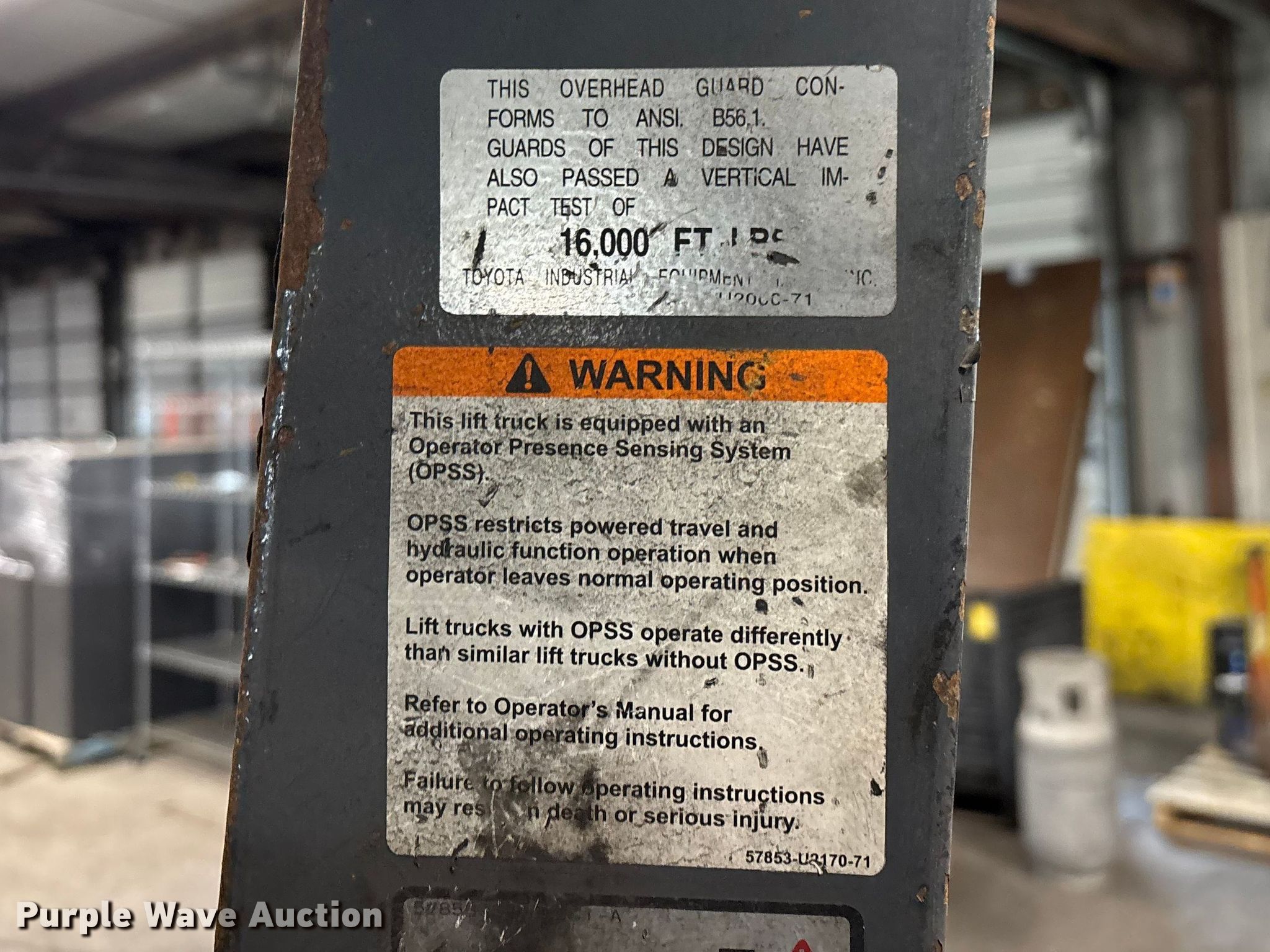 Toyota 8FGCU25 forklift. Hours: 30,373 on meter, Serial: 49661, Unit #: 112. Engine Toyota 4YECS, Displacement: 2.23L, Cylinders: 4, Fuel type: LPG LP bottle: Not included, kW: 38. Transmission Powershift. Operators station OROPS, Onboard scale system. Features Maximum lift capacity: 4,700 lbs, Maximum lift height: 131", Collapsed mast height: 82", Mast stages: 2, Mast tilt, Fork length: 57". Tires Front: 21x7x15, Rear: 16x5x10.5, Solid. Notes Warning indicator: Service. Standard Forwarding, LLC Strategic Fleet Realignment Sale - Open Inspection April 20th 2026 from 9:00 a.m. to 3:00 p.m.. 2925 Morton Drive. East Moline, IL 61244