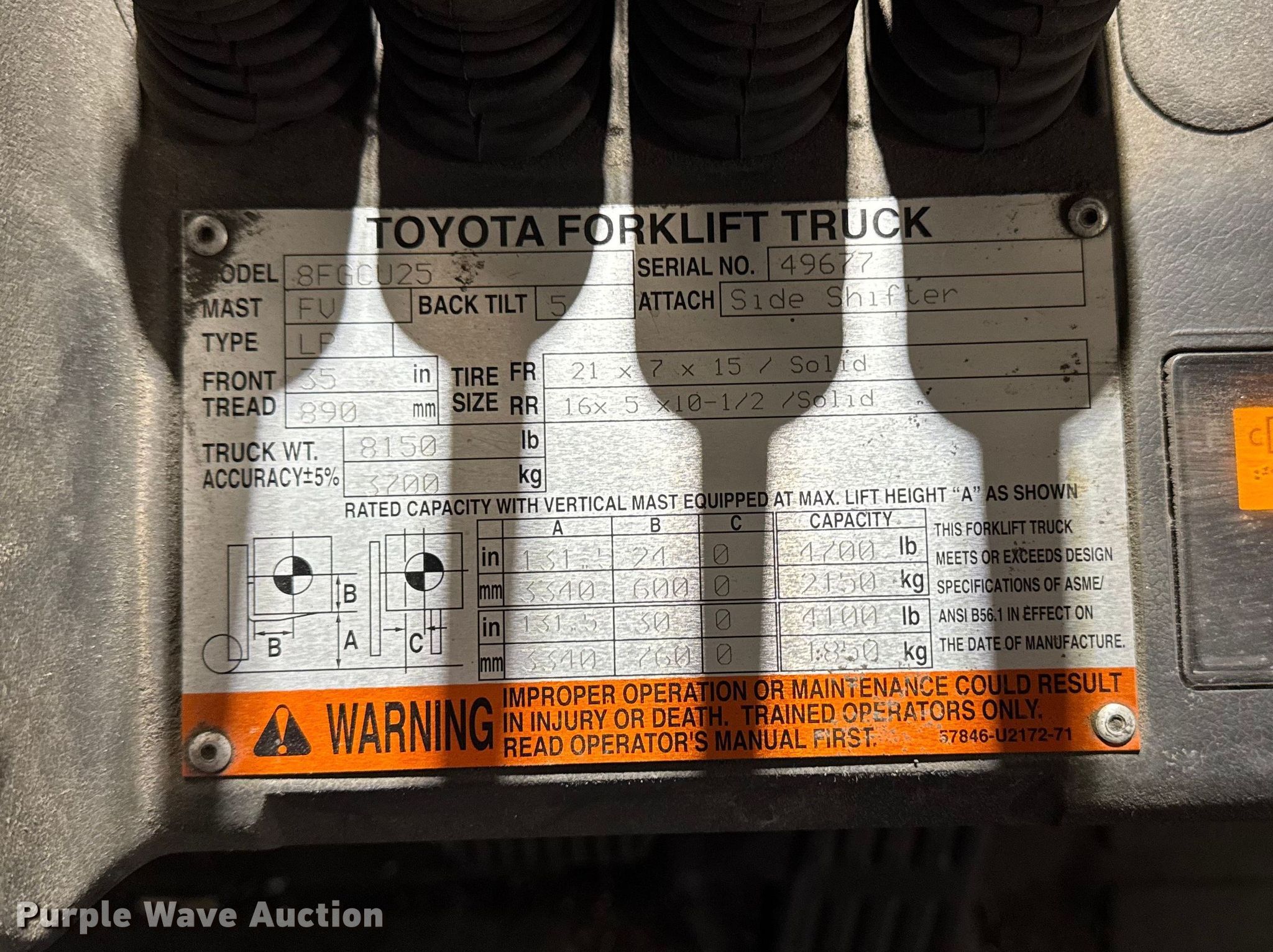 Toyota 8FGCU25 forklift. Hours: 10,954 on meter, Serial: 49677, Unit #: 117. Engine Toyota, Displacement: 2.237L, Cylinders: 4, Fuel type: LPG LP bottle: Not included. Transmission Powershift. Operators station OROPS, Onboard scale system. Features Maximum lift capacity: 4,700 lbs, Maximum lift height: 131", Collapsed mast height: 82", Mast stages: 2, Side shift, Mast tilt, Fork positioner, Fork length: 48". Tires Front: 21x7x15, Rear: 16x5x10.5. Notes Jump start required during on-site data collection. Standard Forwarding, LLC Strategic Fleet Realignment Sale - Open Inspection April 20th 2026 from 9:00 a.m. to 3:00 p.m.. 2925 Morton Drive. East Moline, IL 61244