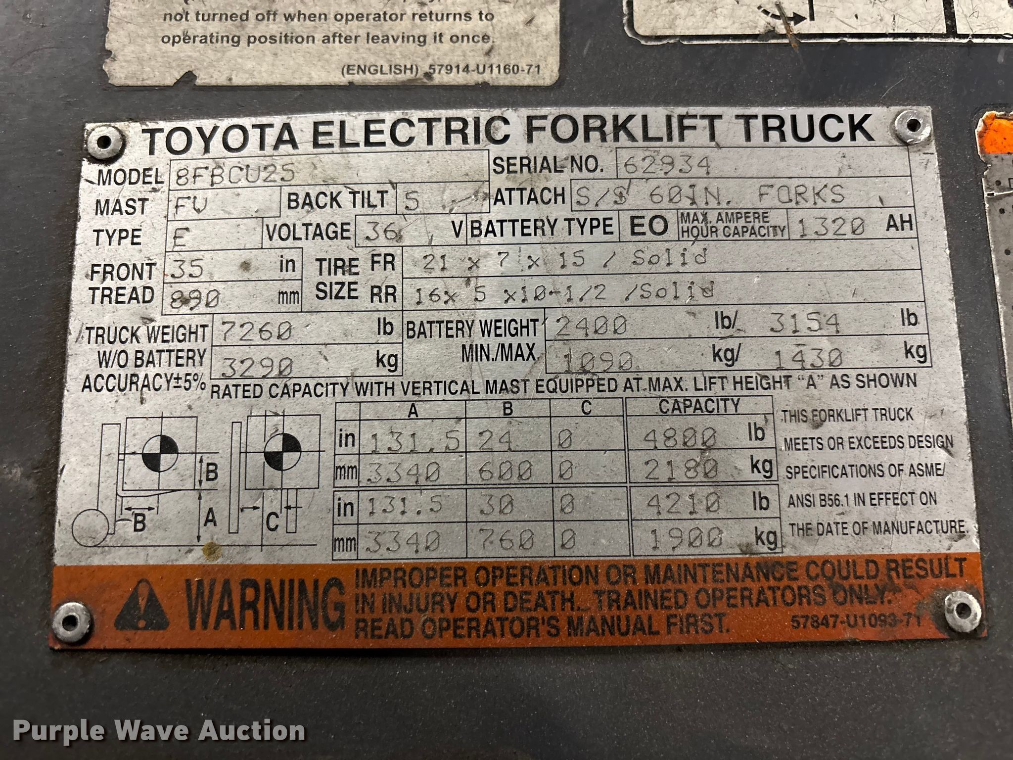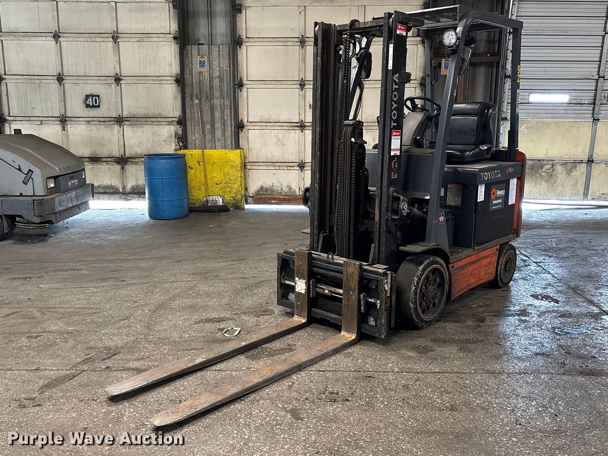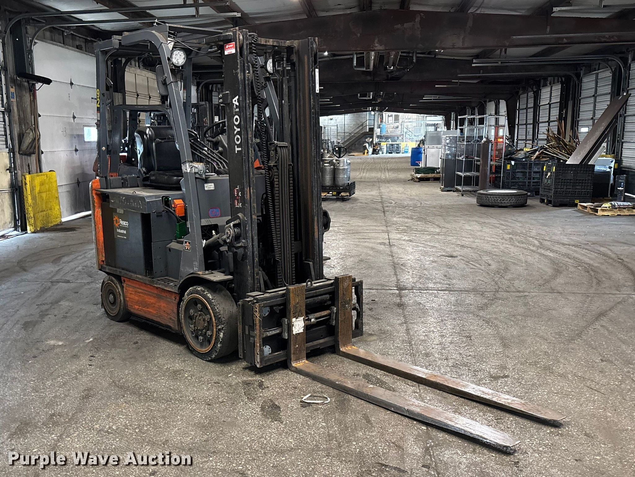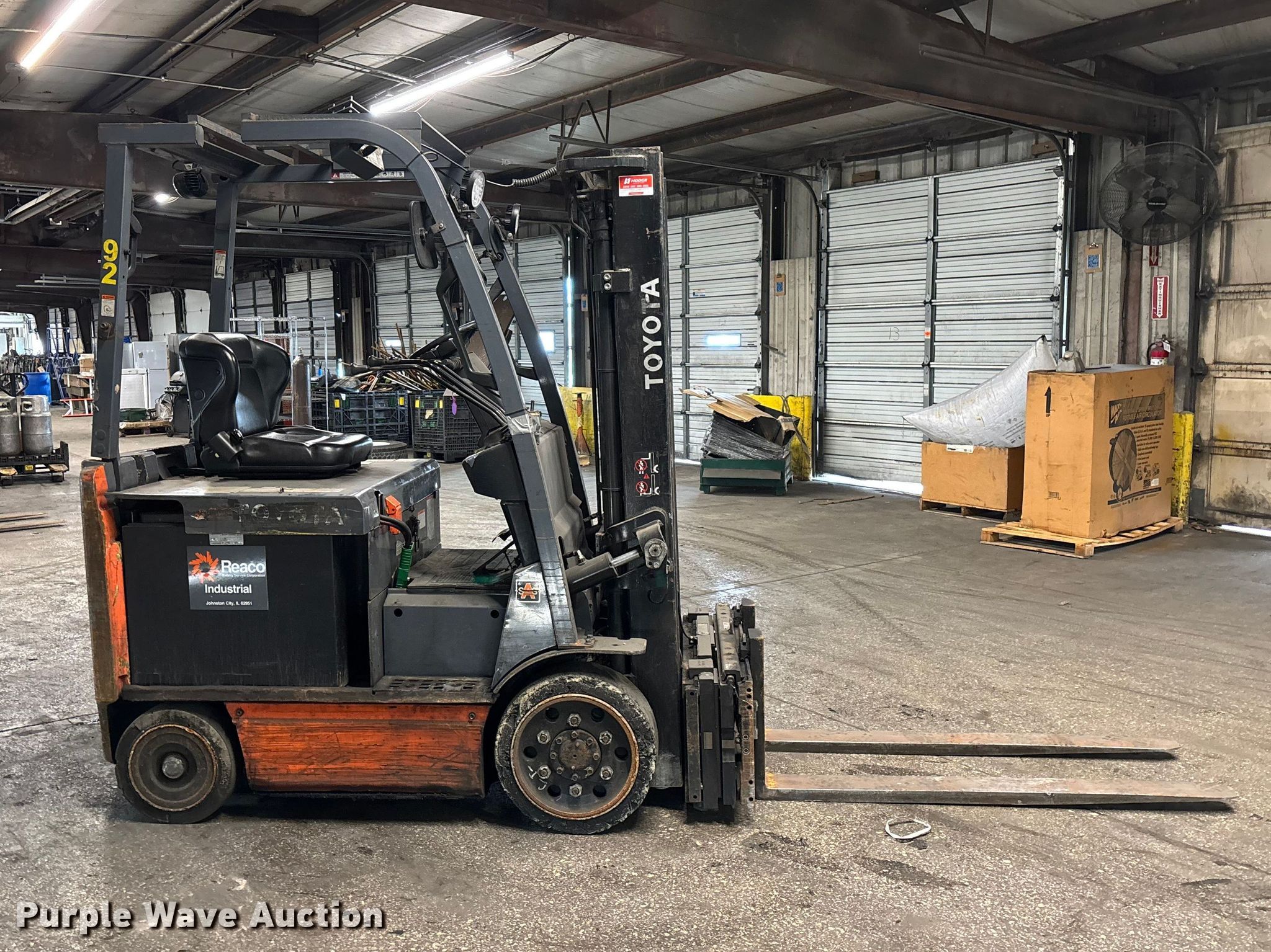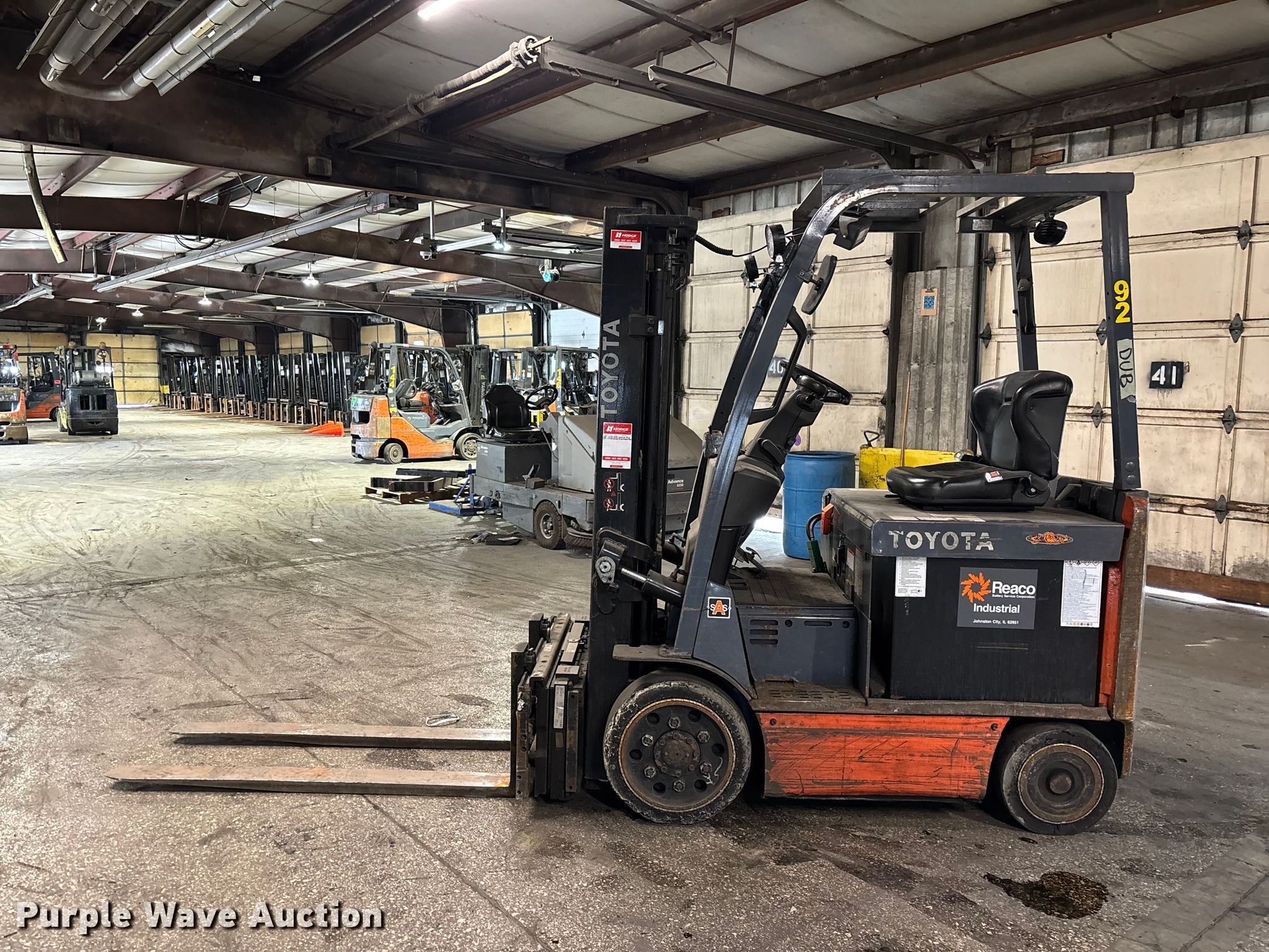 Purple Wave is selling a used Warehouse Forklift in Illinois. This item is a Toyota 8FBCU25 forklift with the following: Hours: 22,519 on meter, Serial: 62934, Unit #: 92