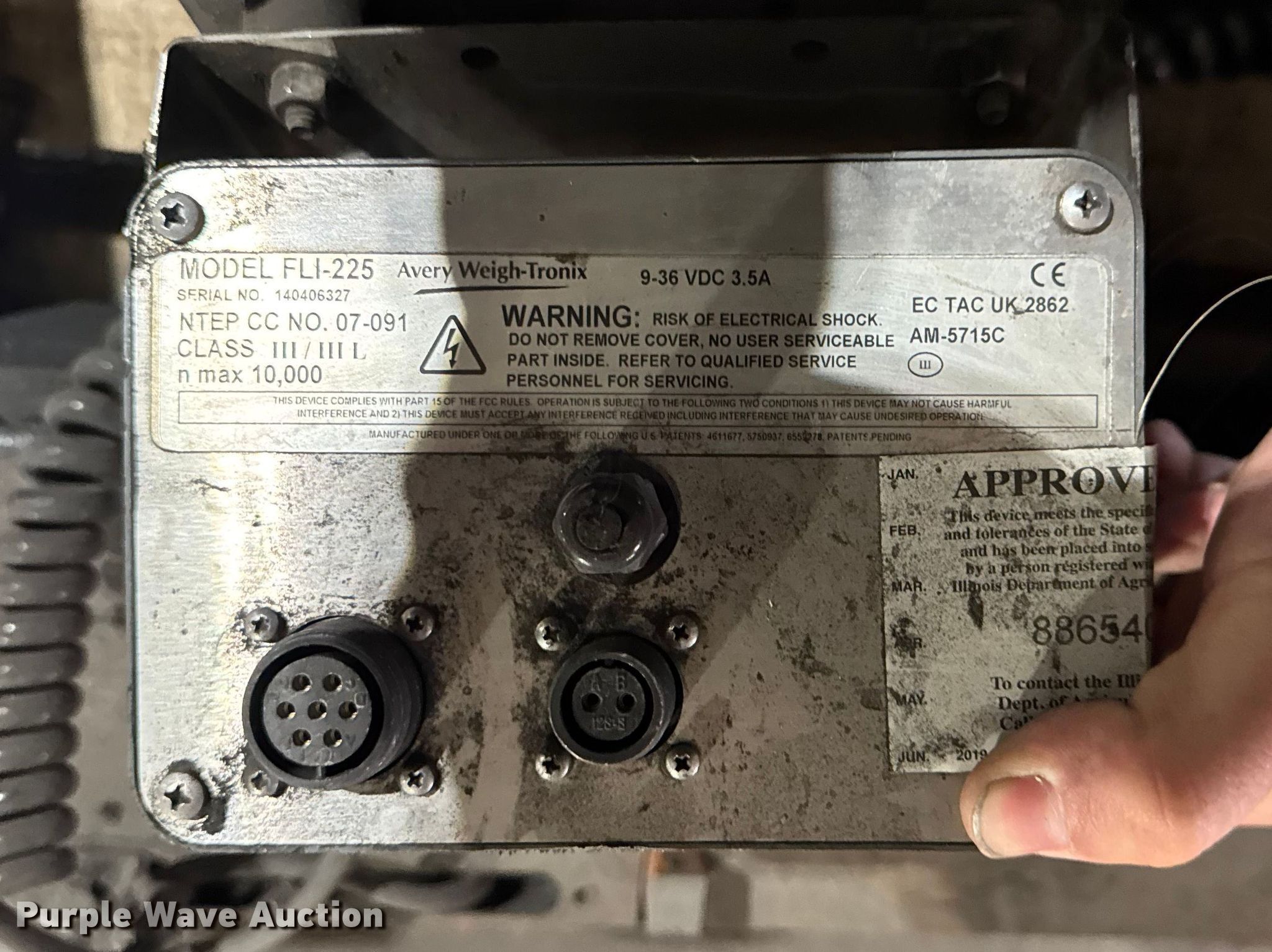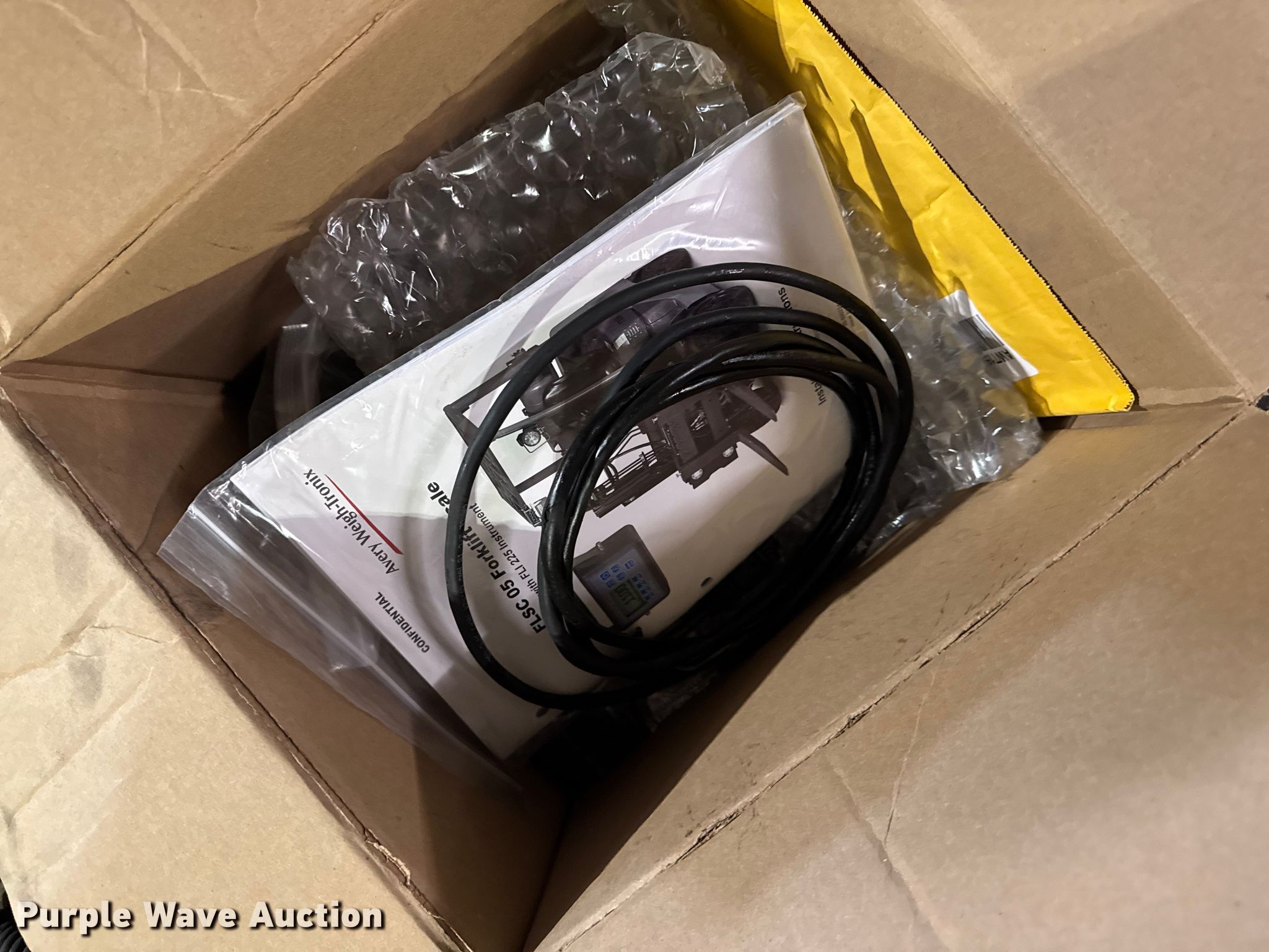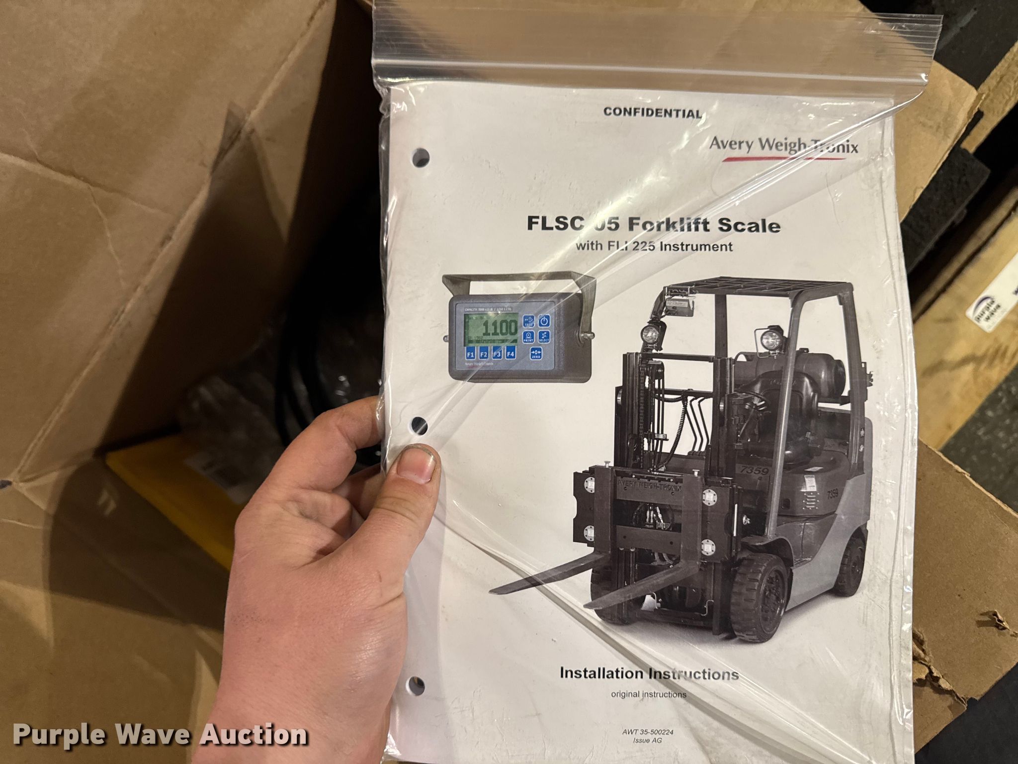 Purple Wave is selling a used Forklift Attach. in Illinois. This item is a 2014 Avery Weigh-Tronix FLSC-05 forklift scale with the following: Serial: 141705909, Capacity: 5,000 lbs, Avery Weigh-Tronix FLI-225 display