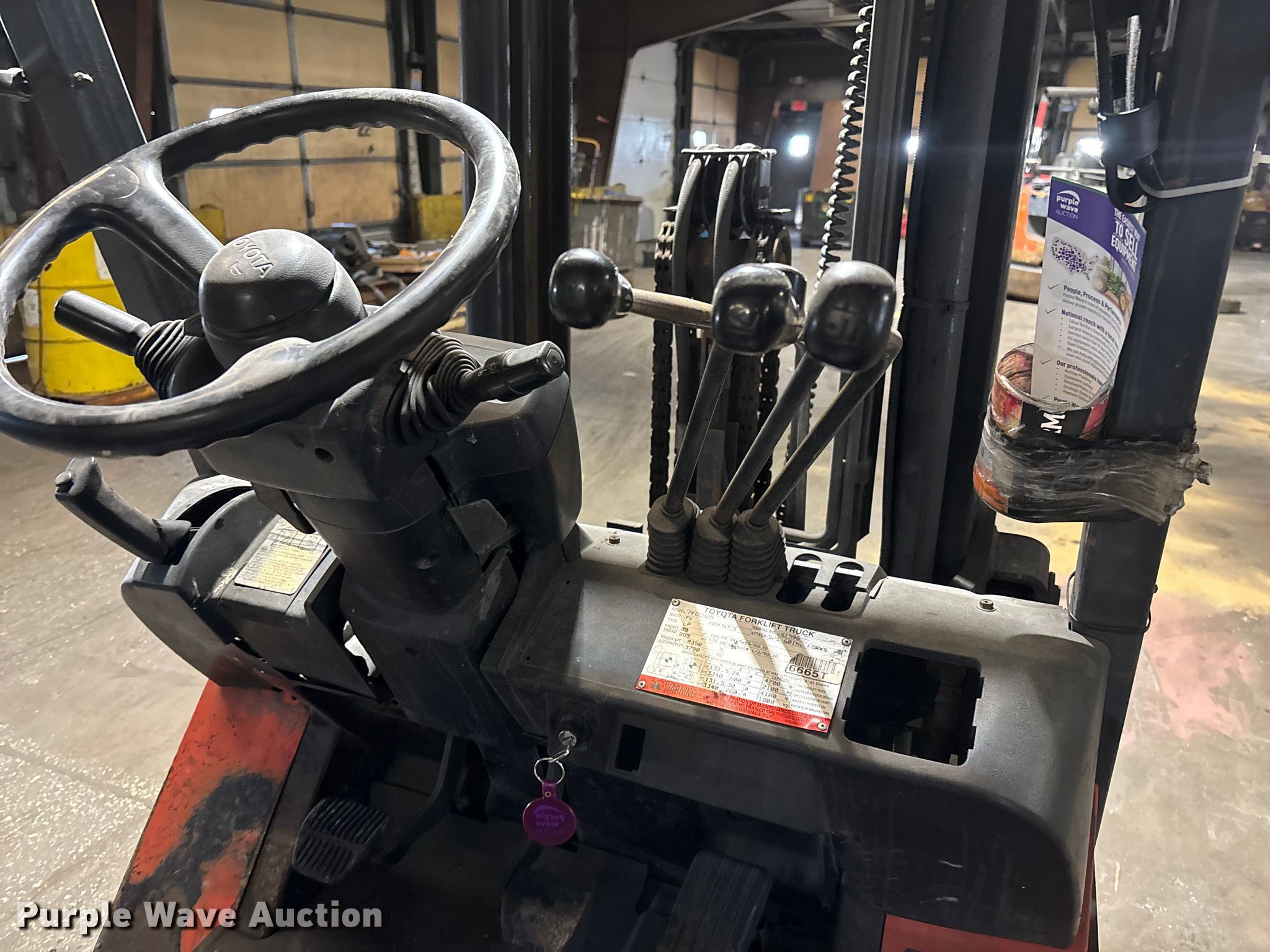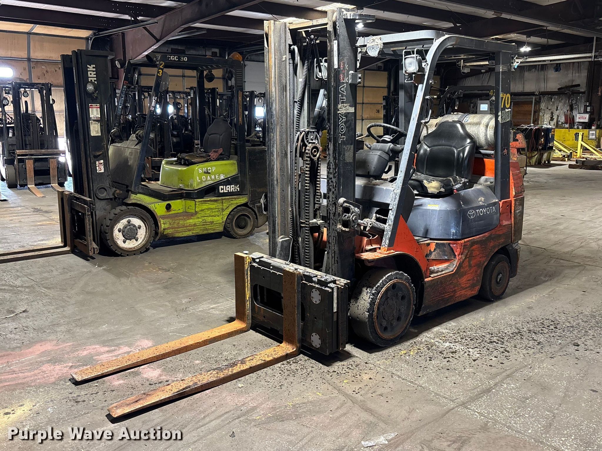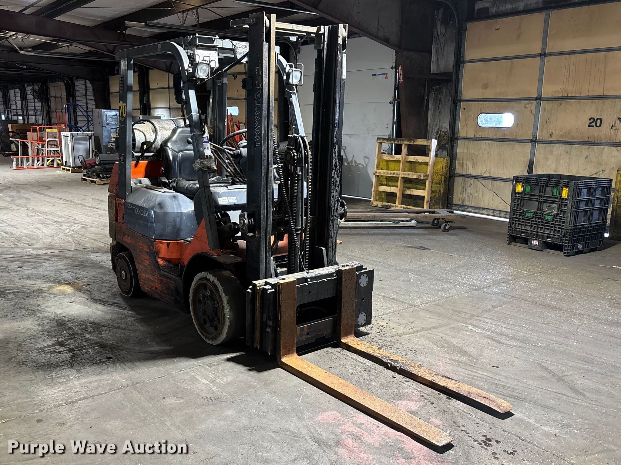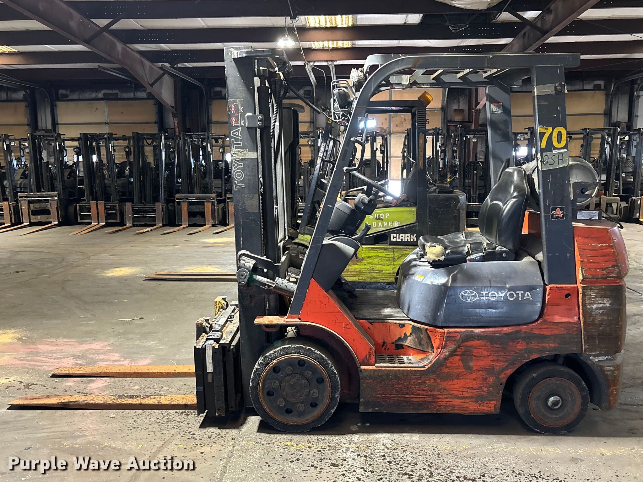 Purple Wave is selling a used Warehouse Forklift in Illinois. This item is a Toyota 7FGCU25 forklift with the following: Hours: 28,679 on meter, Serial: 91596, Unit #: 70