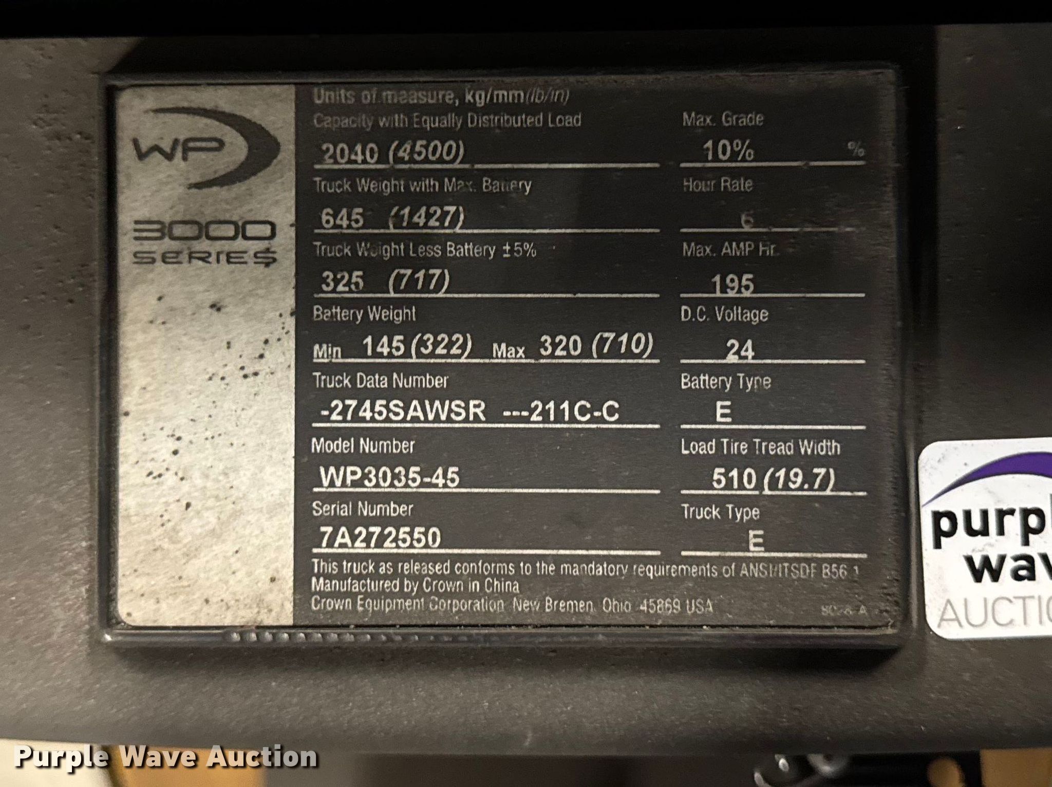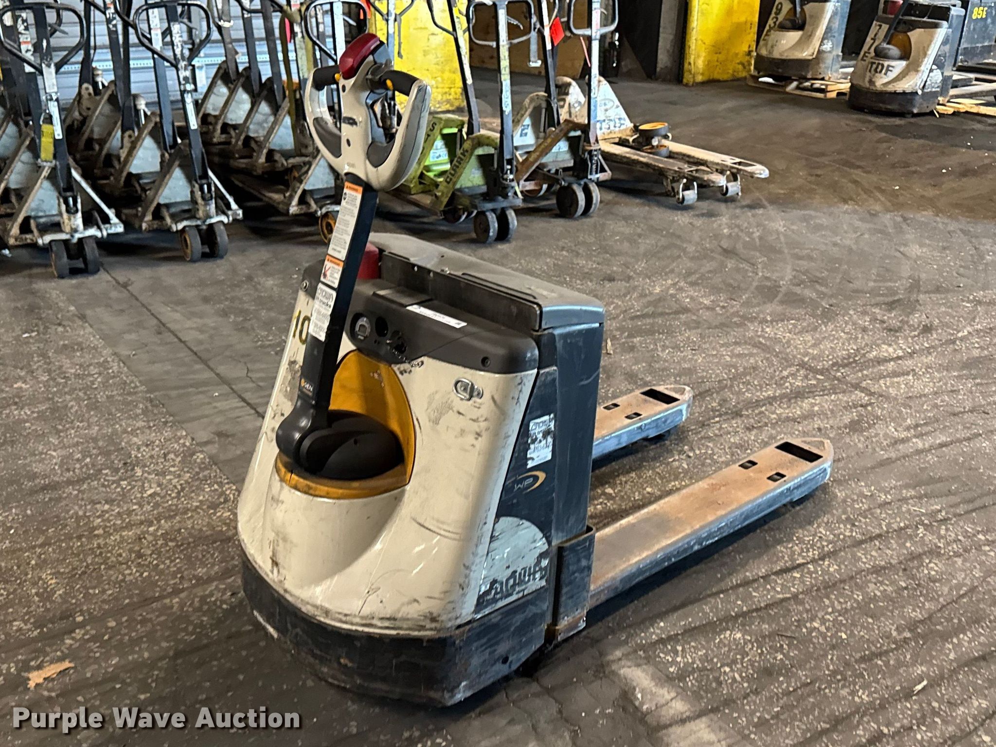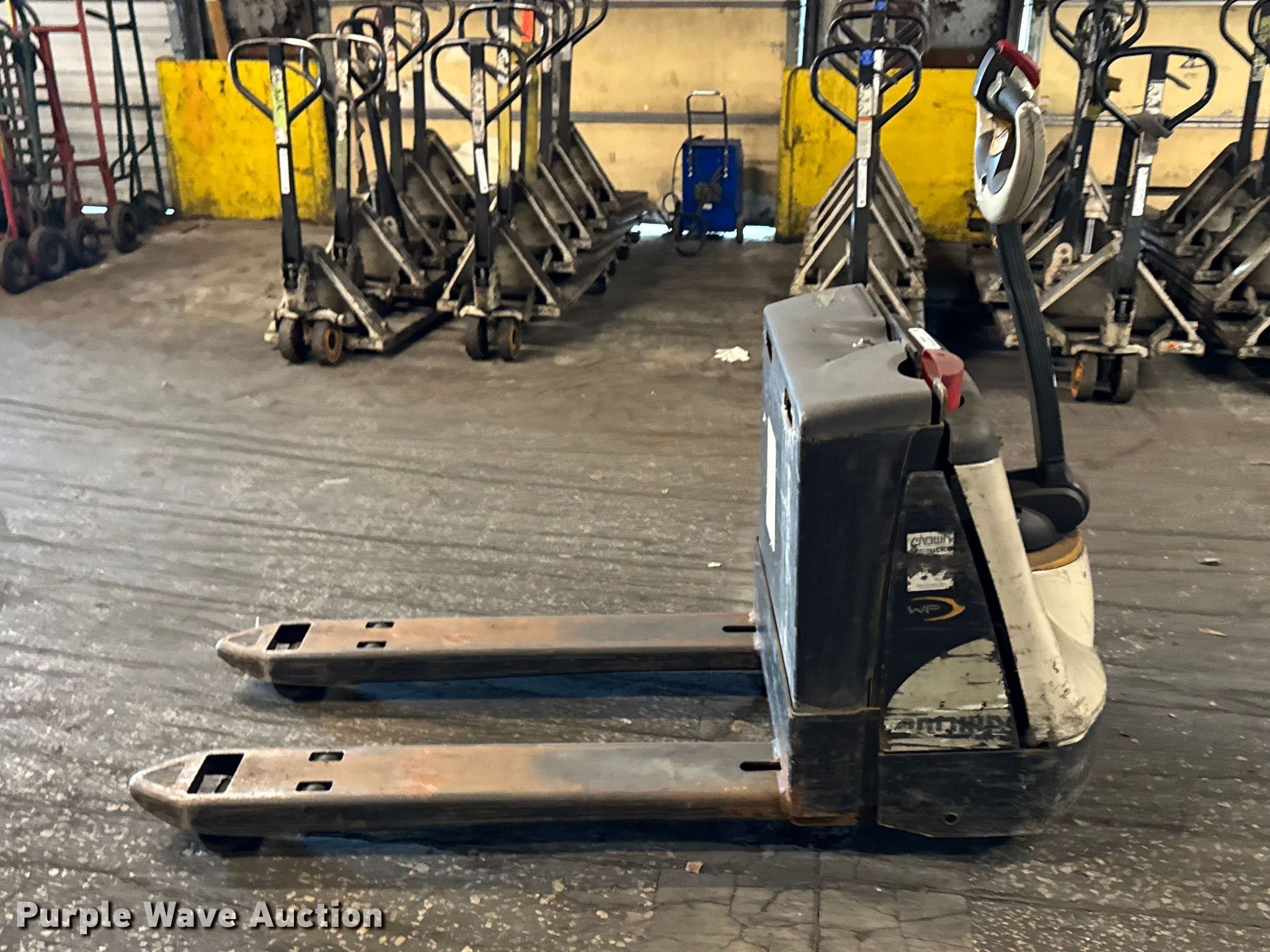 Purple Wave is selling a used Warehouse Forklift in Illinois. This item is a Crown WP3035-45 pallet jack with the following: Serial: 7A272550, Unit #: 100E