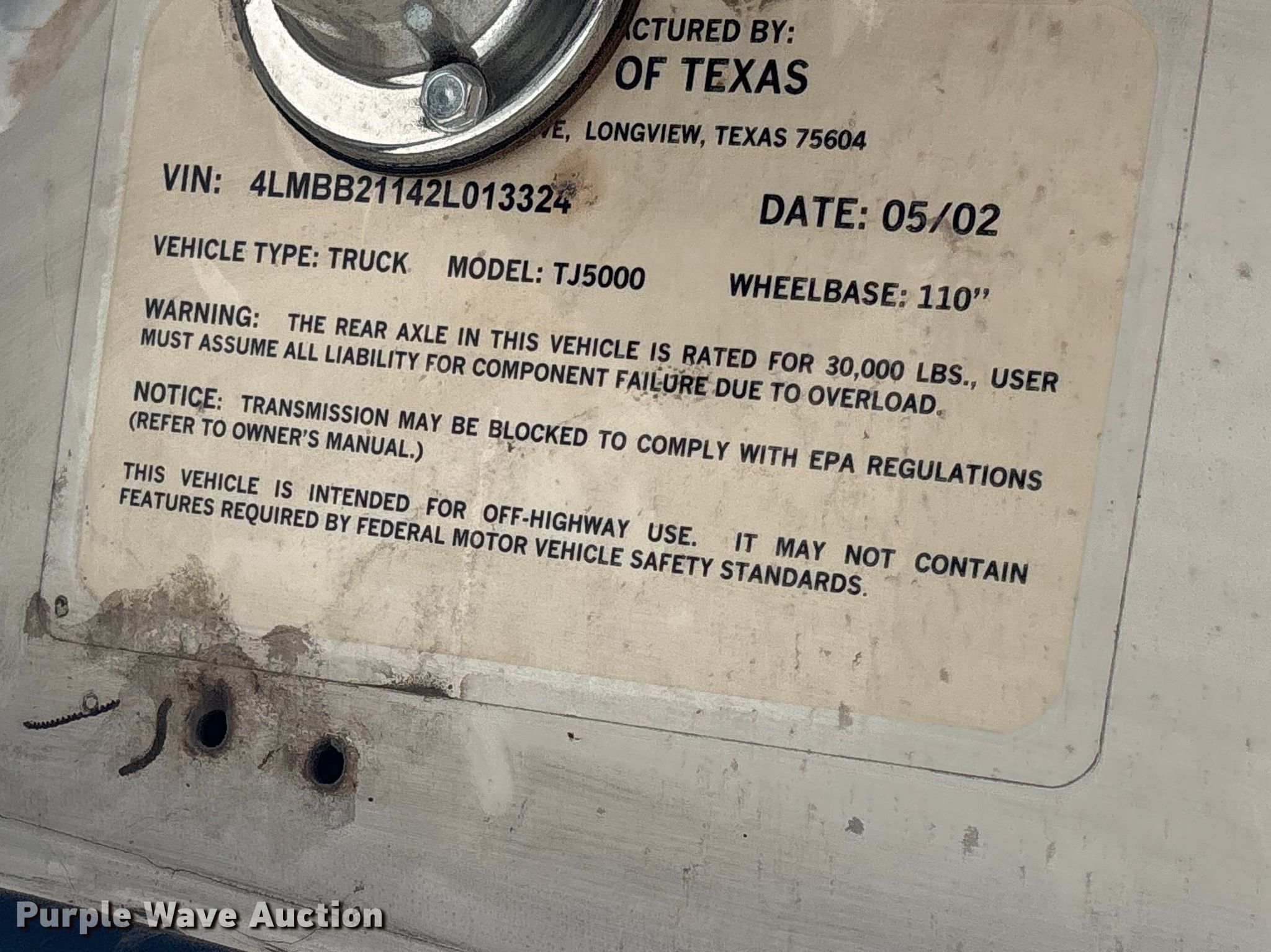 2002 Capacity TJ5000 yard truck. Hours: 41,896 on meter, VIN: 4LMBB21142L013324, Unit #: 471. Engine Cummins B5.9-C, Serial: 46202913, Displacement: 5.9L, Cylinders: 6, Fuel type: Diesel, HP: 173, kW: 129. Transmission Allison, Automatic. Chassis Axles: Single, Brakes: Air, Wheelbase: 116". Interior Heated mirrors, Air ride cab. Features Deck plate: Steel, Fifth wheel type: Hydraulic lift, Fuel tank: Single. Tires Size: 11R22.5. Notes Ignition issues, does not shut off with key. This is worksite support equipment and will not come with a title. Transfer of ownership documentation will be a bill of sale. Standard Forwarding, LLC Strategic Fleet Realignment Sale - Open Inspection April 20th 2026 from 9:00 a.m. to 3:00 p.m.. 2925 Morton Drive. East Moline, IL 61244