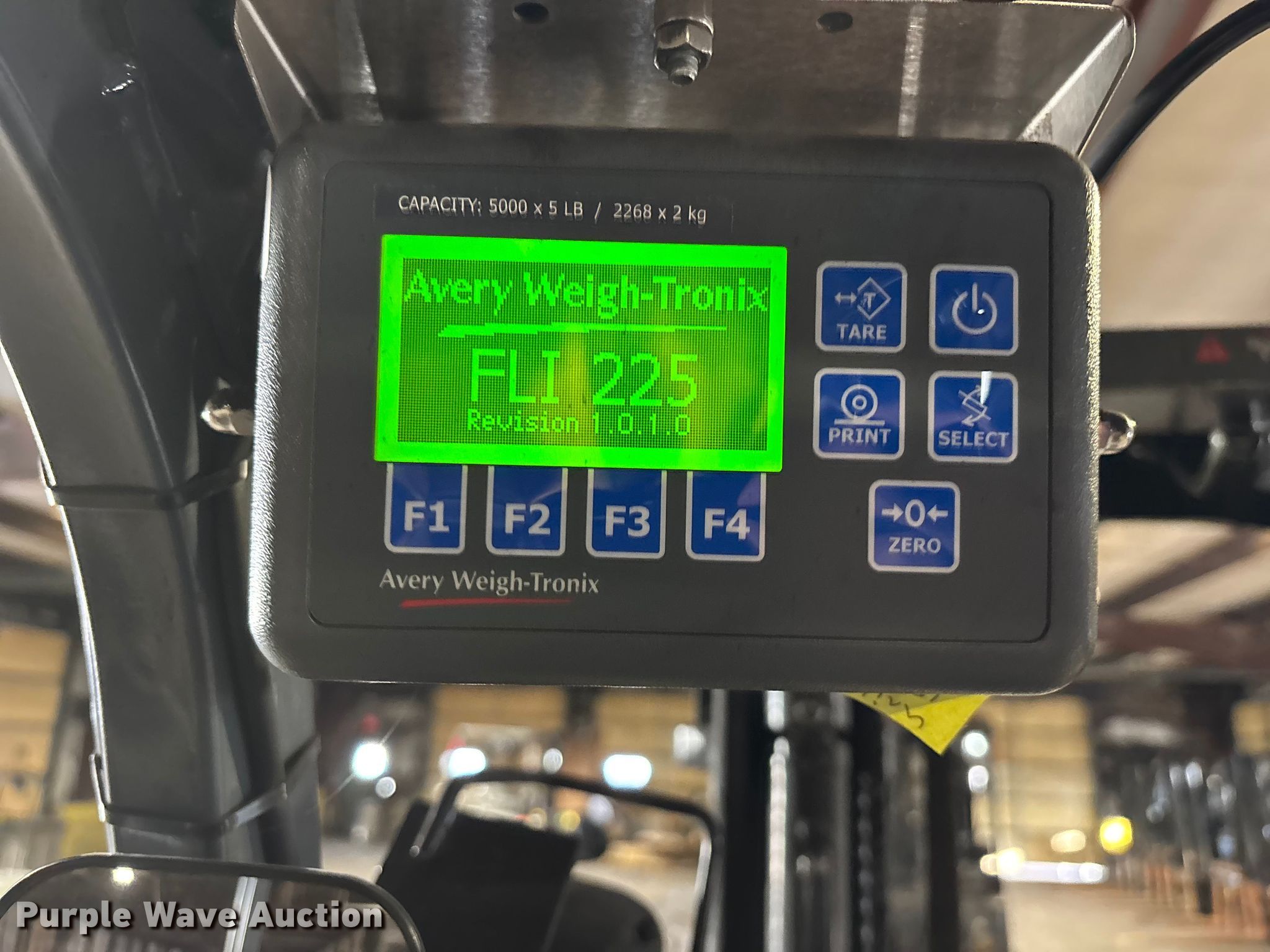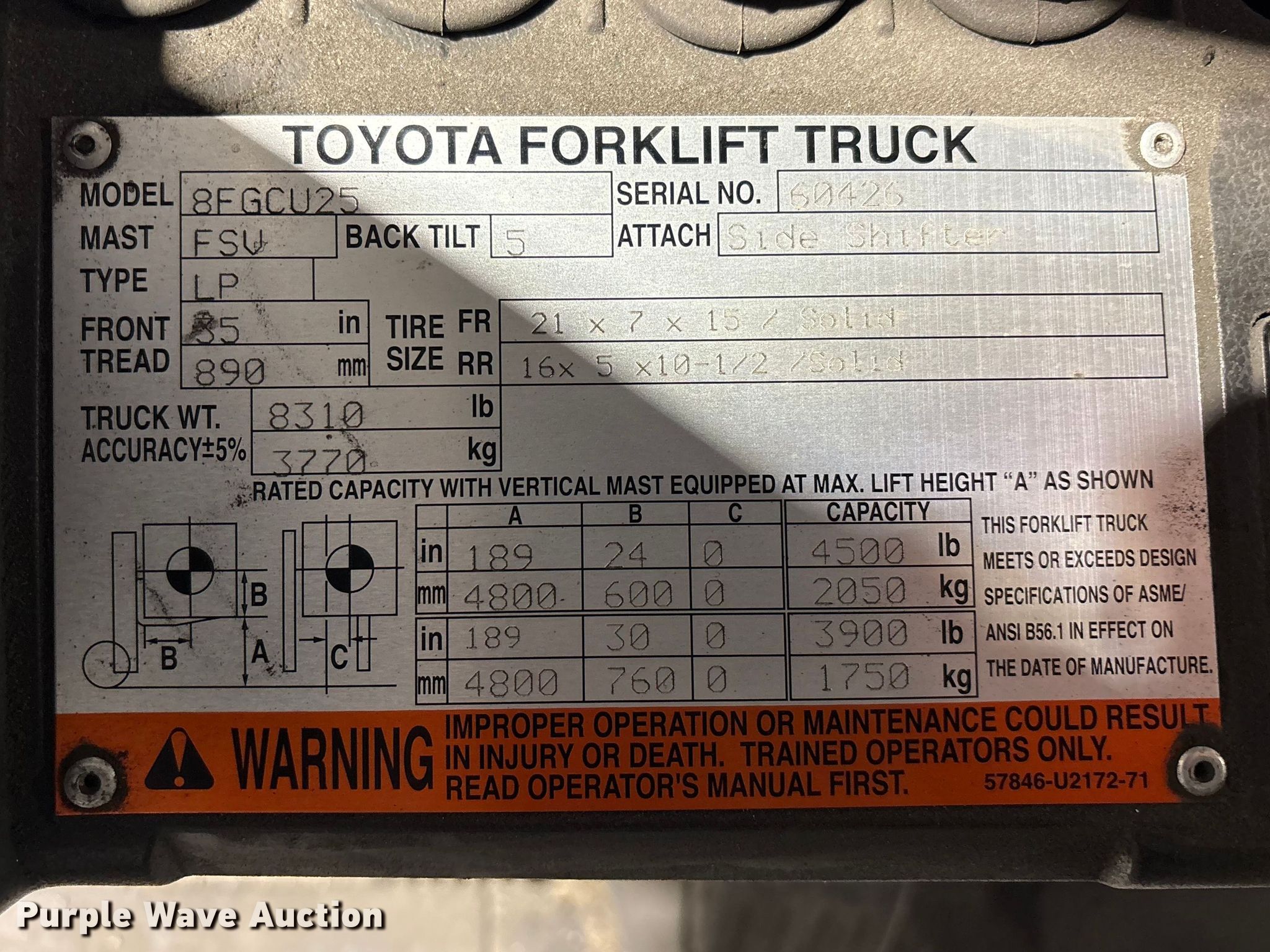 Toyota 8FGCU25 forklift. Hours: 9,512 on meter, Miles or hours may vary, unit still in use, Serial: 60426, Unit #: 127. Engine Toyota 4YECS, Displacement: 2.23L, Cylinders: 4, Fuel type: LPG LP bottle: Not included, kW: 38. Transmission Powershift. Operators station Onboard scale system 2024 Avery Weigh-Tronix FLSC-05 scale, Capacity: 5,000 lbs. Features Maximum lift capacity: 4,500 lbs, Maximum lift height: 186", Collapsed mast height: 82", Mast stages: 3, Side shift, Mast tilt, Fork positioner, Fork length: 48". Tires Front: 21x7x15, Rear: 16x5x10-1/2, Solid. Standard Forwarding, LLC Strategic Fleet Realignment Sale - Open Inspection April 20th 2026 from 9:00 a.m. to 3:00 p.m.. 2925 Morton Drive. East Moline, IL 61244
