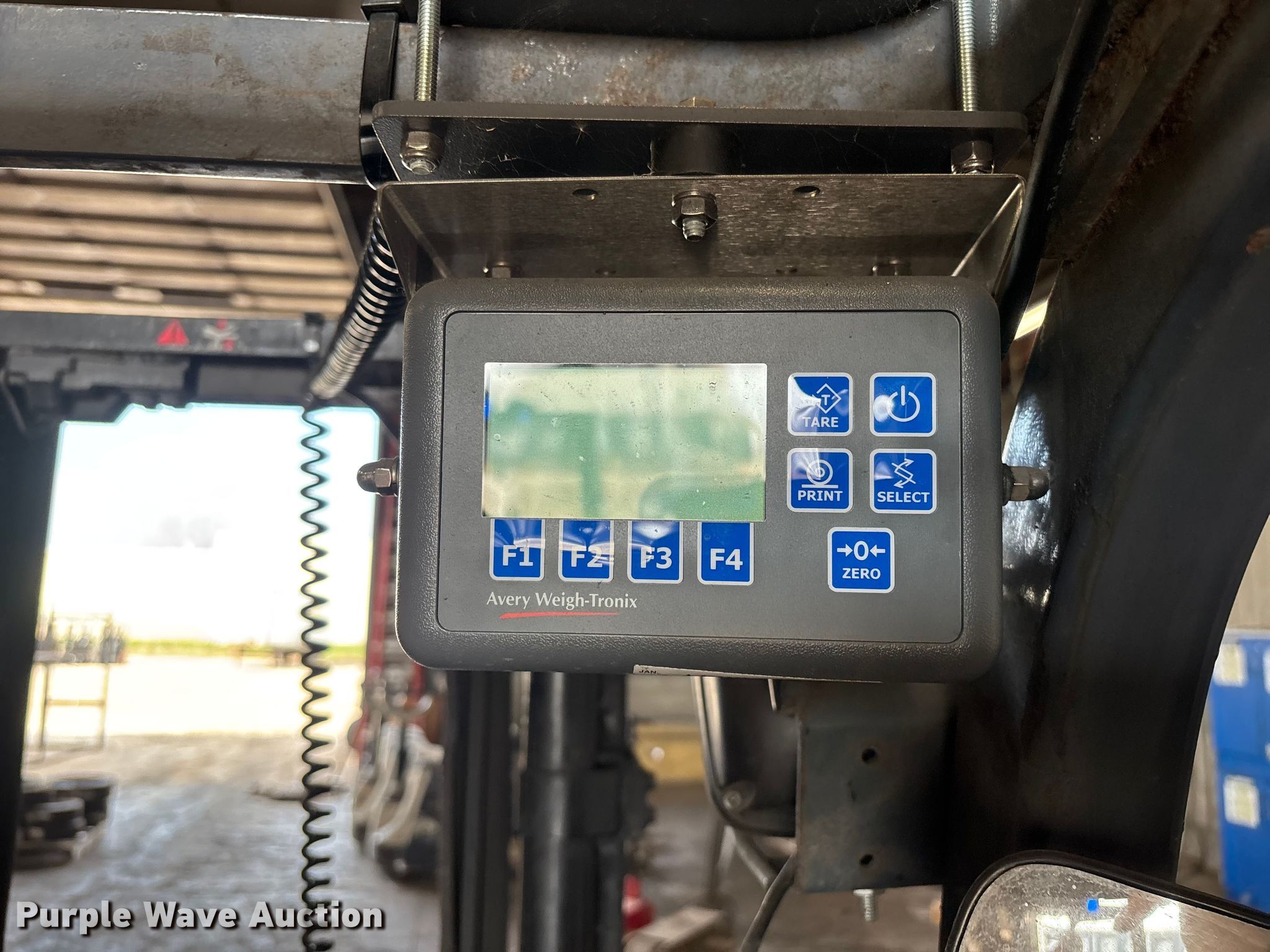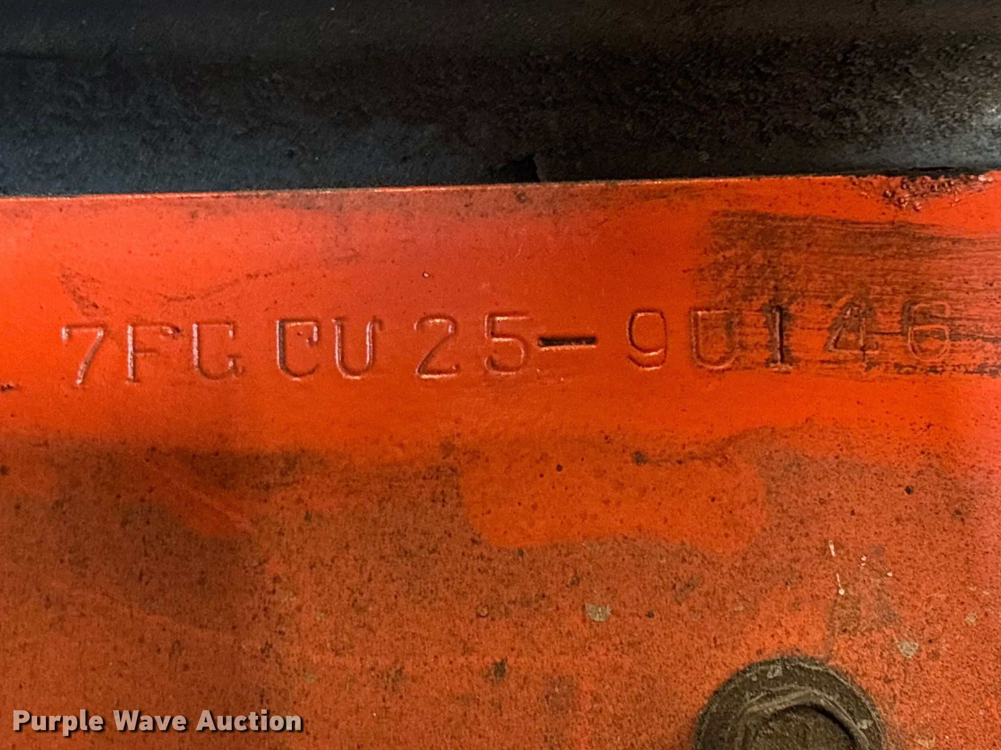 Toyota 7FGCU25 forklift. Hours: 16,682 on meter, Serial: 90146, Unit #: 63. Engine Toyota, Displacement: 2.23L, Cylinders: 1, Fuel type: LPG LP bottle: Not included, kW: 33. Transmission Powershift. Operators station OROPS, Onboard scale system 2024 Avery Weigh-Tronix FLSC-05 scale, Capacity: 5,000 lbs. Features Collapsed mast height: 82", Mast stages: 2, Side shift, Mast tilt, Fork length: 42". Tires Front: 21x7x15, Rear: 16x5x10-1/2, Solid. Standard Forwarding, LLC Strategic Fleet Realignment Sale - Open Inspection April 20th 2026 from 9:00 a.m. to 3:00 p.m.. 2925 Morton Drive. East Moline, IL 61244