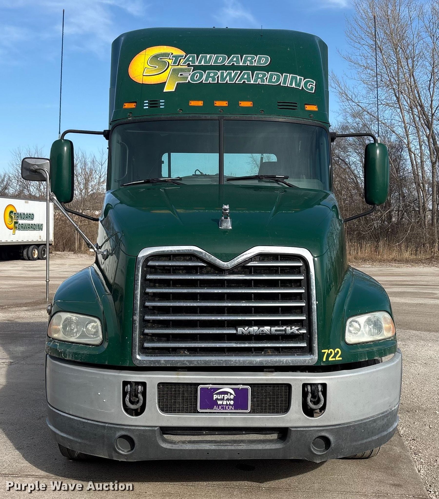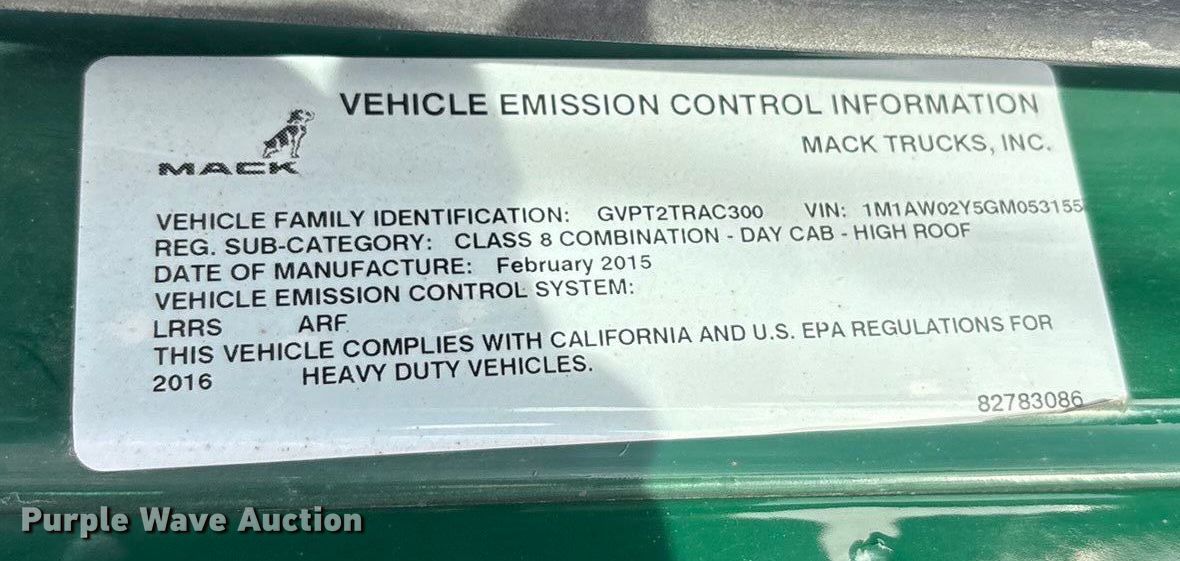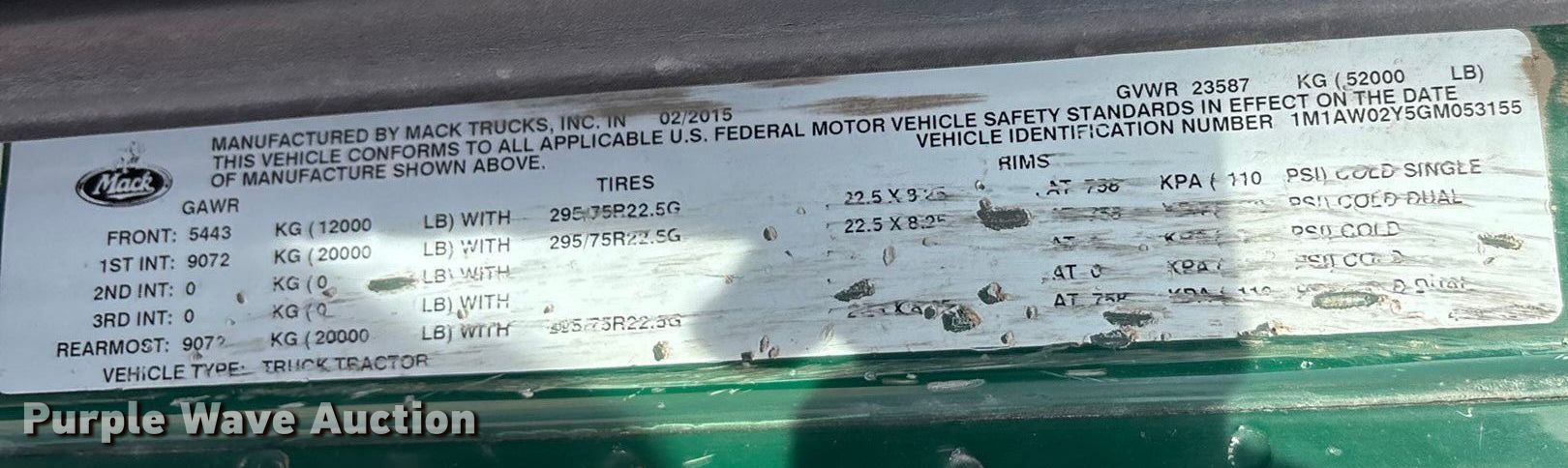 2016 Mack CXU613 semi truck. Miles: 788,186 on odometer, VIN: 1M1AW02Y5GM053155, Unit #: 722. Engine Mack MP7-395C, Serial: 570204, Displacement: 10.8L, Cylinders: 6, Fuel type: Diesel, HP: 395, Engine brake. Transmission Mack mDrive, Automated manual. Chassis Axles: Tandem, Differential lock: Inter-axle, Suspension: Air Dump valves, Brakes: Air, GVWR: 52,000 lbs FAWR: 12,000 lbs, IAWR: 20,000 lbs, RAWR: 20,000 lbs. Interior AC, Heat, Heated mirrors, Cruise control, Air ride cab. Features Deck plate: Aluminum, Fifth wheel type: Fixed, Fuel tank: Dual. Tires Size: 295/75R22.5. Notes Dash warning indicator: Check engine, Transmission low air supply, Electrical fault. Indiana title. Title distribution may be delayed up to 30 days from verification of funds. Standard Forwarding, LLC Strategic Fleet Realignment Sale - Open inspection April 20th 2026 from 9:00 a.m. to 3:00 p.m.. 2925 Morton Drive. East Moline, IL 61244