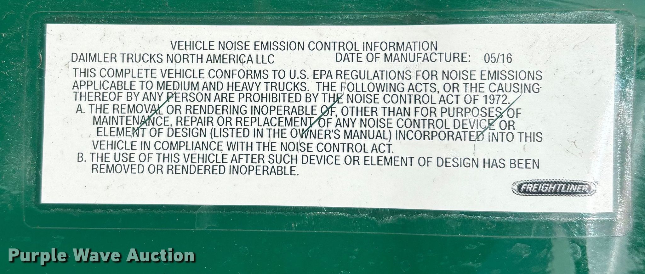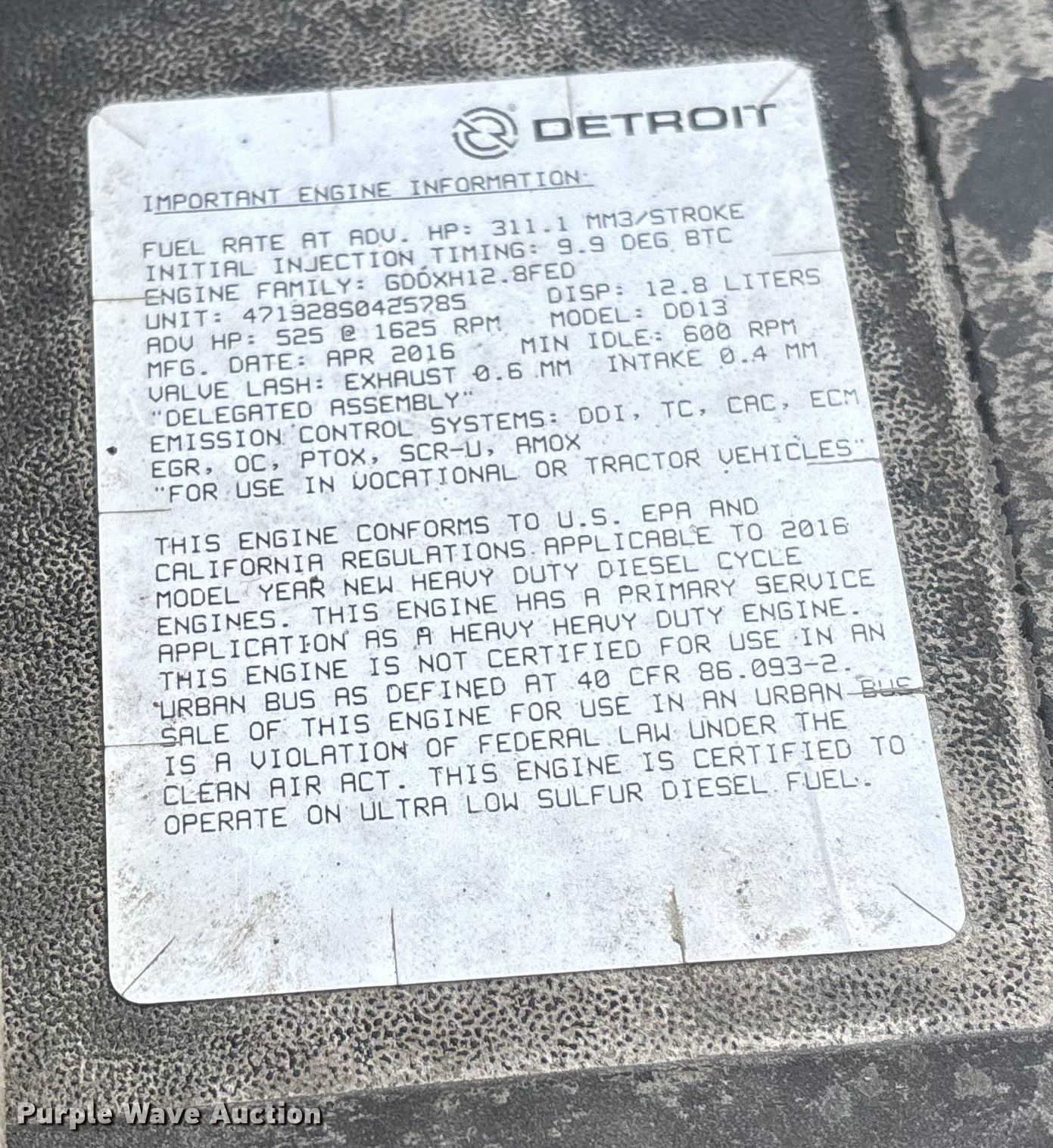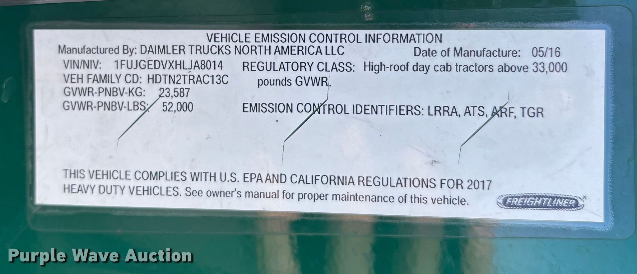 2017 Freightliner Cascadia 125 semi truck. Miles: 707,120 on odometer, Hours: 19,310 on meter, VIN: 1FUJGEDVXHLJA8014, Unit #: 1031. Engine Detroit Diesel DD13, Serial: 471928S0425785, Displacement: 12.8L, Cylinders: 6, Fuel type: Diesel, Engine brake. Transmission Detroit Diesel DT12-DB-1550, Automated manual. Chassis Axles: Tandem, Gear ratio: 2.41, Differential lock: Inter-axle, Suspension: Air Dump valves, Brakes: Air, GVWR: 52,000 lbs FAWR: 12,000 lbs, IAWR: 20,000 lbs, RAWR: 20,000 lbs, Wheelbase: 174". Interior AC, Heat, Heated mirrors, Power windows, Cruise control, Air ride cab, Brake controller. Features Deck plate: Aluminum, Fifth wheel type: Fixed, Fuel tank: Dual. Tires Size: 295/75R22.5. Notes Dash warning indicator: Check engine, Jump start required during on-site data collection, Engine issues, loss of power. Indiana title. Title distribution may be delayed up to 30 days from verification of funds. Standard Forwarding, LLC Strategic Fleet Realignment Sale - Open inspection April 20 from 9:00 a.m. to 3:00 p.m.. 2925 Morton Drive. East Moline, IL 61244