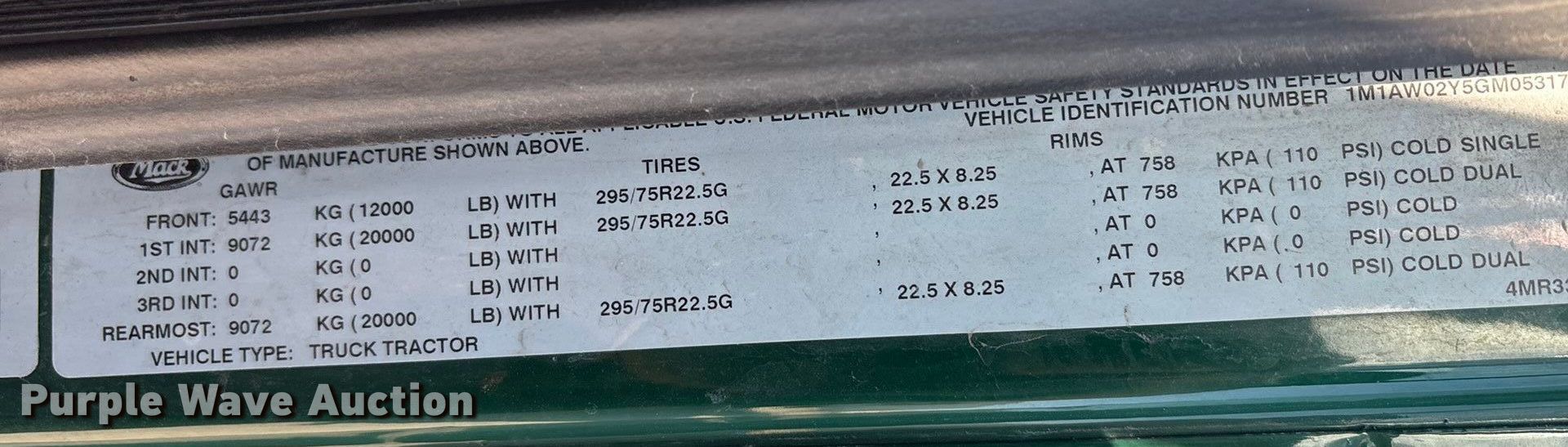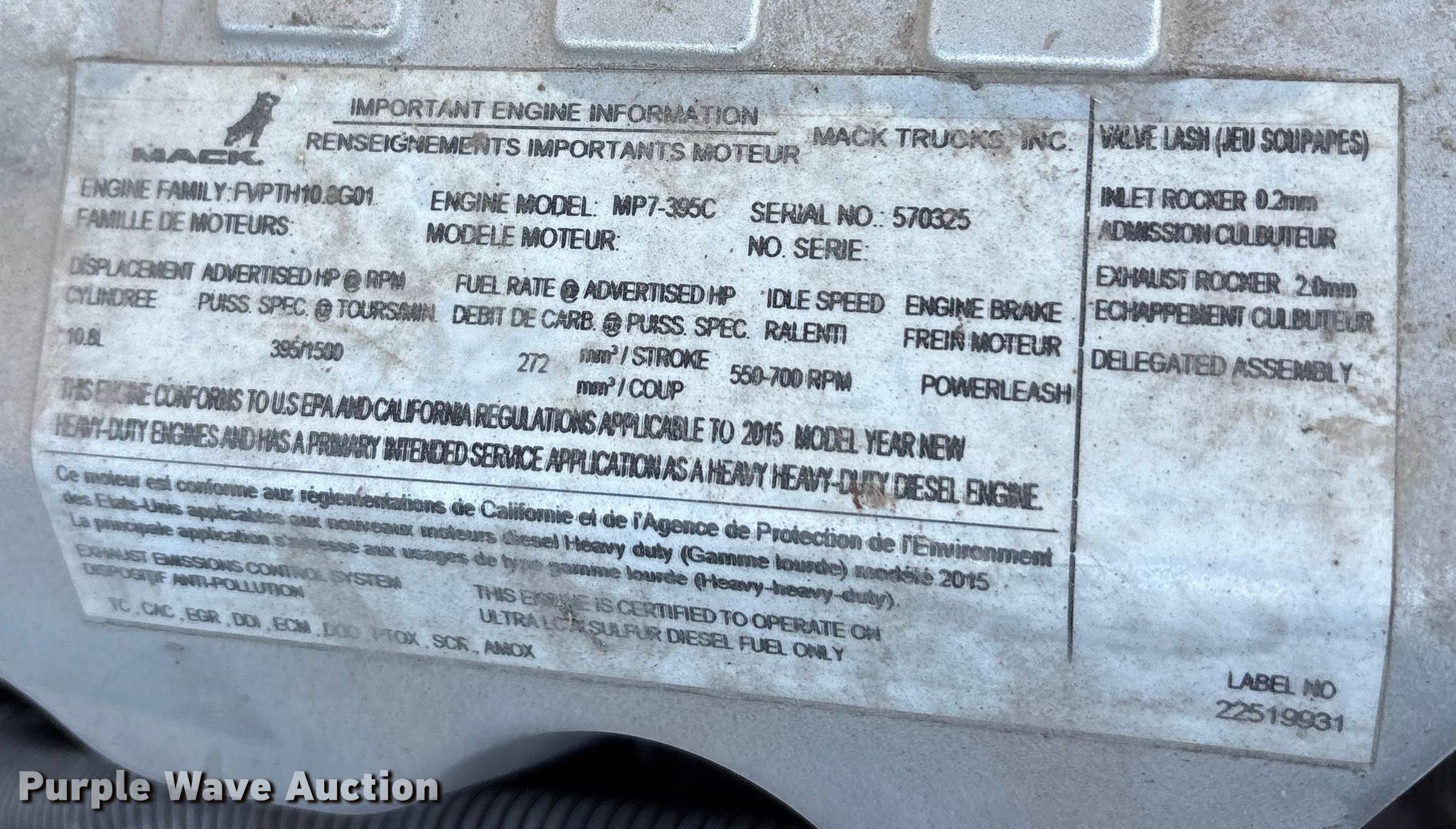 2016 Mack CXU613 semi truck. Miles: 404,858 on odometer, VIN: 1M1AW02Y5GM053172, Unit #: 738. Engine Mack MP7-359C, Displacement: 10.8L, Cylinders: 6, Fuel type: Diesel, HP: 335, Engine brake. Transmission Mack MDrive, Automated manual. Chassis Axles: Tandem, Differential lock: Inter-axle, Suspension: Air Dump valves, Brakes: Air, GVWR: 52,000 lbs FAWR: 12,000 lbs, IAWR: 20,000 lbs, RAWR: 20,000 lbs. Interior AC, Heat, Heated mirrors, Cruise control, Air ride cab. Features Deck plate: Aluminum, Fifth wheel type: Fixed, Fuel tank: Dual. Tires Size: 295/75R22.5. Notes Dash warning indicator: Check engine, Jump start required during on-site data collection. Indiana title. Title distribution may be delayed up to 30 days from verification of funds. Standard Forwarding, LLC Strategic Fleet Realignment Sale - Open inspection April 20 from 9:00 a.m. to 3:00 p.m.. 2925 Morton Drive. East Moline, IL 61244