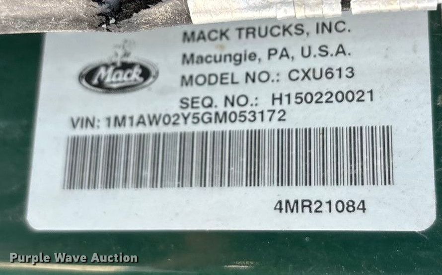 Take a look at this used 2016 Mack CXU613 semi truck being sold on April 21st, 2026 in the Tuesday April 21 Standard Forwarding LLC Strategic Fleet Realignment Auction made by Mack. Take a look at all of the item information below or take a look at similar auctions for Trucks.